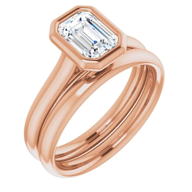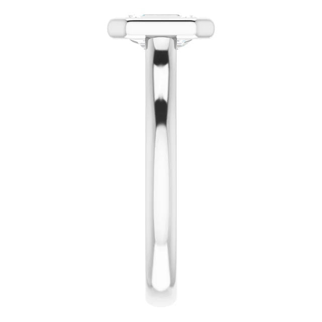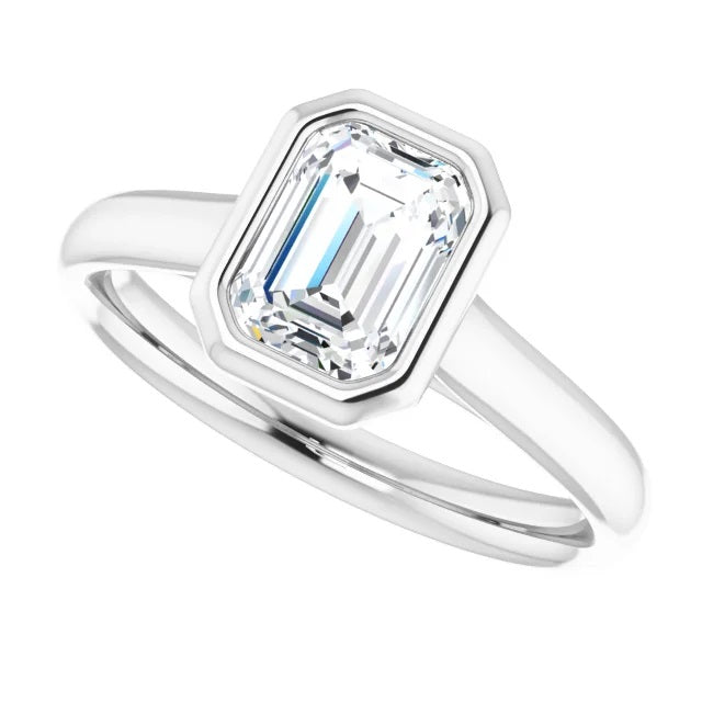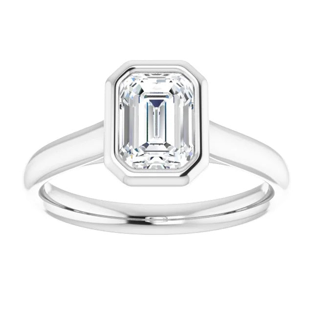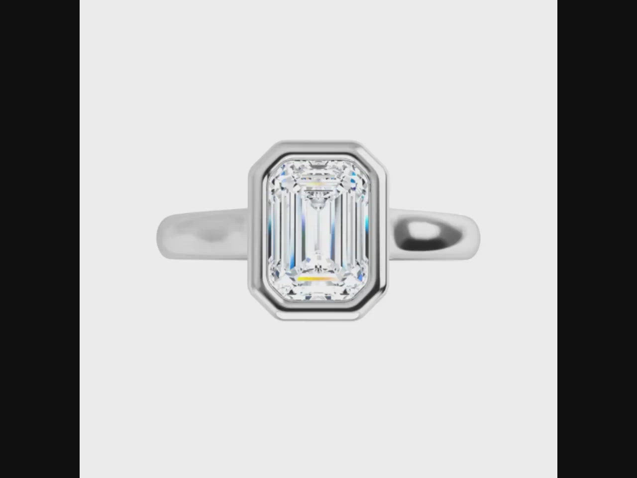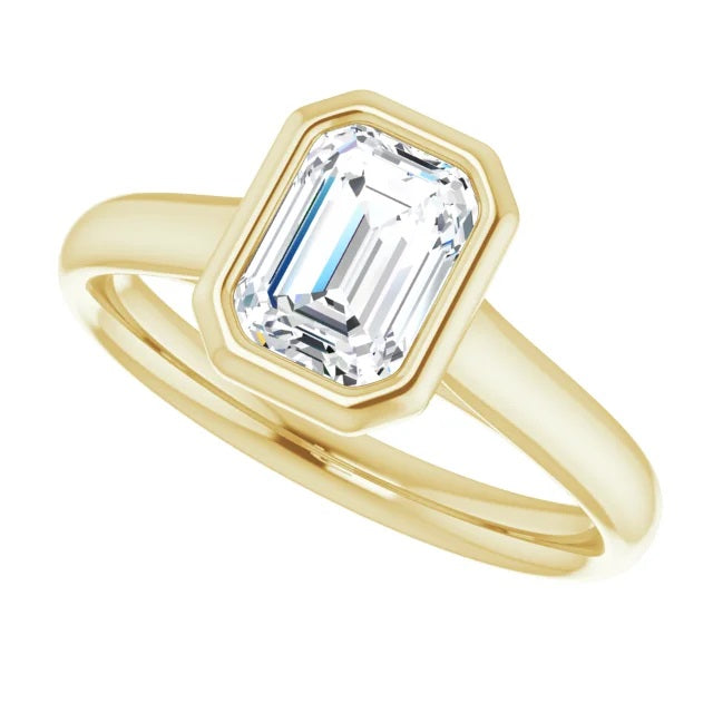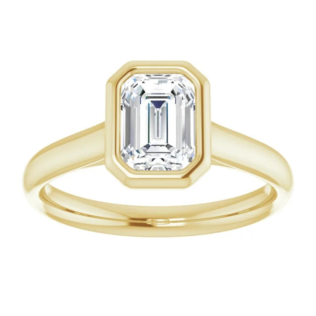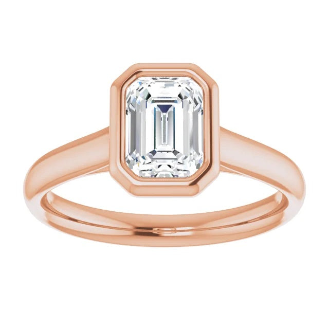 We used a 14k gold bezel setting style in your choice of white, yellow or rose gold. The bezel setting protects the corners of your diamond and it also adds a modern feel to the ring, with it's clean and sleek lines. The radiant cut is actually more brilliant than the standard emerald cut. We prefer cutting Radiant cuts over emerald for this reason. People use Radiant & emerald interchangeably.