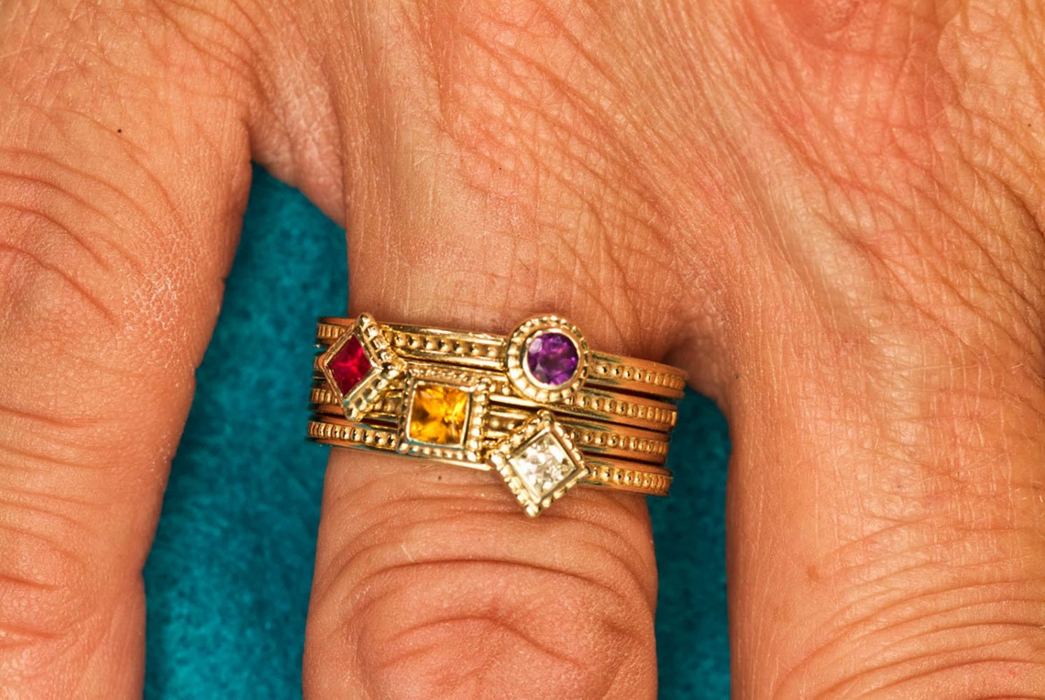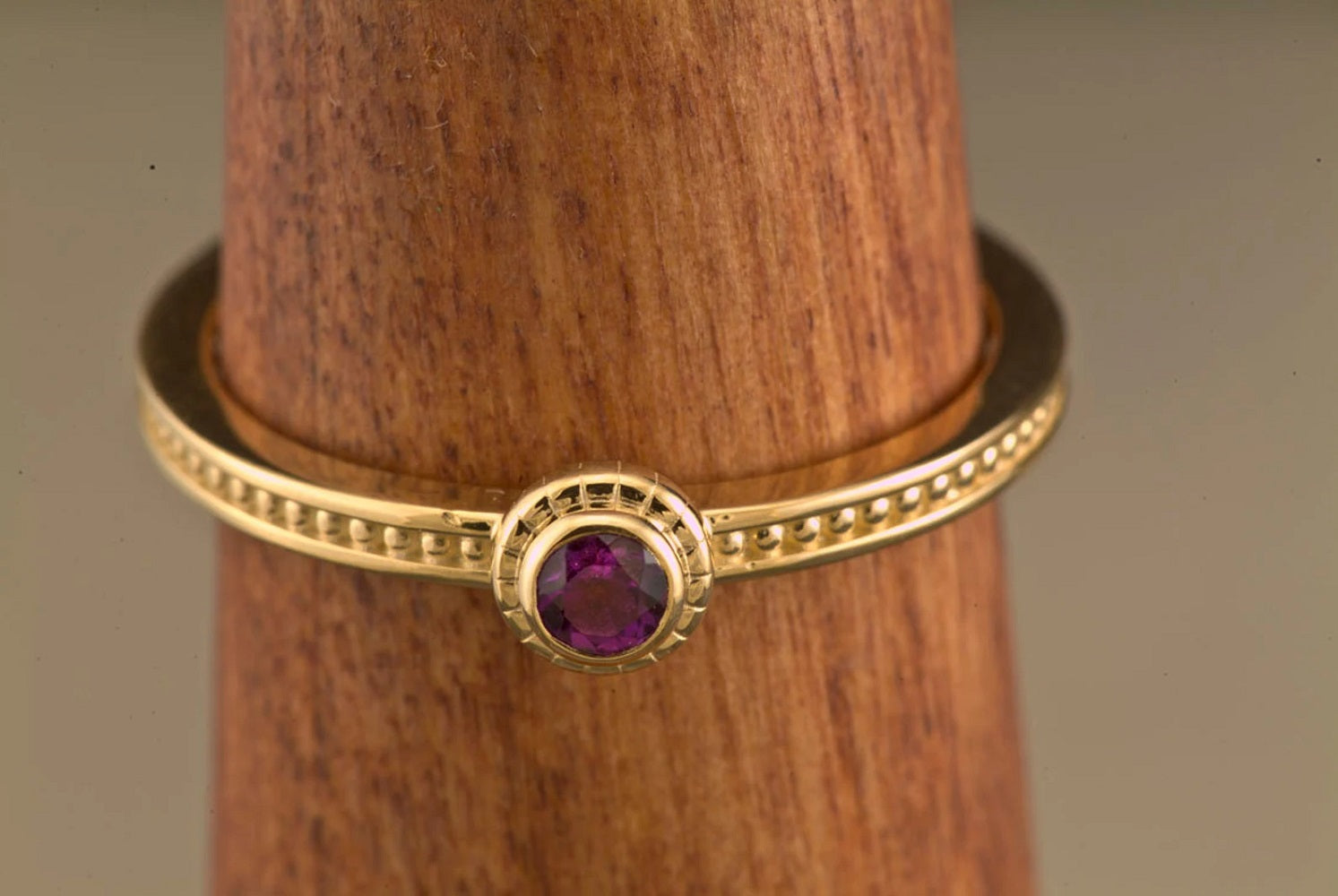 Etruscan Design Amethyst stacking ring in 14k gold is the February birthstone. Our stacking rings are beautifully detailed with gold bead-work! They are dainty & minimalist style, which are perfect for stacking! This is a very versatile design that can also be worn as a Promise ring or gemstone engagement ring. They are available in a 3MM round, 2.5MM square, which is set on a diagonal and a 3MM square gemstone size. I love the rich color of the yellow gold, which reminds me of the 22kt gold jewelry I have seen in Asia. The fully faceted gemstones are priced by the stone variety and quality.