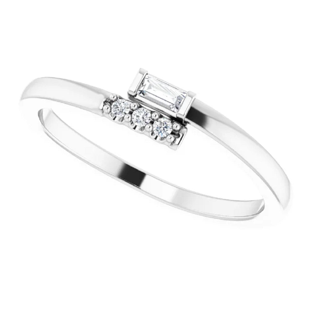 Our 14k gold baguette diamond ring is a modern diamond ring style, which is versatile and can be worn as an engagement ring, diamond wedding band or fashion statement ring. We are offering 14k yellow or white gold made in the bypass ring design. Our simple diamond ring is minimalist in design and is a classic style that is evergreen.