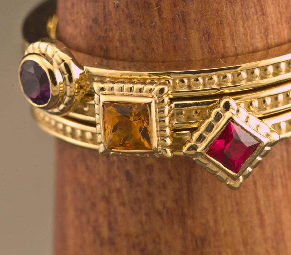 Etruscan Design, 14k gold ring featuring Golden Citrine, which is the November birthstone. Our gold stacking rings are beautifully detailed with delicate bead-work! These dainty & minimalist rings, while perfect for stacking also make a nice stand alone ring. Whether worn as a Promise ring or engagement ring they are different and you will receive many compliments! They are available in a 3MM round, 2.5MM square, which is set on a diagonal and a 3MM square gemstone size. I love the rich color of the yellow gold, which reminds me of the 22kt gold jewelry I have seen in Asia. The fully faceted gemstones are priced by the stone variety and quality.