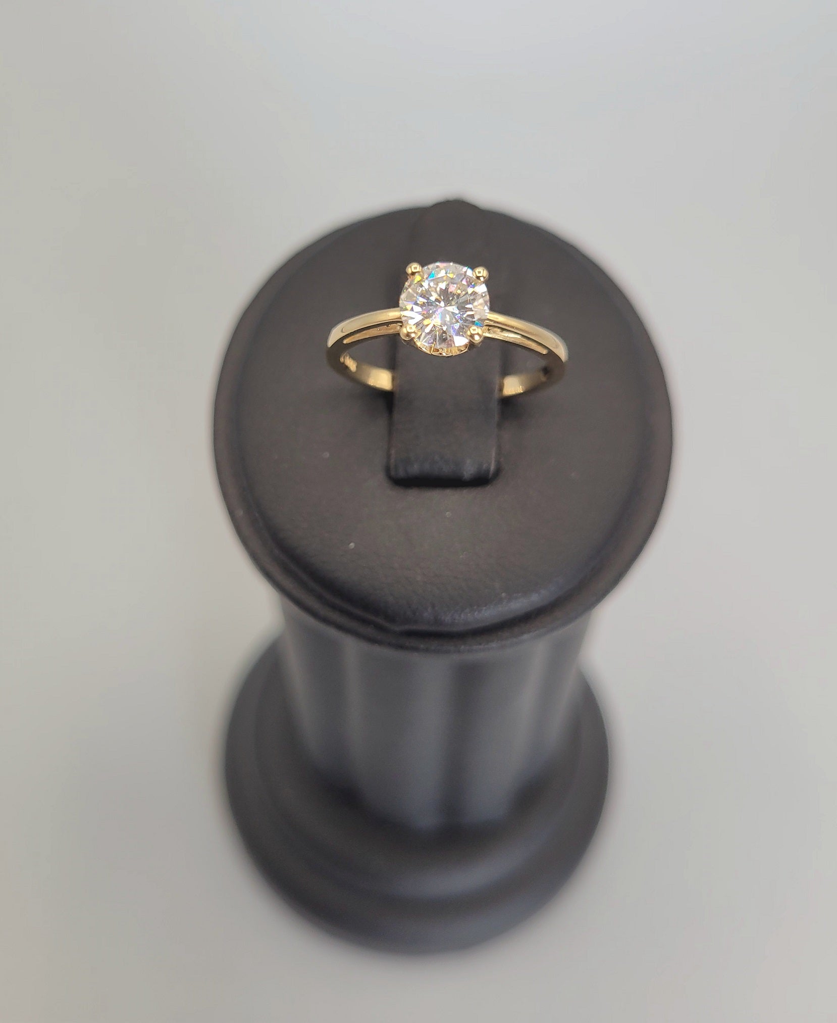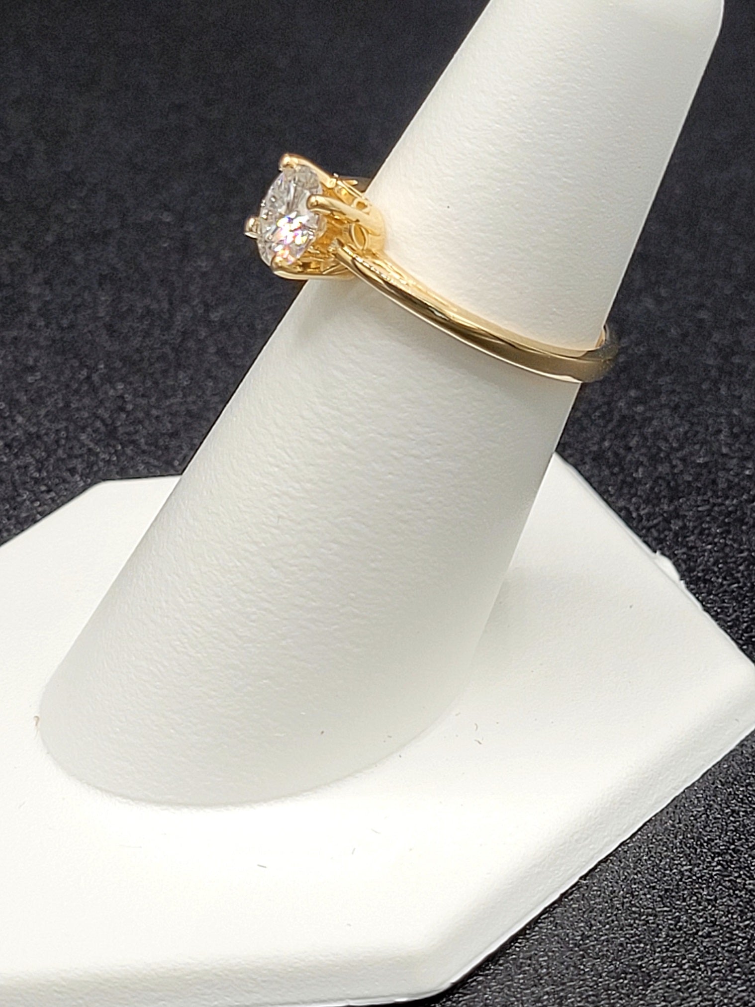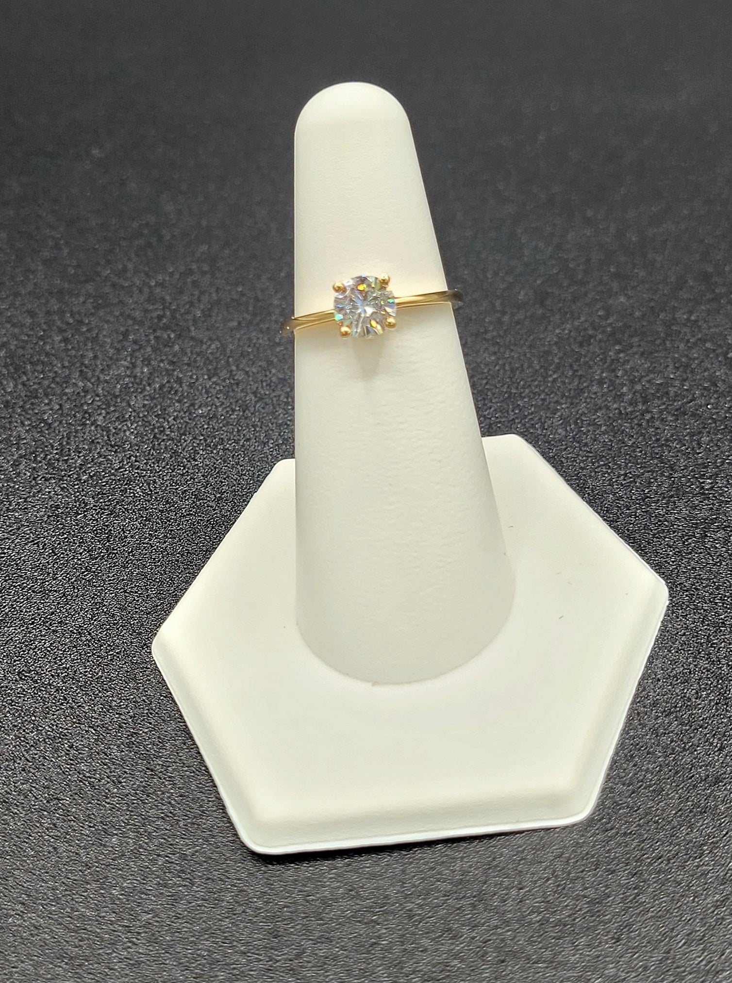 Our 14k gold engagement ring features a 6mm Round Forever One Moissanite Gemstone. Our Moissanite engagement ring is available in your choice of white, yellow or rose gold. The solitaire engagement ring style is a classic, which is evergreen and never goes out of style! This stone is so very brilliant that it blinded my lens and was extremely difficult to photograph.
