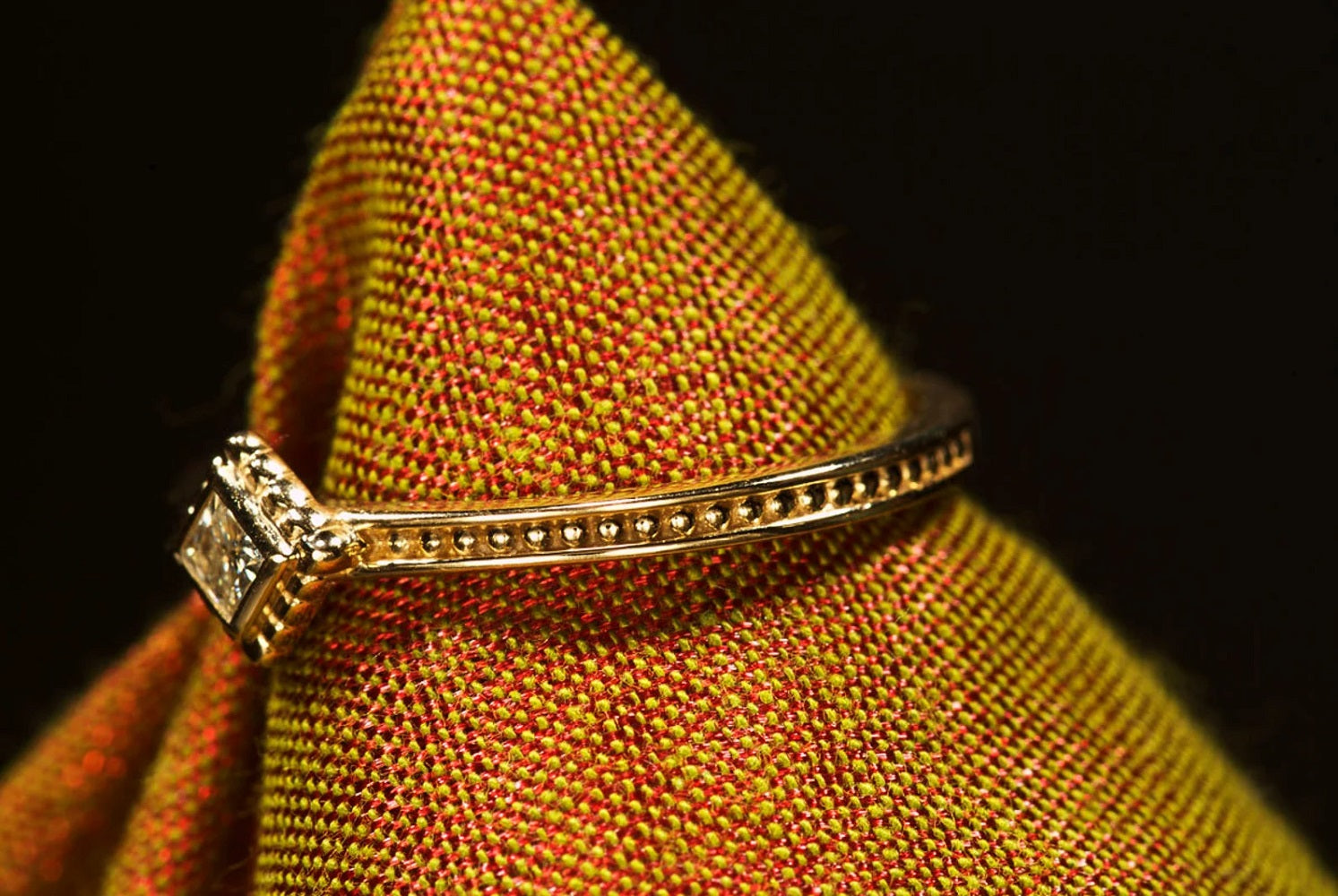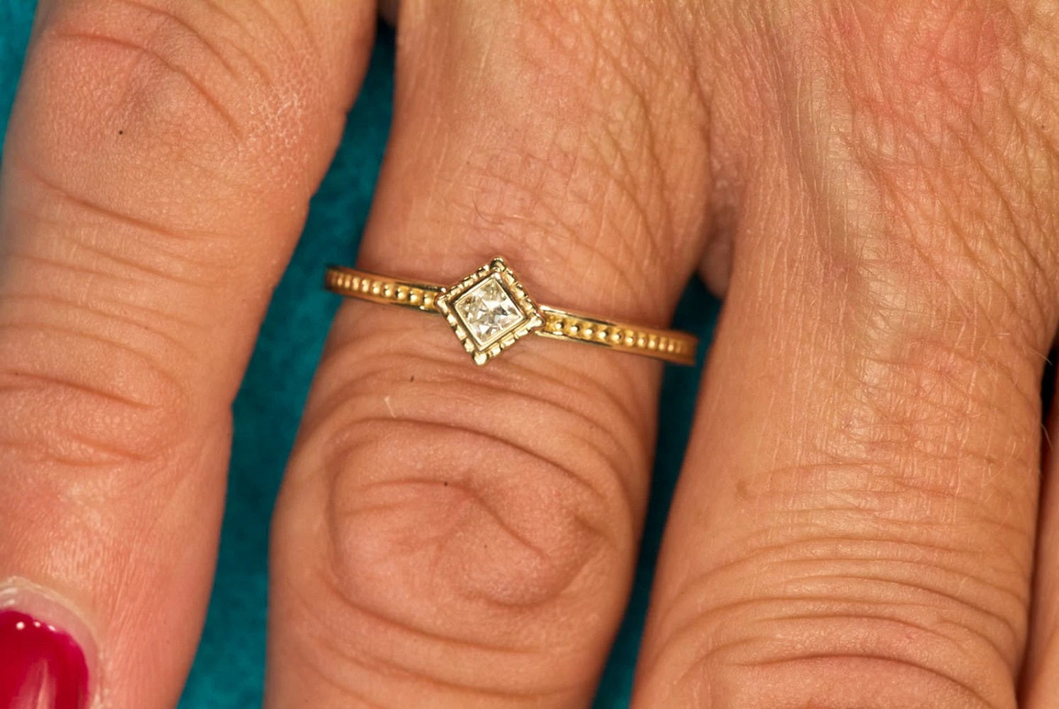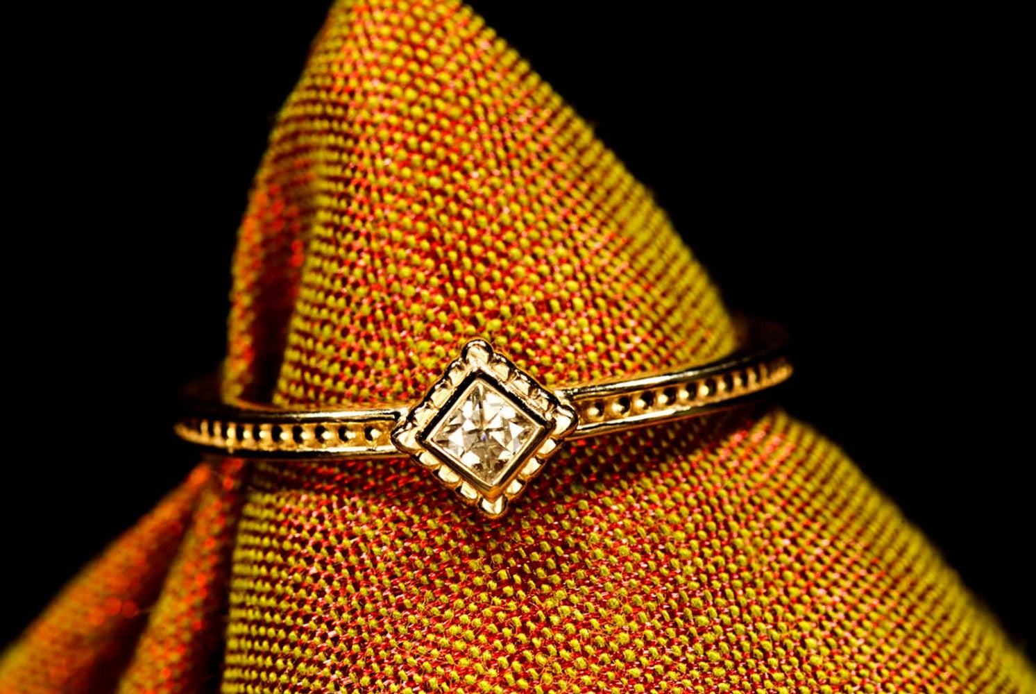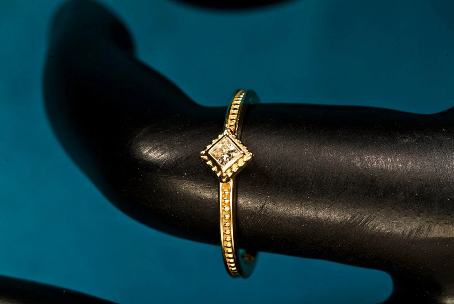 Our 14k Gold Moissanite ring features Etruscan jewelry design. Our gold birthstone rings & stacking rings are beautifully detailed with gold granulation or bead-work! This dainty ring is designed to stack together and has enough presence as a stand-alone ring. The versatile design can be used as a engagement ring, promise ring, everyday ring or birthstone ring. Featured ring is a 2.5mm square/Princess cut, Forever Brilliant, Charles & Colvard Moissanite, which comes with a certificate of authenticity & a Lifetime Warranty when you register your stone on their website.