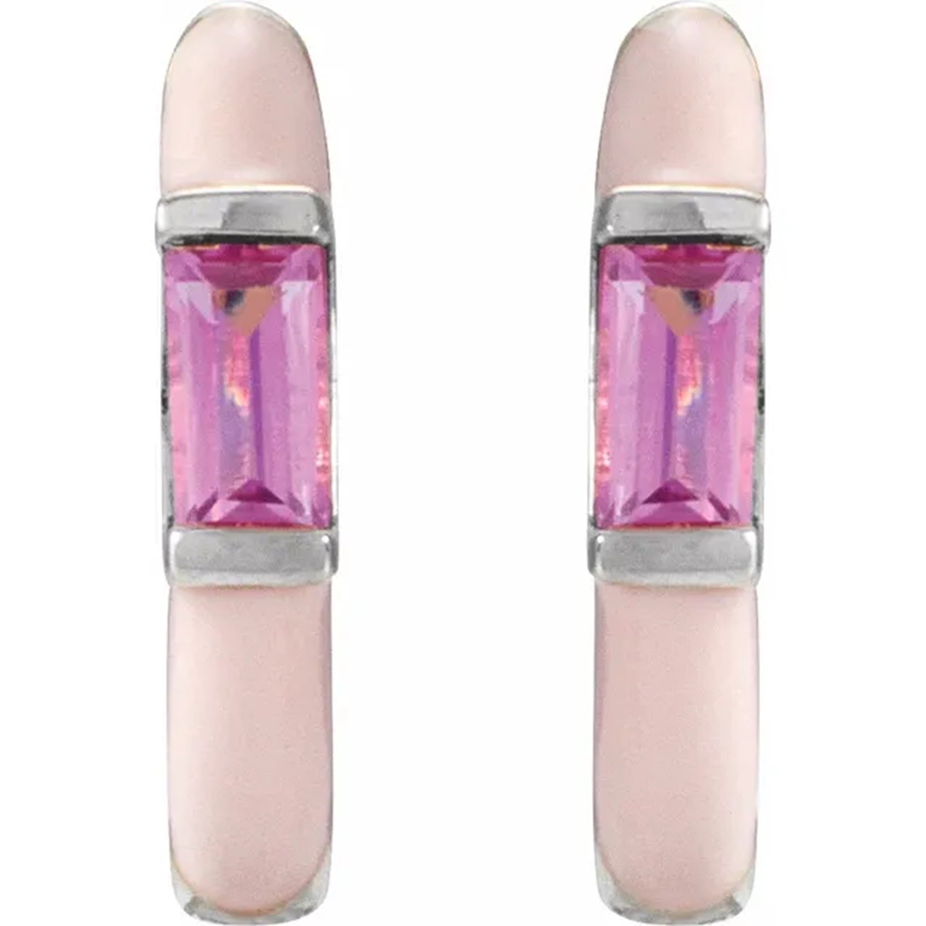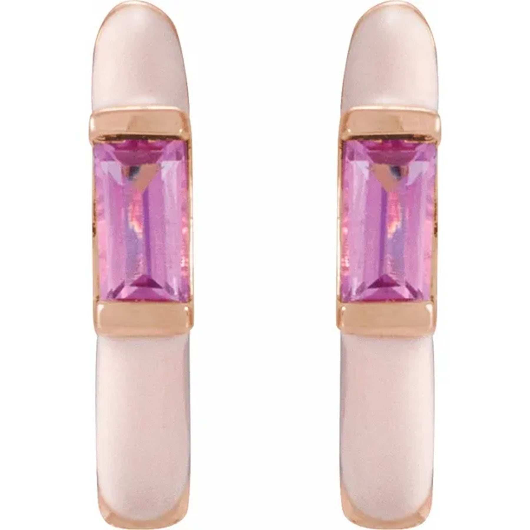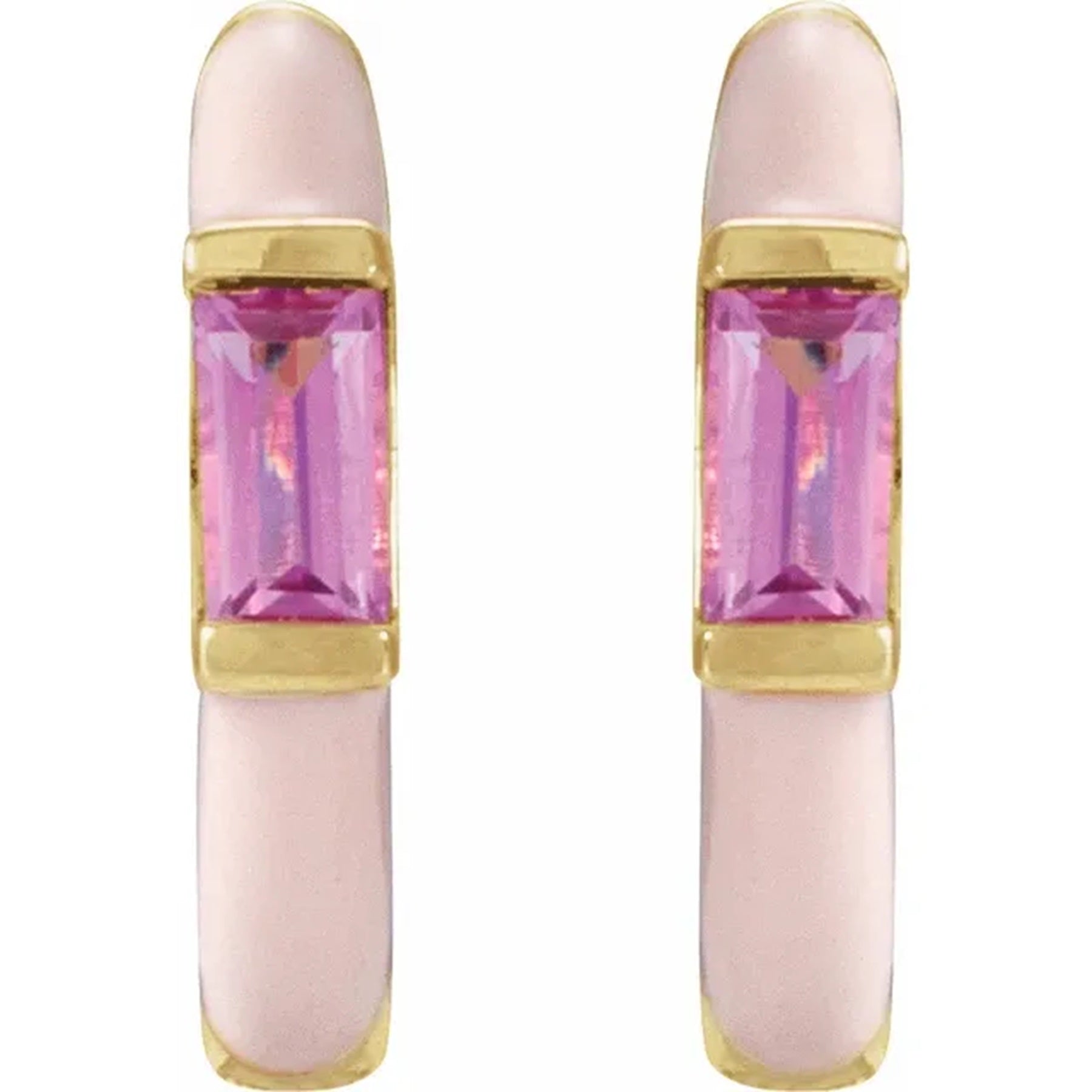 14k gold Pink enamel Hoop earrings, feature a natural pink tourmaline baguette gemstone bezel set and bordered in the gold color of your choice. Pink tourmaline is the birthstone earring for October, making them the perfect birthday gift for someone special!