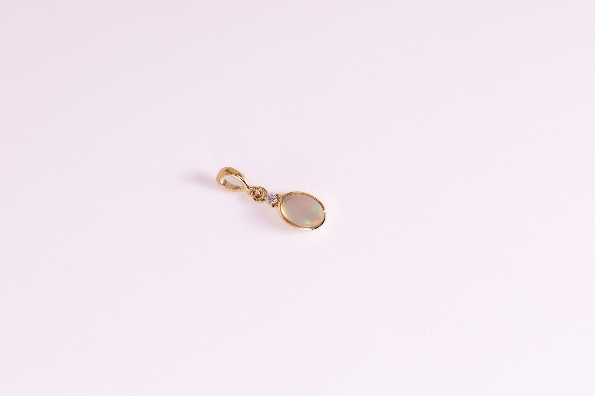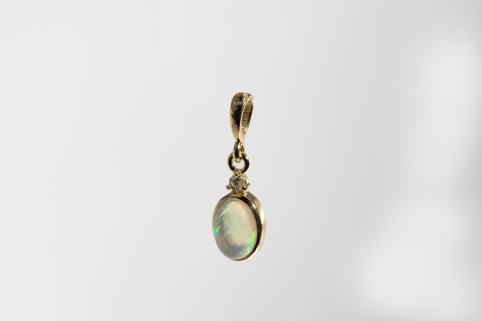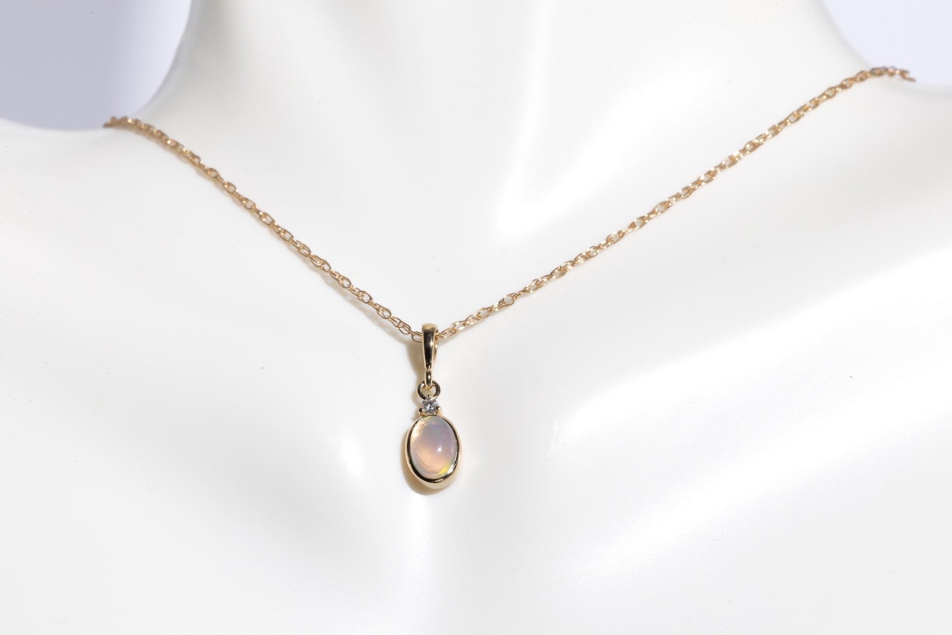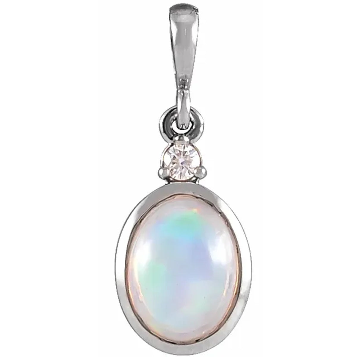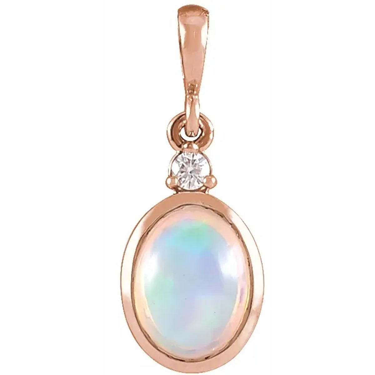 6 x 4 Natural Ethiopian opal & diamond pendant set in 14k in your choice of yellow gold, white gold or rose gold and sterling silver. The oval opal is a cabochon cut and is bezel set for a modern clean look and to prevent catching on hair or clothing as prongs tend to do. This natural stone displays nice color saturation.