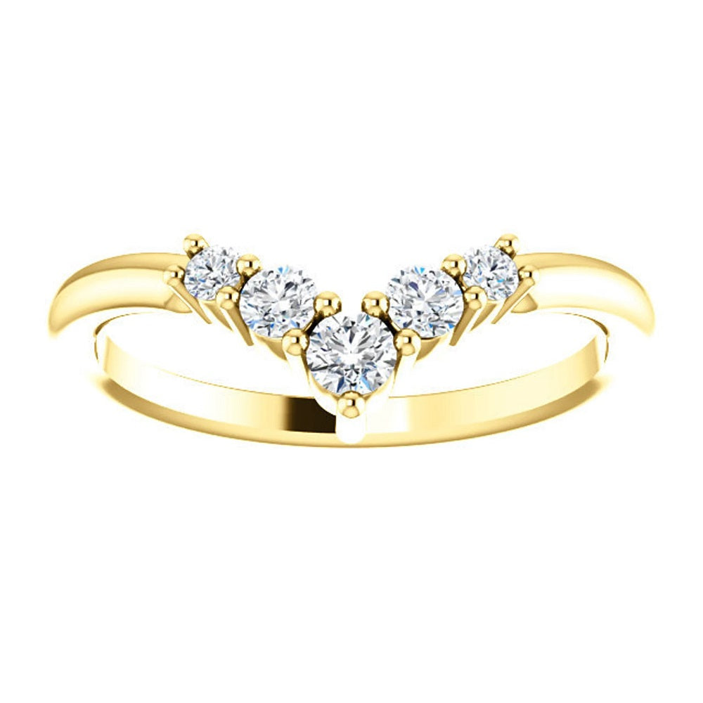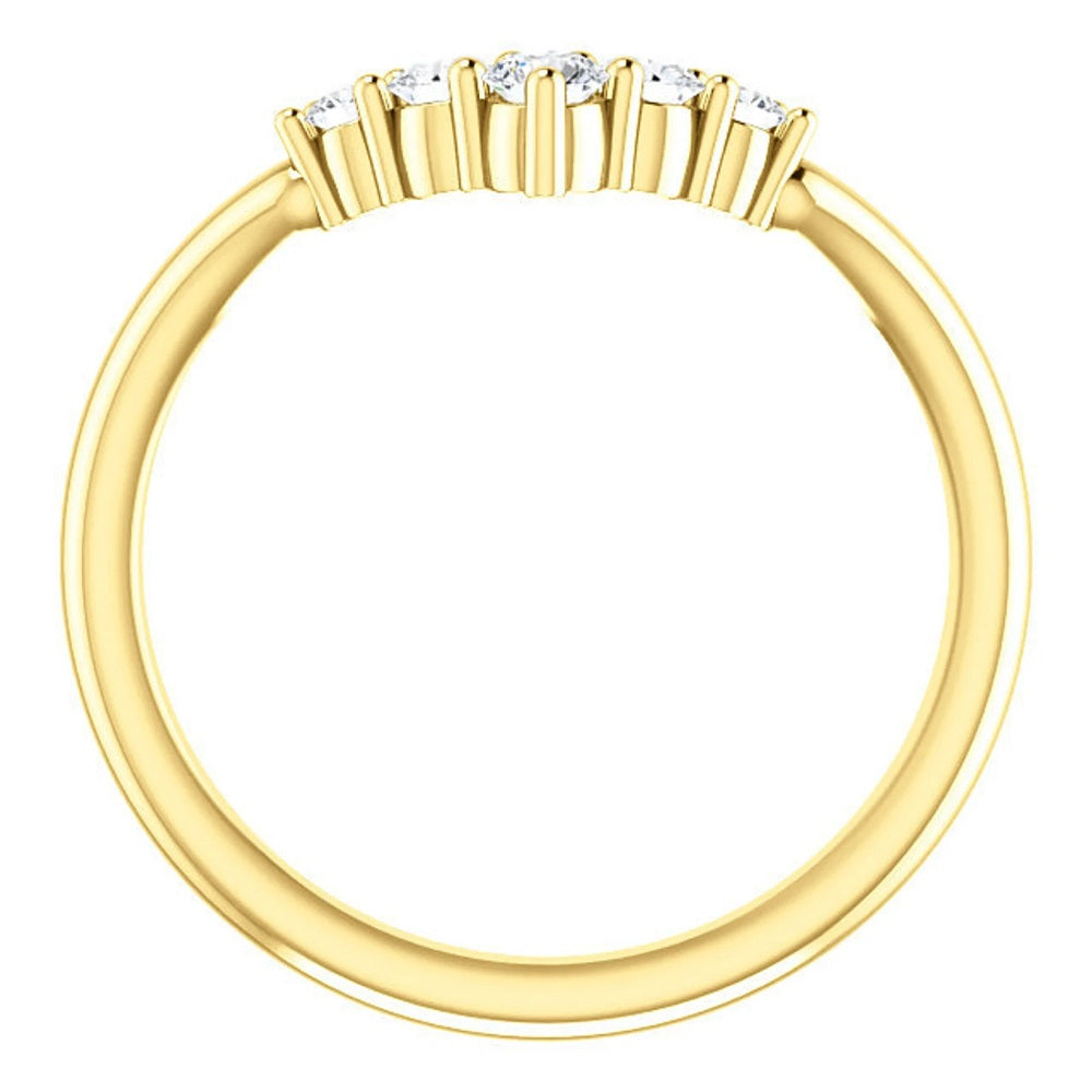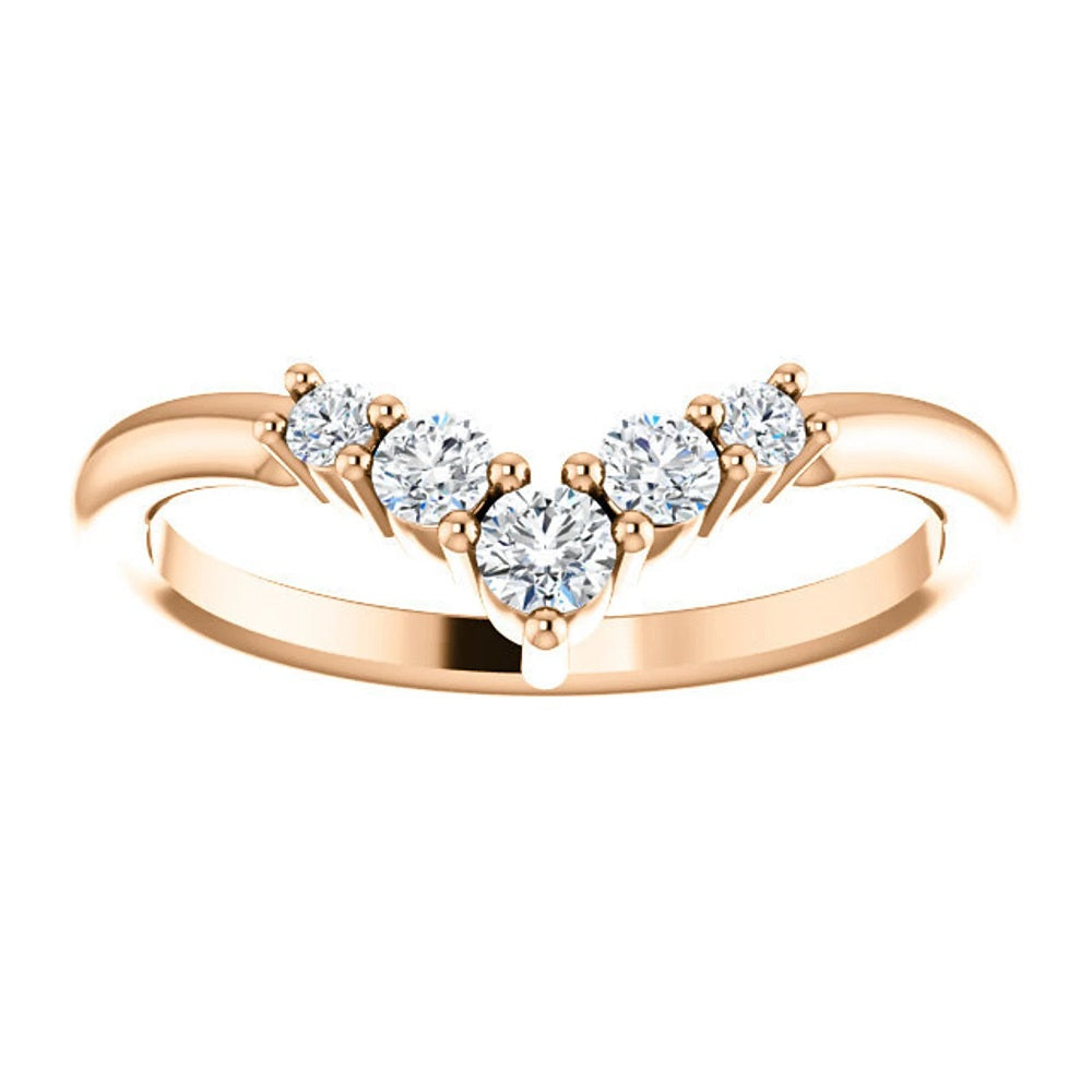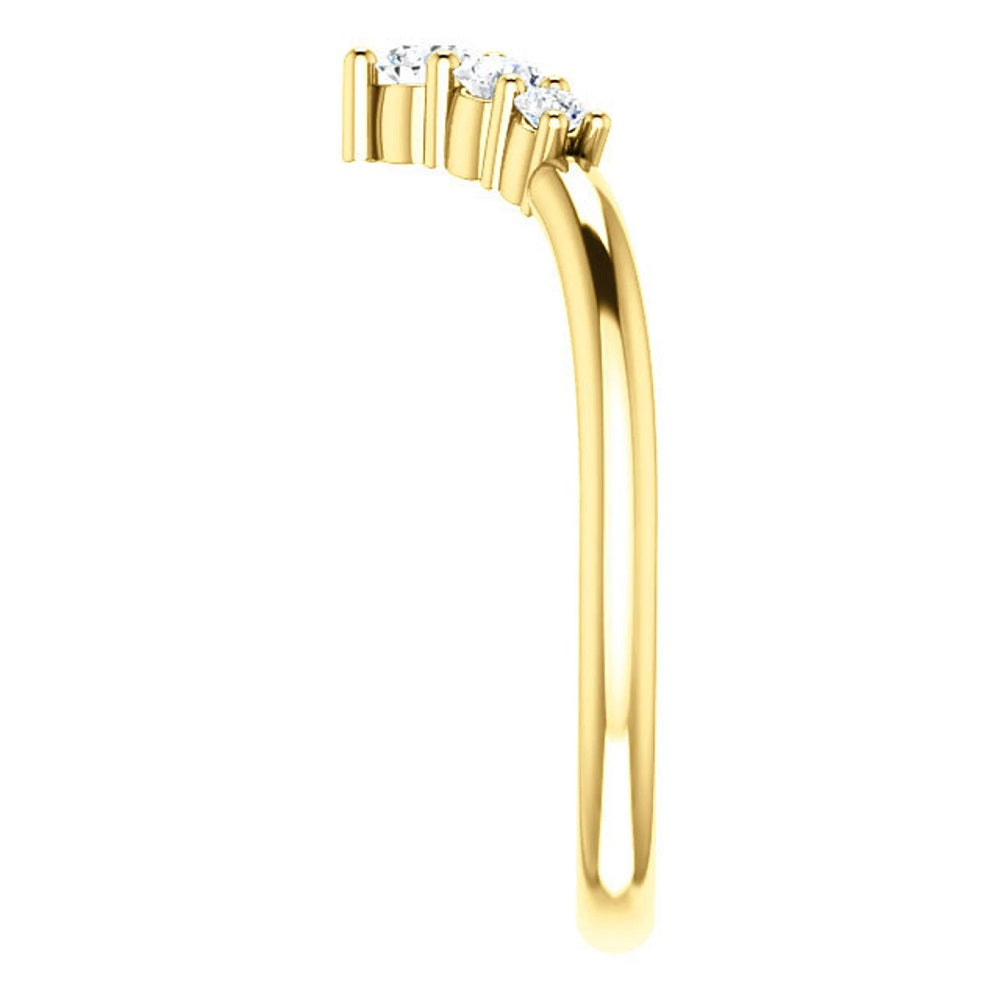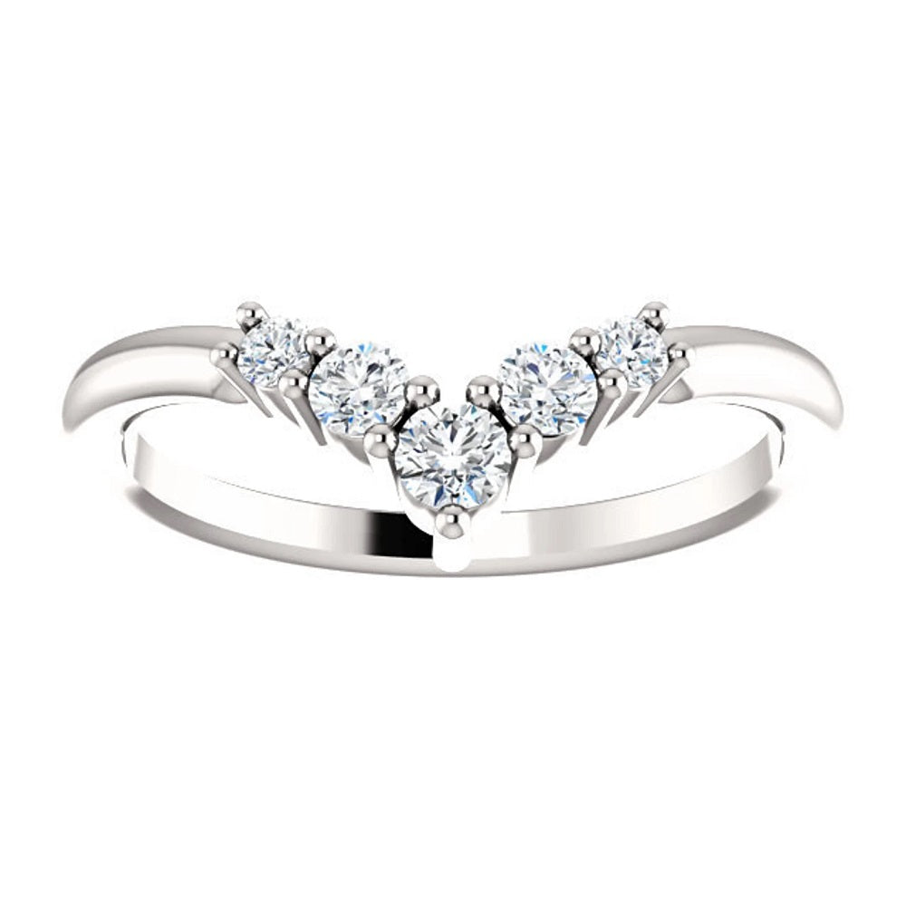 5 natural white sapphires form a V design for a simple, unique and very modern design. Our curved band is also great for a stacking ring. or layering with other rings. This would also make a very pretty wedding band and is a great alternative to the more expensive diamonds.