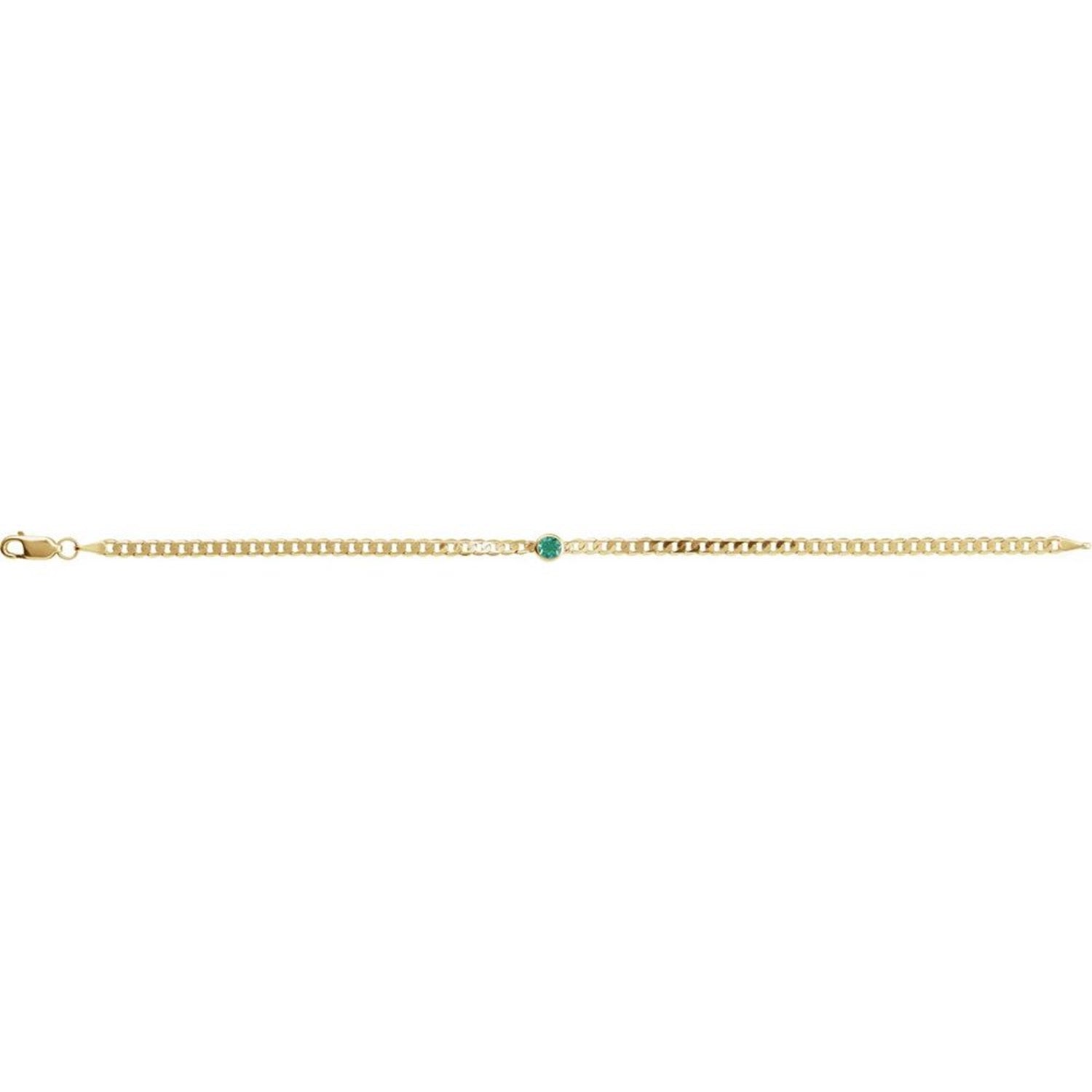14K Yellow Emerald Curb Link 7" Bracelet is finished with a lobster claw clasp. The 4mm round emerald is bezel set for a clean modern look, which will not get caught on hair or clothing as a prong setting has tendencies to do. The style is minimalist, sleek and modern. this is beautiful on it's own, but can be stacked with other bracelets you may already have. Emerald is the May birthstone and will make an extra special gift for anyone born in May.