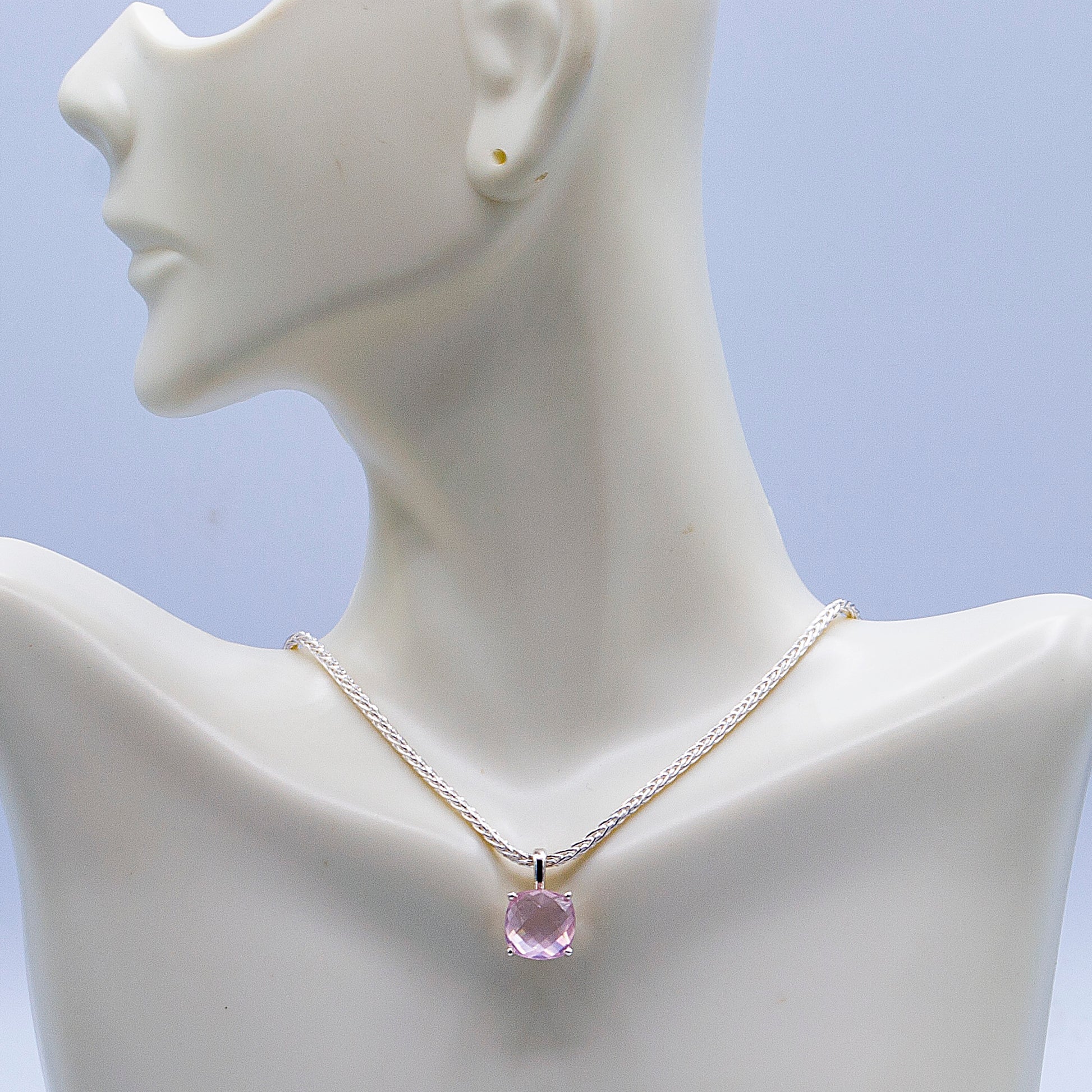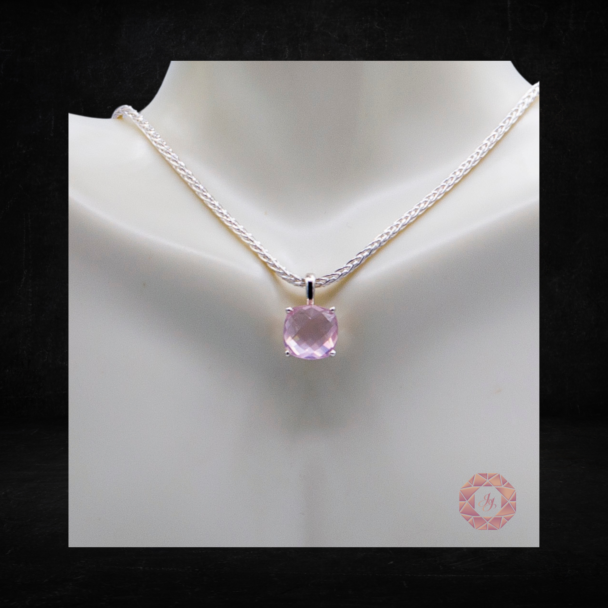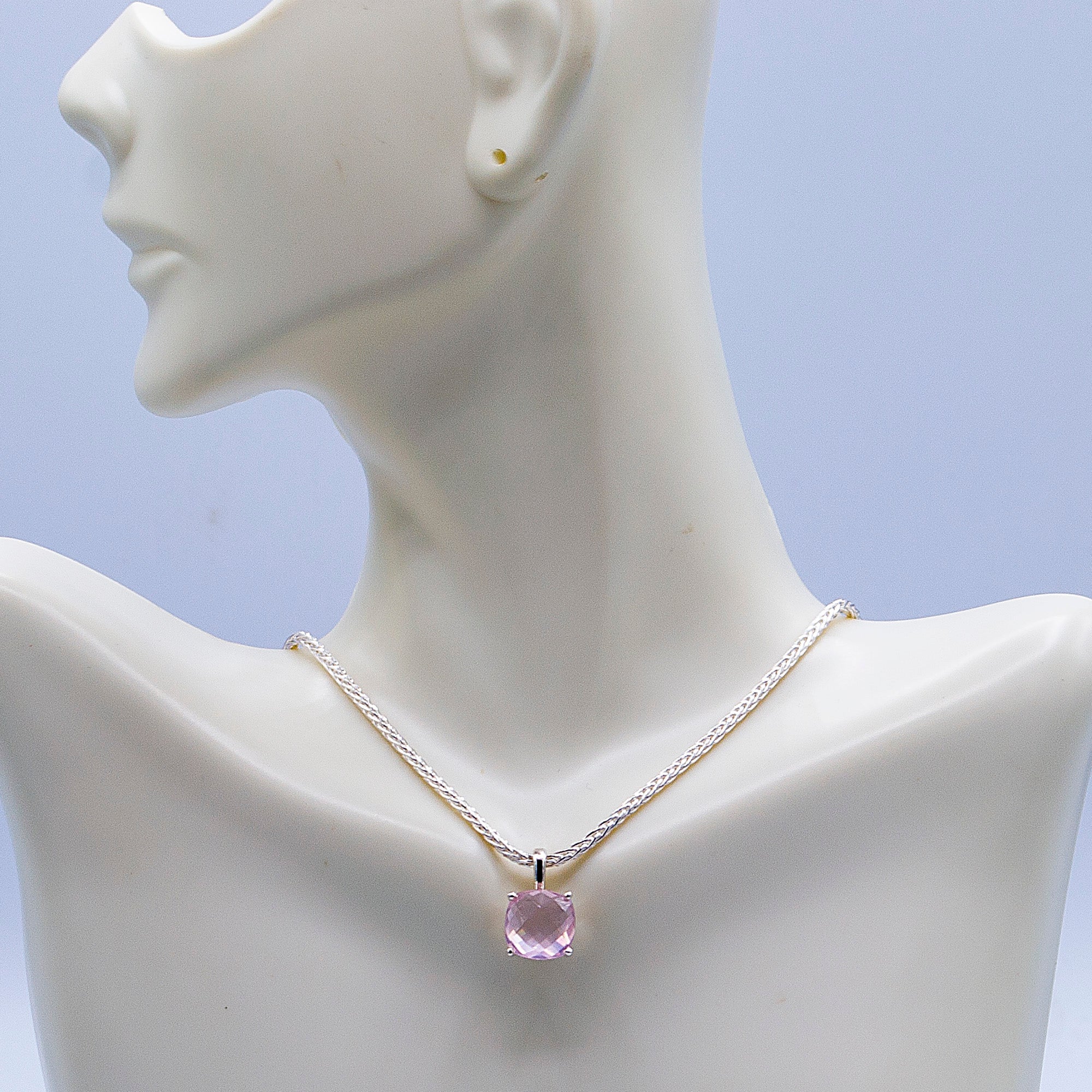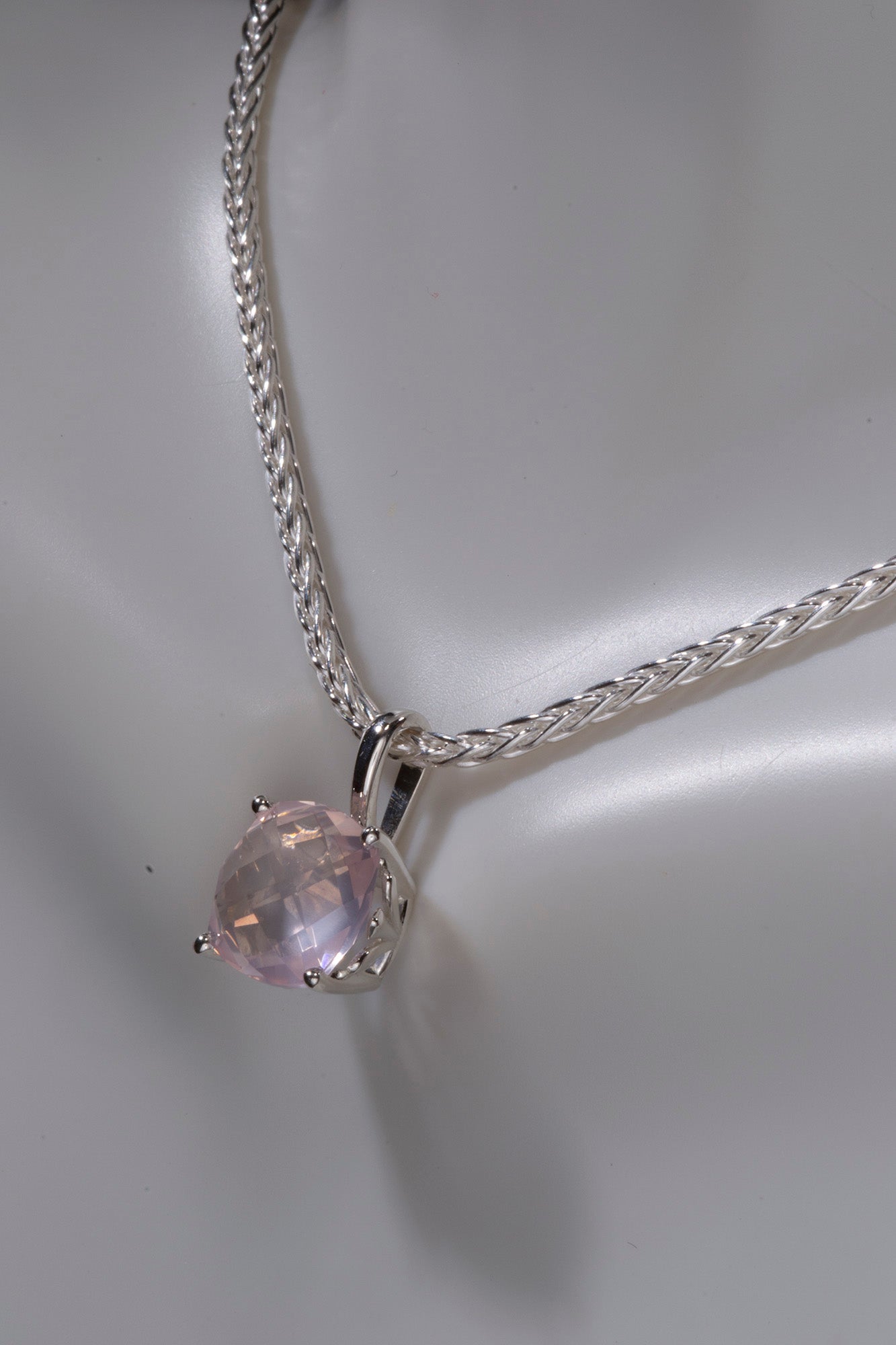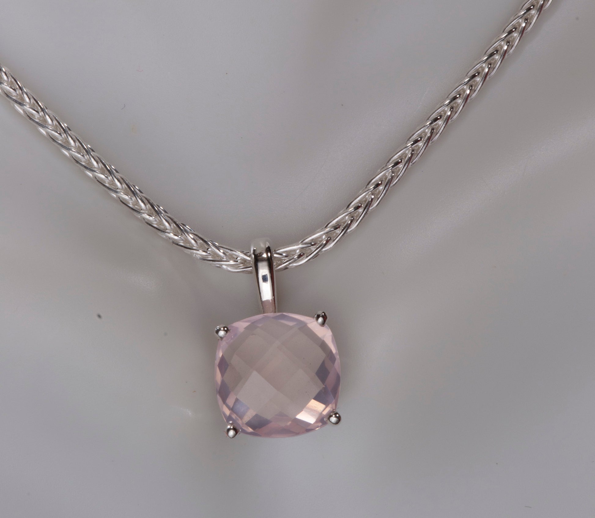 Our Rose Quartz necklace and Rose quartz pendant features an Antique Square Double-sided Checkerboard cut AA Rose Quartz gemstone. This is a large Rose quartz, weighing 4.11 carats. The perfect birth stone necklace! Rose Quartz jewelry is an alternate January birthstone and a meaningful gift for those born in January. It is also the 5th wedding anniversary stone, making it the perfect gift for wife or partner! Our silver birthstone necklace is crafter using recycled silver.