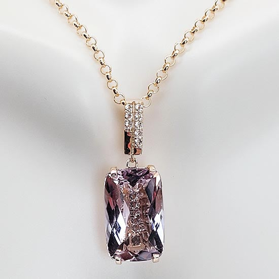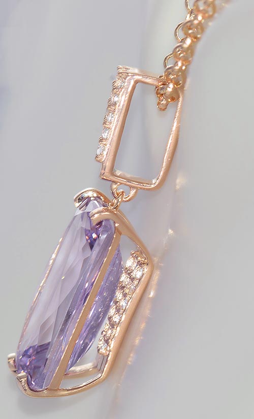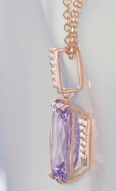 6.8 Carat Pink Amethyst Necklace is part of our Tranparenza collection. Transparenza is Spanish for transparent. A very striking and feminine necklace with a soothing color! 18K Rose Gold Vermeil necklace in a specialty cut is beautifully detailed with a pave of white topaz accent stones on the bail and gold bars underneath the amethyst that also have white topaz accent stones that can be seen through the amethyst center. 18K Rose Gold Vermeil over 925 Silver - 3.6 grs Chain length: 18 inches Pendant drop length: 1 inch Pendant width: .50 inches |