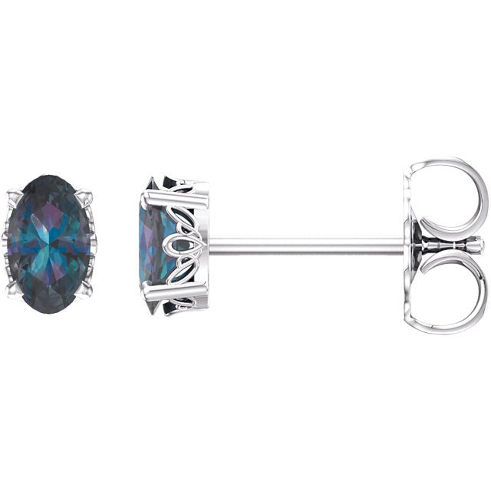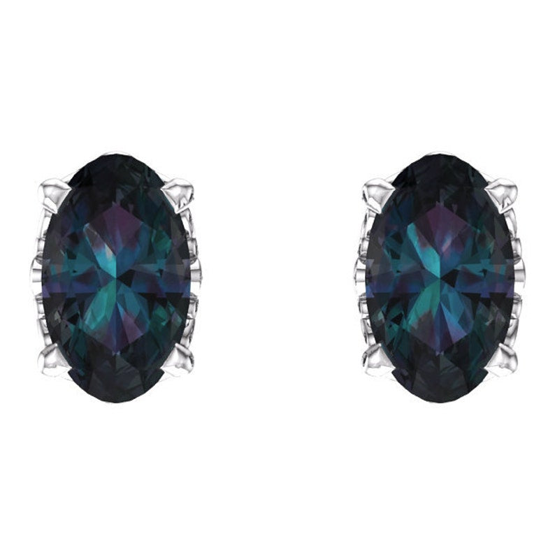 Our Alexandrite 14k gold earrings feature an oval faceted Chatham GEM Grade Alexandrite gemstone. The studs earrings have a pretty open scroll work around the setting and are very feminine and dainty. Alexandrite is a color change gemstone, changing from purple to greenish-blue. Our real gold earrings are a very meaningful gift for anyone born in June as Alexandrite is the June Birthstone. These dainty earrings style is Art Nouveau, known for the scroll work and intricate designs. I think the size is just right, being not too big to pull on your ear and not too small that they would not be noticeable. Very pretty and feminine design. The last picture is for illustration of the color change. The gemstones change from a teal color to a purple color. We used a medium weight friction or butterfly style ear back.
