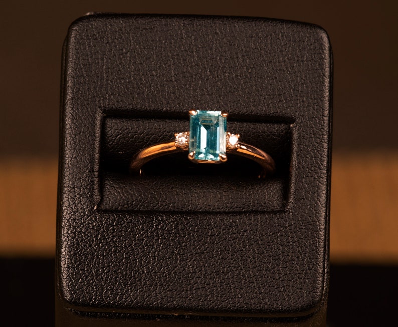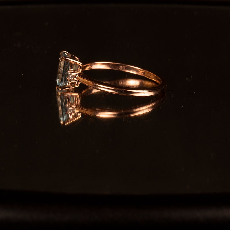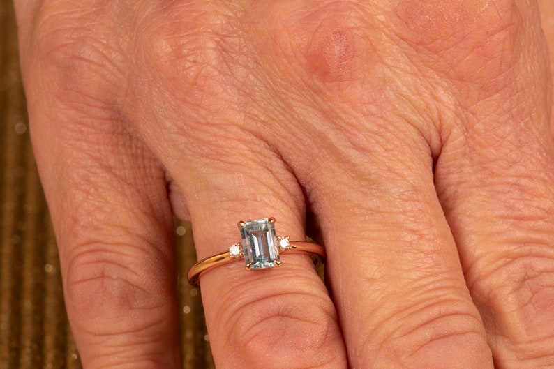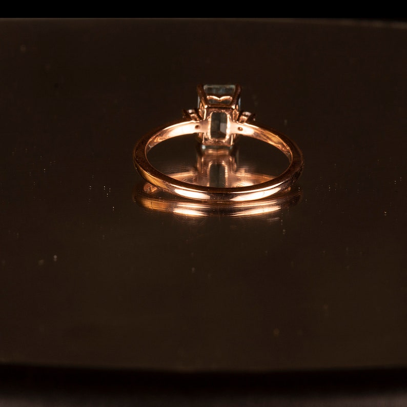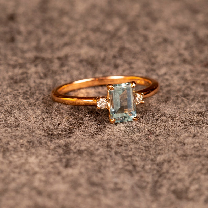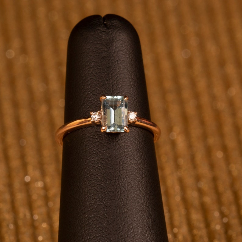 Aquamarine ring is a 14k gold ring, available in rose, white or yellow gold. Emerald cut engagement ring would make a very unique engagement ring. Our gemstone ring is a custom ring in the three stone style. We are using a 4 prong basket style head, which lets in lots of light to the stone. A beautiful birthstone ring, promise ring or girlfriend gift! We are accenting the Aquamarine gemstone with 2) round brilliant cut 1.90mm lab grown diamonds.