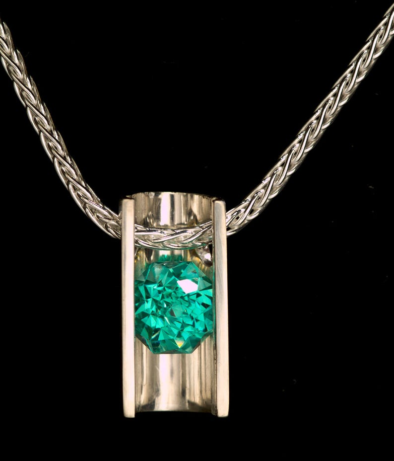 | Wow! Gorgeous blue-green color in our 8mm Rose Petal Cut Tourmaline gemstone. This is AAA Grade gemstone we hand-cut into our exclusive Rose Petal Cut, which maximizes the brilliance of any gemstone. This is a one-of-a-kind gemstone! We doubt we will come across this quality material again. We handmade the slider type pendant using Argentium fine silver, for its tarnish resistance. We set this beauty in a tension setting style, which gives the illusion of the stone being suspended as there are no prongs in the way. The inside of the setting is given a very high polish while the outside is given a brushed or satin finish. We included an 18-inch sterling silver wheat design chain that is 2mm wide and matches the silver color and texture of the brushed finish perfectly. The chain slides right through the pendant so no bale is required. This is a very clean, simple & modern setting and will certainly be the piece for anyone who is looking for something different & ready to ship! 2.52 carat weight, AAA Grade, Clarity: Eye clean, Treatment: Heat |