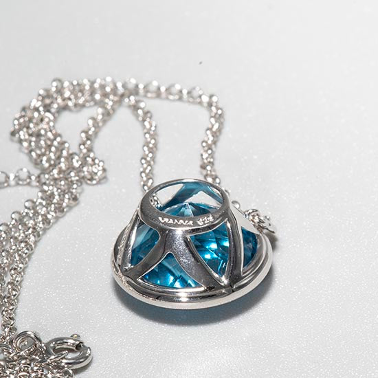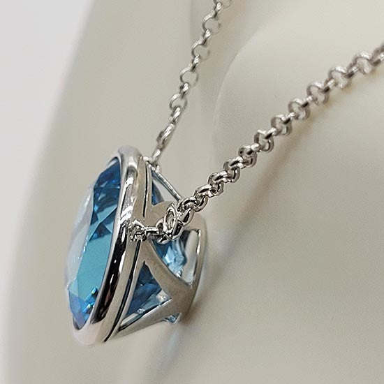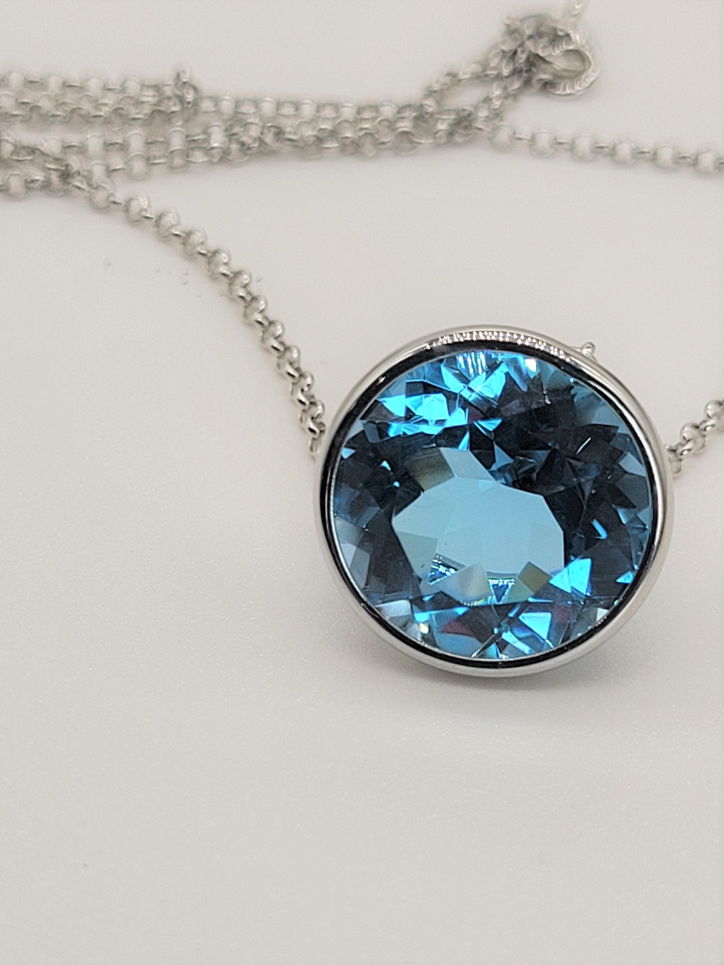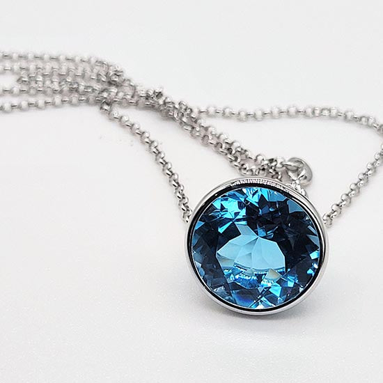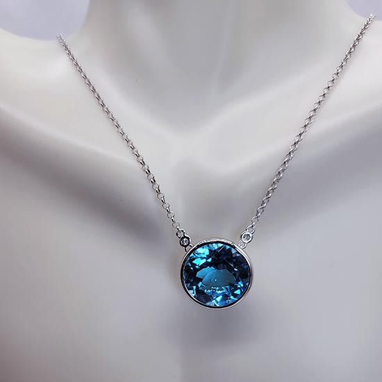 Wow, almost 14 carats of deep and intense blue topaz, in a specialty cut is sure to be noticed! Sterling silver solitaire necklace is a stunner whether worn alone or as part of a layering necklace collection, this statement necklace is breathtakingly beautiful! 20-inch chain is finished with a spring ring type closure. This beauty is not for the bashful! • Rhodium plated over 925 Silver - 3.7 grs • Special cut Swiss Blue Topaz • 15 mm round gemstone w/ 13.7 carats • 2 White Topaz round gemstones 1.0 mm diamond cut • Pendant diameter 5/8" • Necklace length 20 |