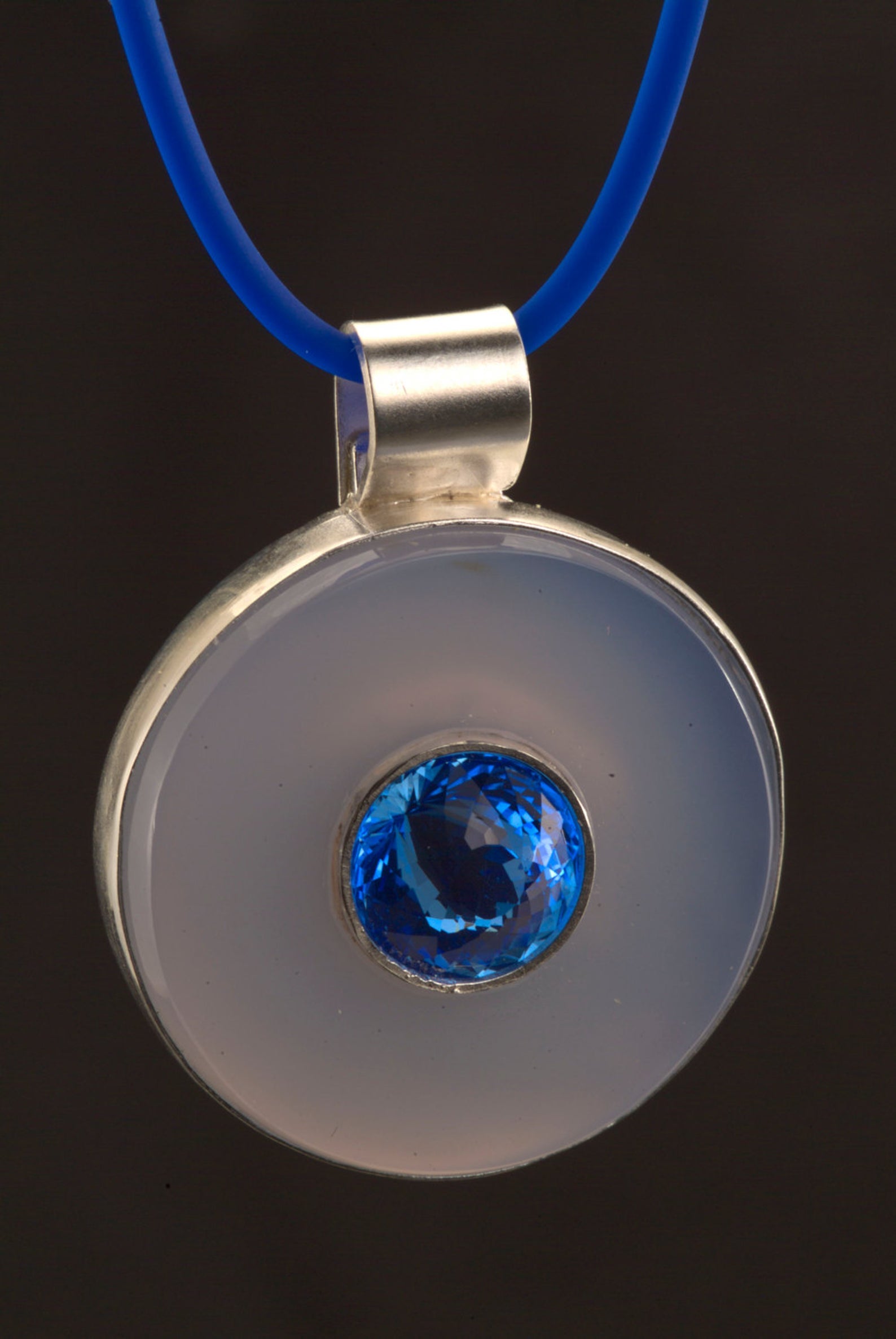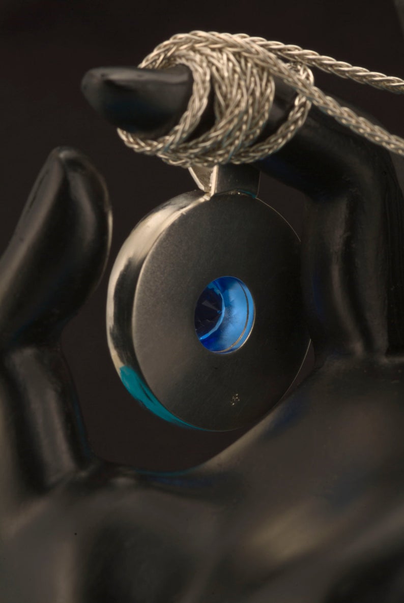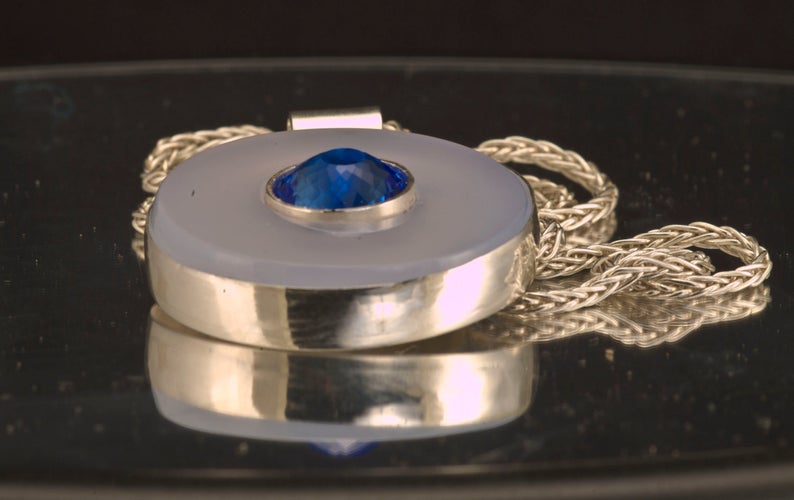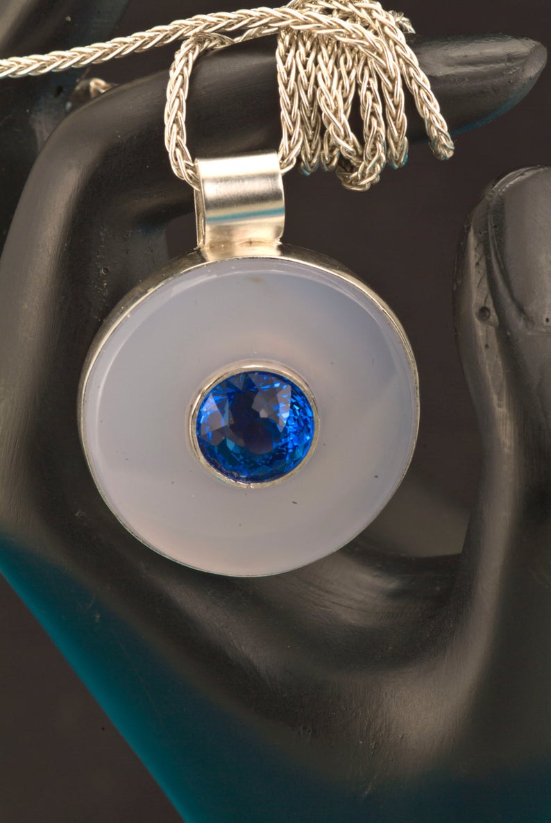 How about a gem inside a gem? This is the perfect layering necklace. Our one-of-a-kind Medallion pendant features a Portuguese cut blue quartz in the center of the Chalcedony stone. This is a bold piece of jewelry! The center bezel holding the Blue Quartz is handmade and welded to the Argentium silver back piece. This is totally 100% hand carved and handmade by us! We do not think we've seen the marriage of faceted gemstone & cabochons together in one piece before. This is totally 100% handmade pendant. We used Chalcedony cut into a 32mm or 1 1/8" circle. Total length with bail is 1 1/2 inches. We accented the pale blue of the chalcedony with an 11.25mm Royal or Electric Blue Quartz that is simply stunning in the Portuguese cut. No glue is used in the assembly of this pendant. We used 16-gauge silver and handmade the bezel surrounding the Chalcedony circle. The bail is also handmade and soldered on. We left a very large bail opening to accommodate a very wide chain. We are including the 18-inch 2mm sterling wheat chain with lobster claw clasp. |