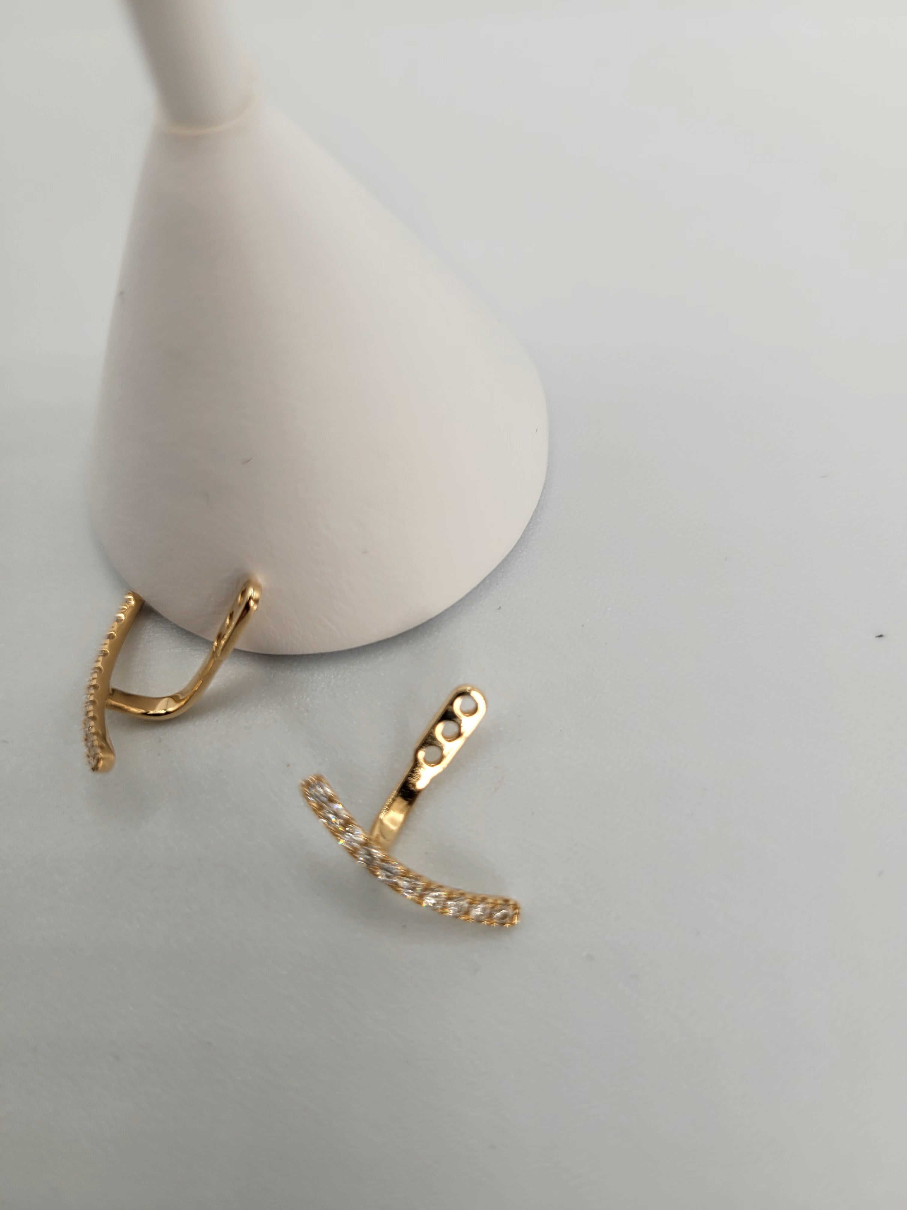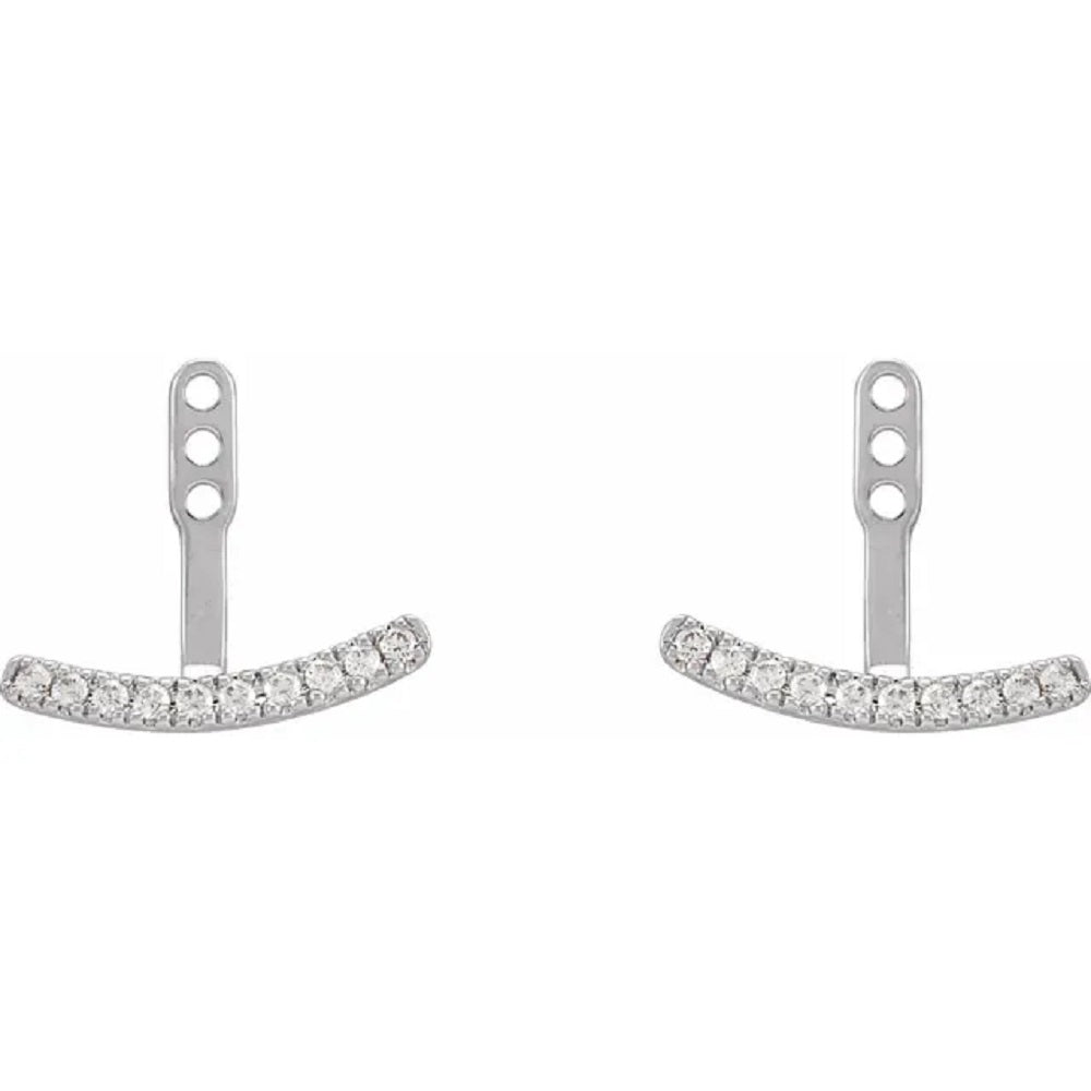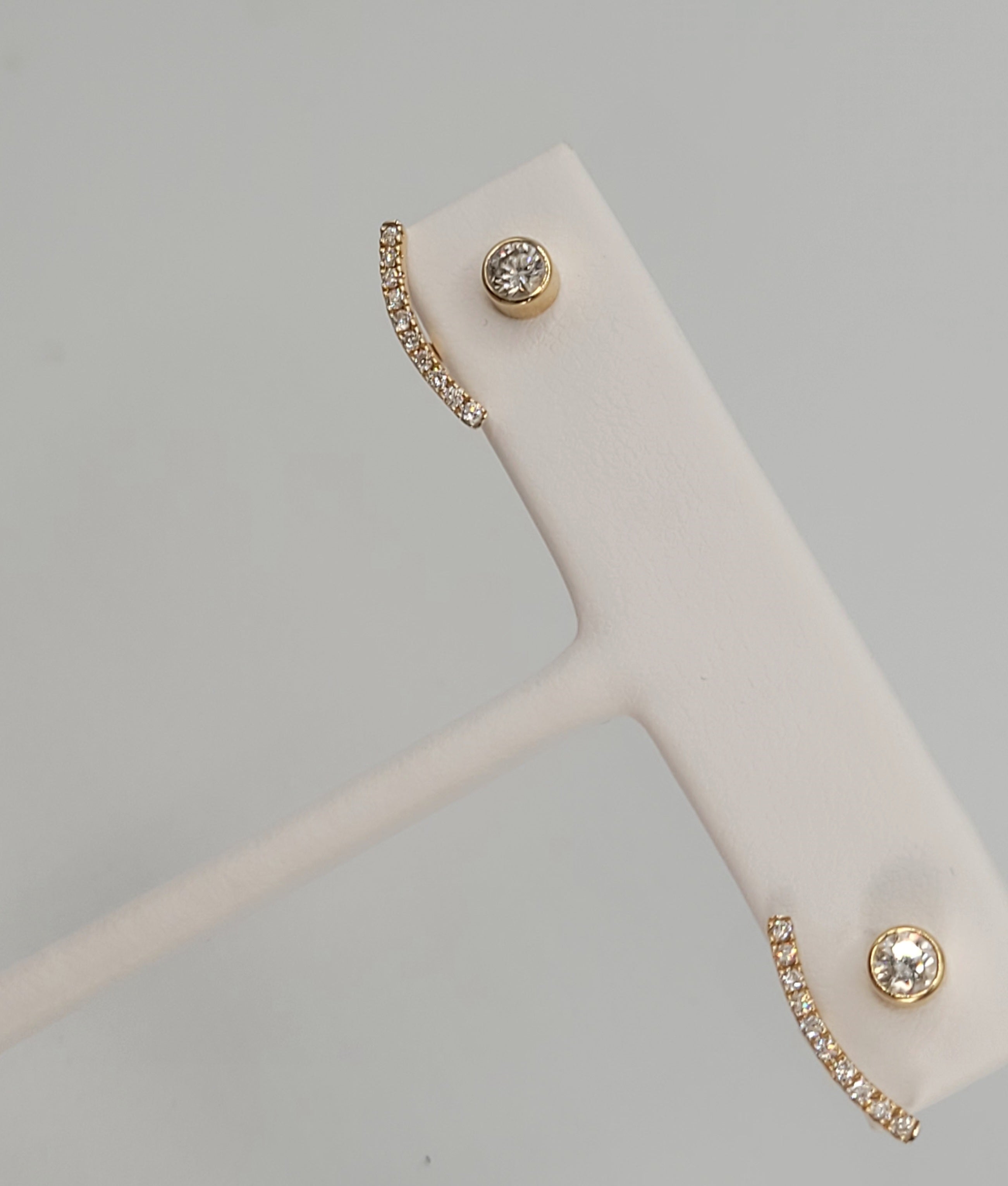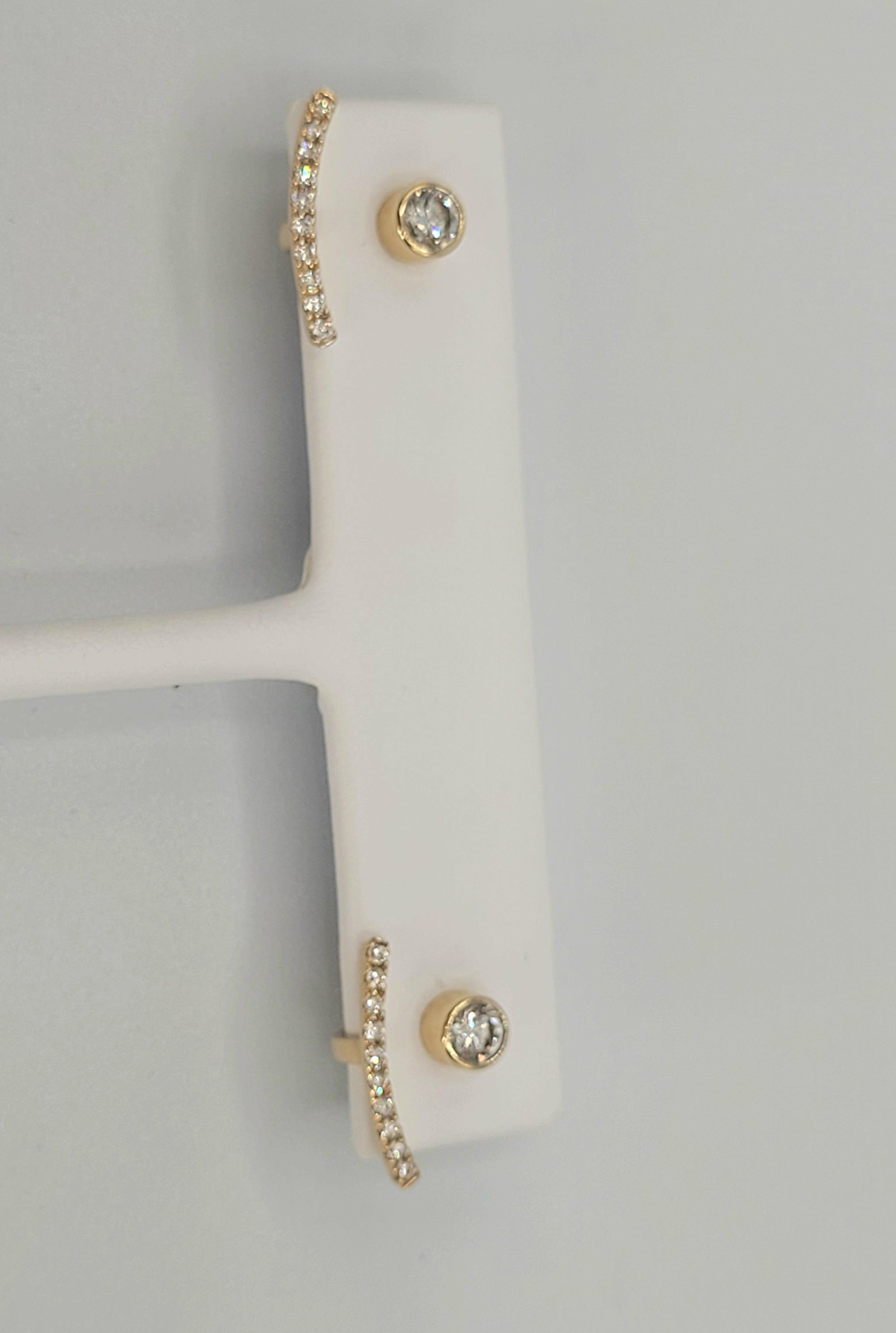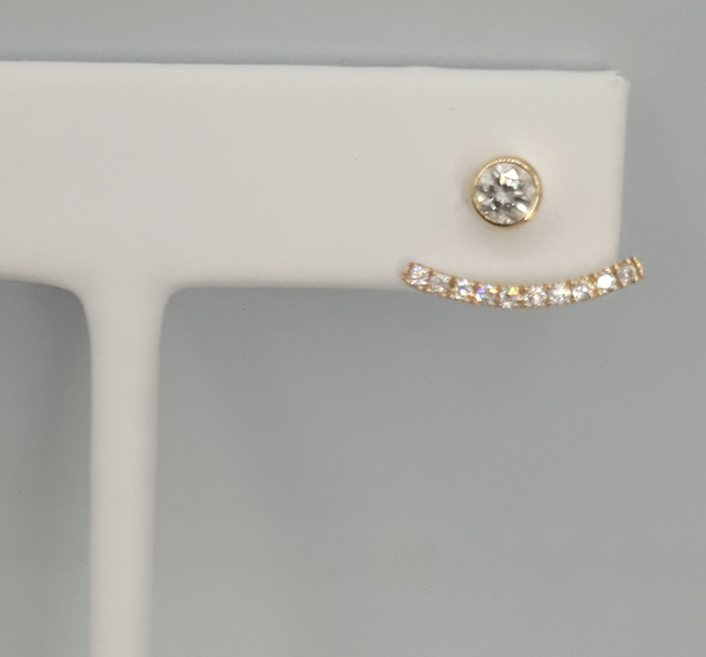 14k Gold diamond earring jacket is a fun little earring accessory! Dress up your diamond or other stud earrings by adding a diamond curved bar dangle. The bar outlines your ear lope and adds some sparkle! There are 3 holes for different lobe sizes.