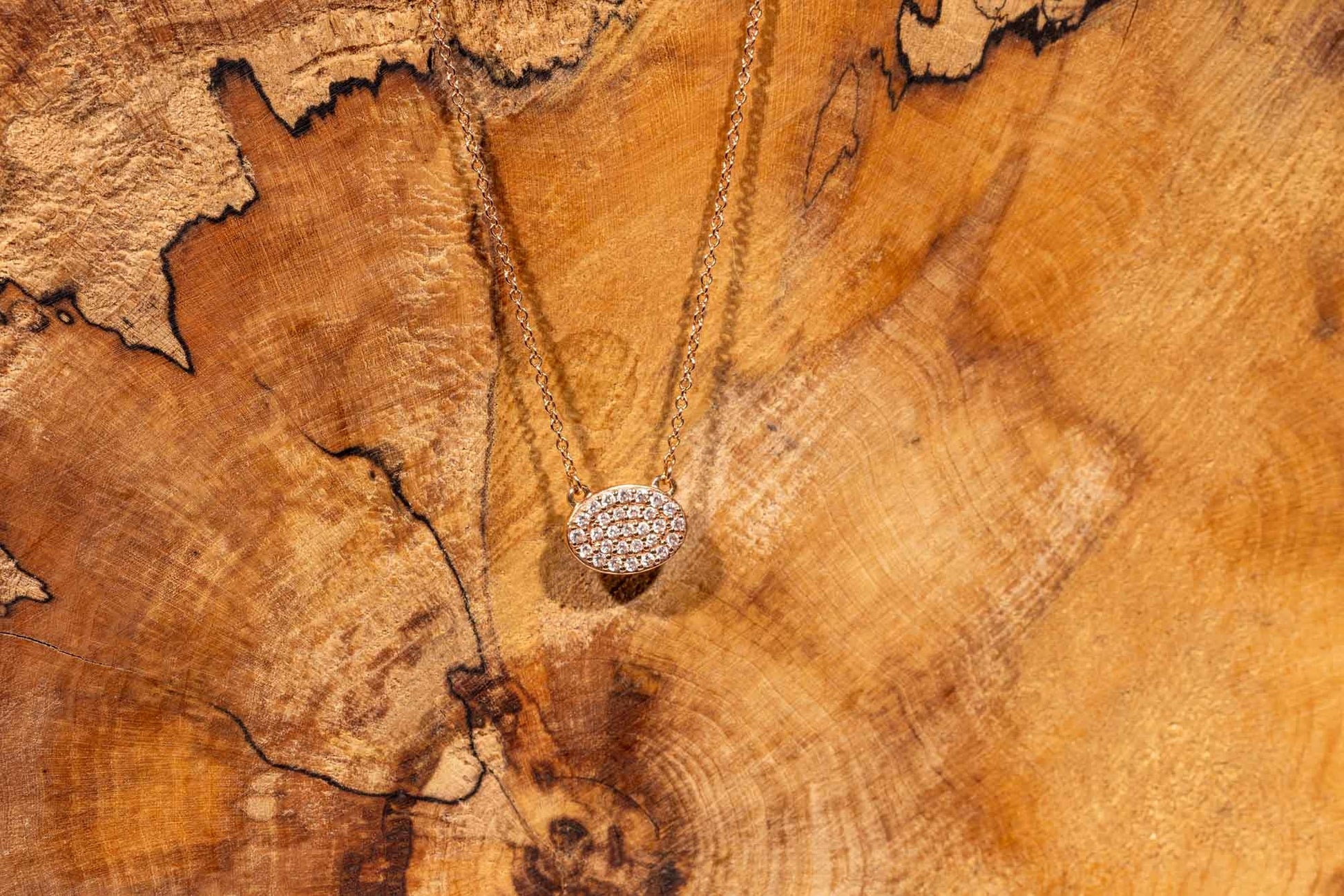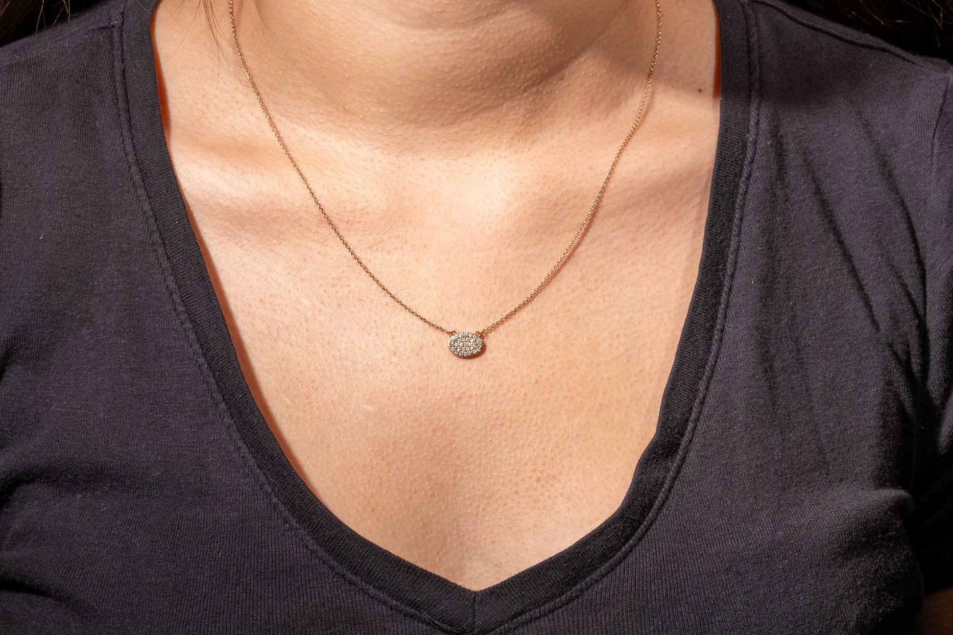 Our 14k gold diamond necklace is in the diamond pave necklace design. Featuring an east-west direction oval shape pendant, which is pave set with 29 round brilliant cut diamonds. It is a dainty necklace, which is perfect as an everyday necklace! Pave setting has the look of diamond cluster, with the diamonds very close together and minimal metal in between. This process allows the stones to really sparkle as major light is entering from all directions.