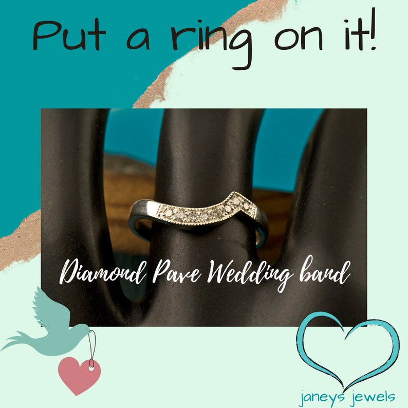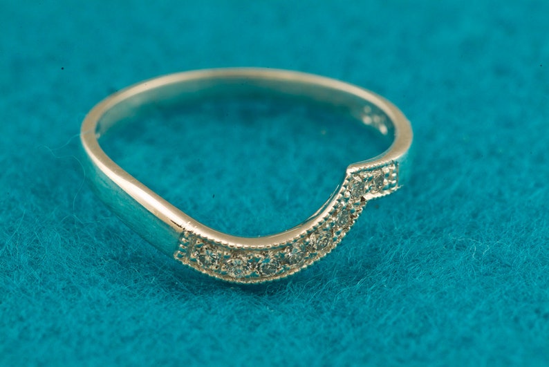 Our diamond pave wedding band is in the curved wedding band style. It is a modern wedding band with nice movement to it. It can be worn alone or with any of our crescent style engagement rings as it was designed to fit perfectly with the crescent ring. This can also be given as a promise ring and some customers have purchased as a vow renewal ceremony band. The band is a nice size with a 2.5mm wide shank. We upgraded the quality of the diamonds to give you bright, white stones and lively diamonds. The millgrain detail work is perfect and borders 8) 1.5mm round natural full cut diamonds that are pave set in our custom designed wedding ring.