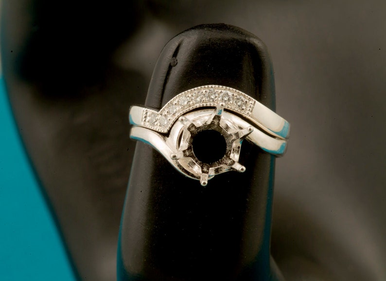 -We designed this band to fit a round stone or our Rose Petal Cut Color Engagement stone. Pictures # 3 & 5 illustrate with the crescent engagement setting.