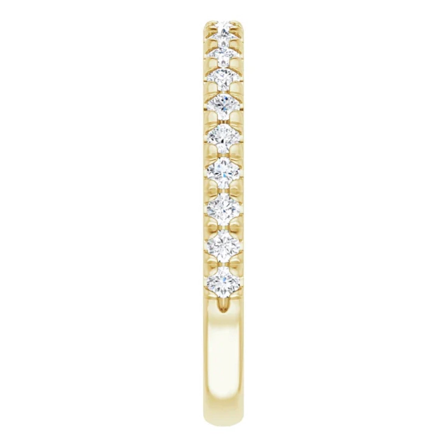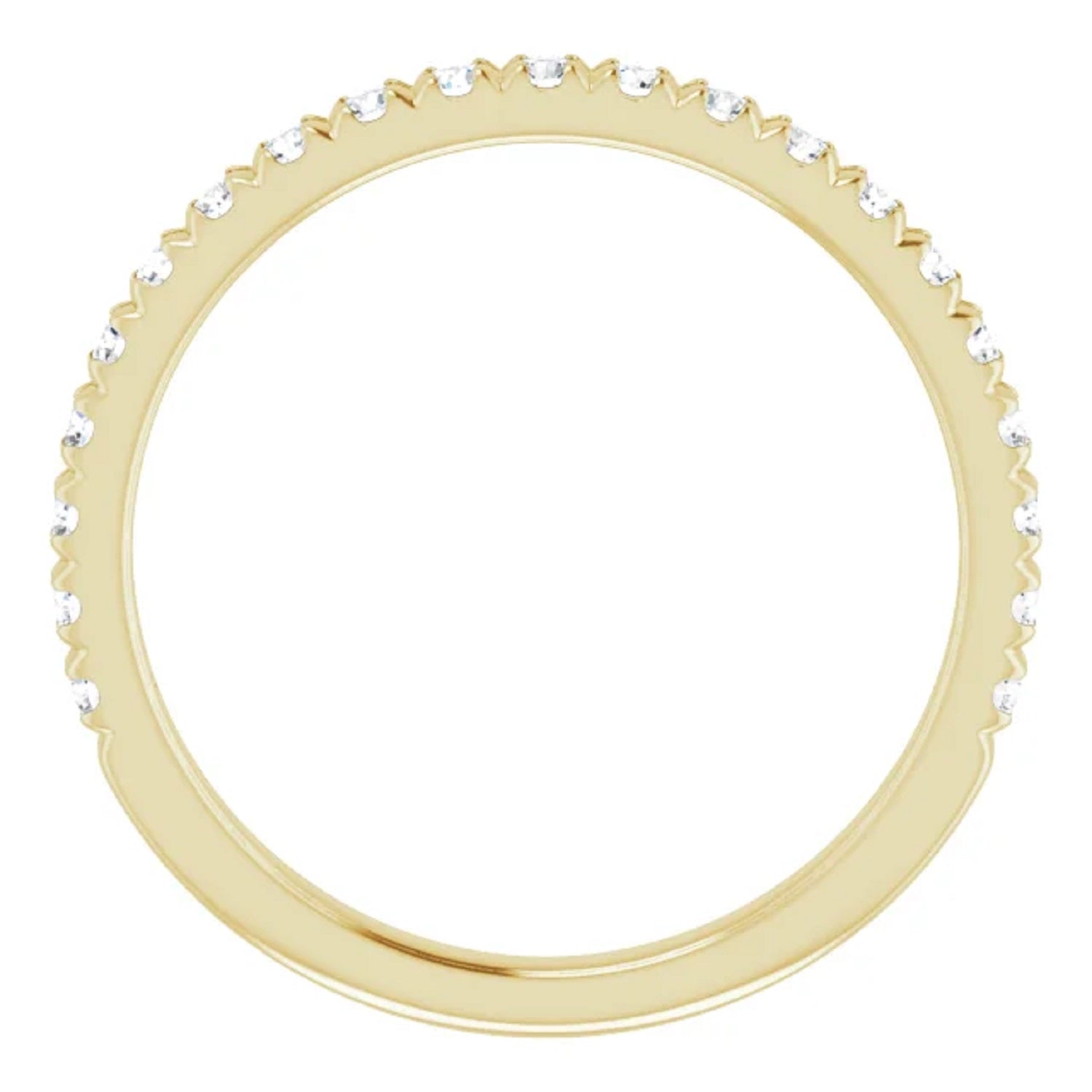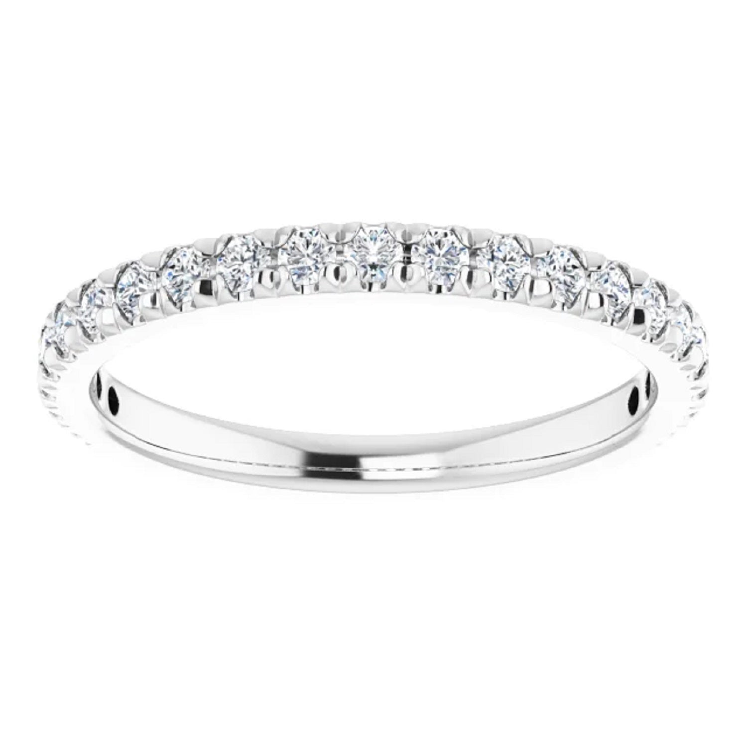 Our diamond wedding band & half eternity band features lab grown diamonds with the finest color and clarity. These are bright white brilliant full cut diamonds. This is the matching wedding band to our Oval engagement ring (see link below) It is also a stand alone diamond wedding band. The diamonds are French set, which is a setting method that results in more brilliant stones, since the prongs are very small and hand raised from the metal, so there is no unnecessary metal and the stones are set flush with the shank.