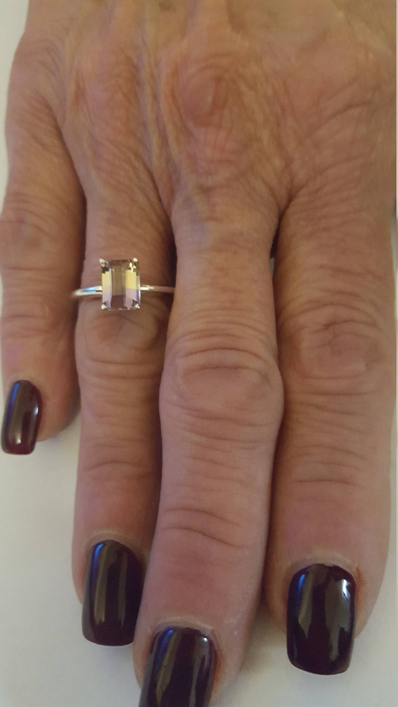 | Beautiful color banding in our Ametrine unique engagement ring. We set this beauty in a simple, minimalist and classic style. Ametrine is a bicolor gemstone and is the blend of the birthstones Amethyst & Citrine. We are offering in 14k gold in yellow, white or rose gold options. Yellow & white gold are shown in our pictures. Simple, classic and elegant! Pictures on my hand are of this ring in white gold. Since the pricing is by size range; please choose your range and tell us at checkout, in the notes to seller/from buyer the exact finger size you need. ♡ SETTING SPECIFICS: Shank width: 2.3mm Shank thickness: 1mm ♡ STONE DETAILS: Dimensions: 8 x 6mm Weight: 1.60 carat Grade: AA Clarity: Eye clean |