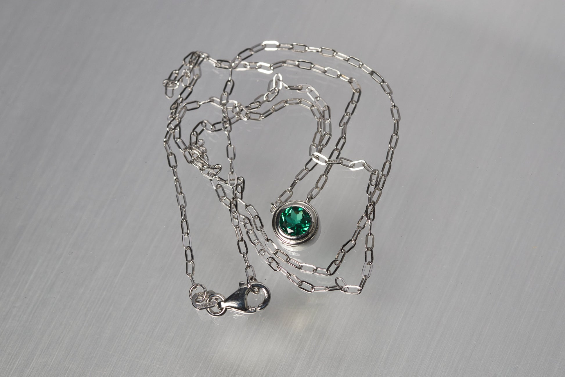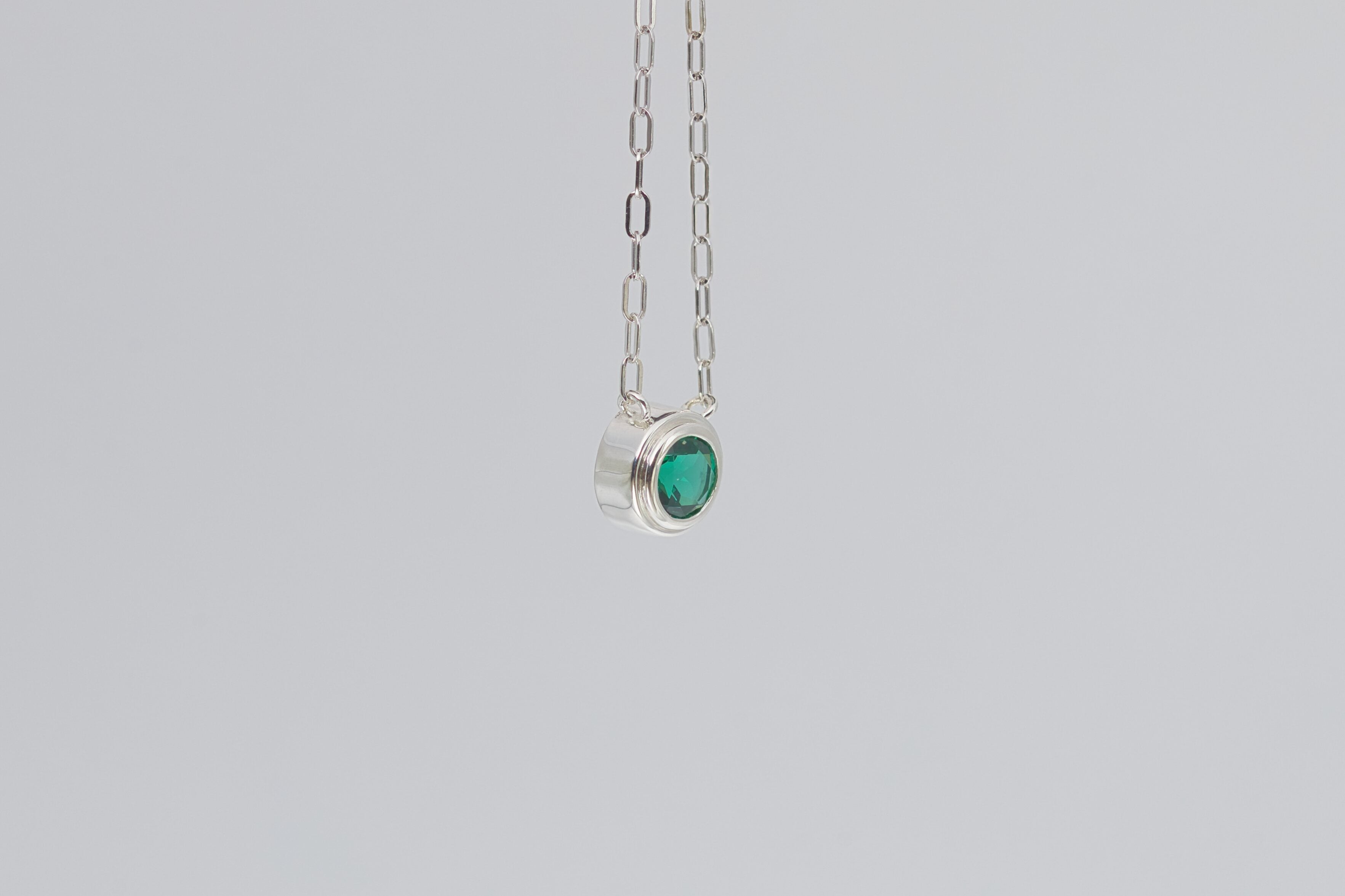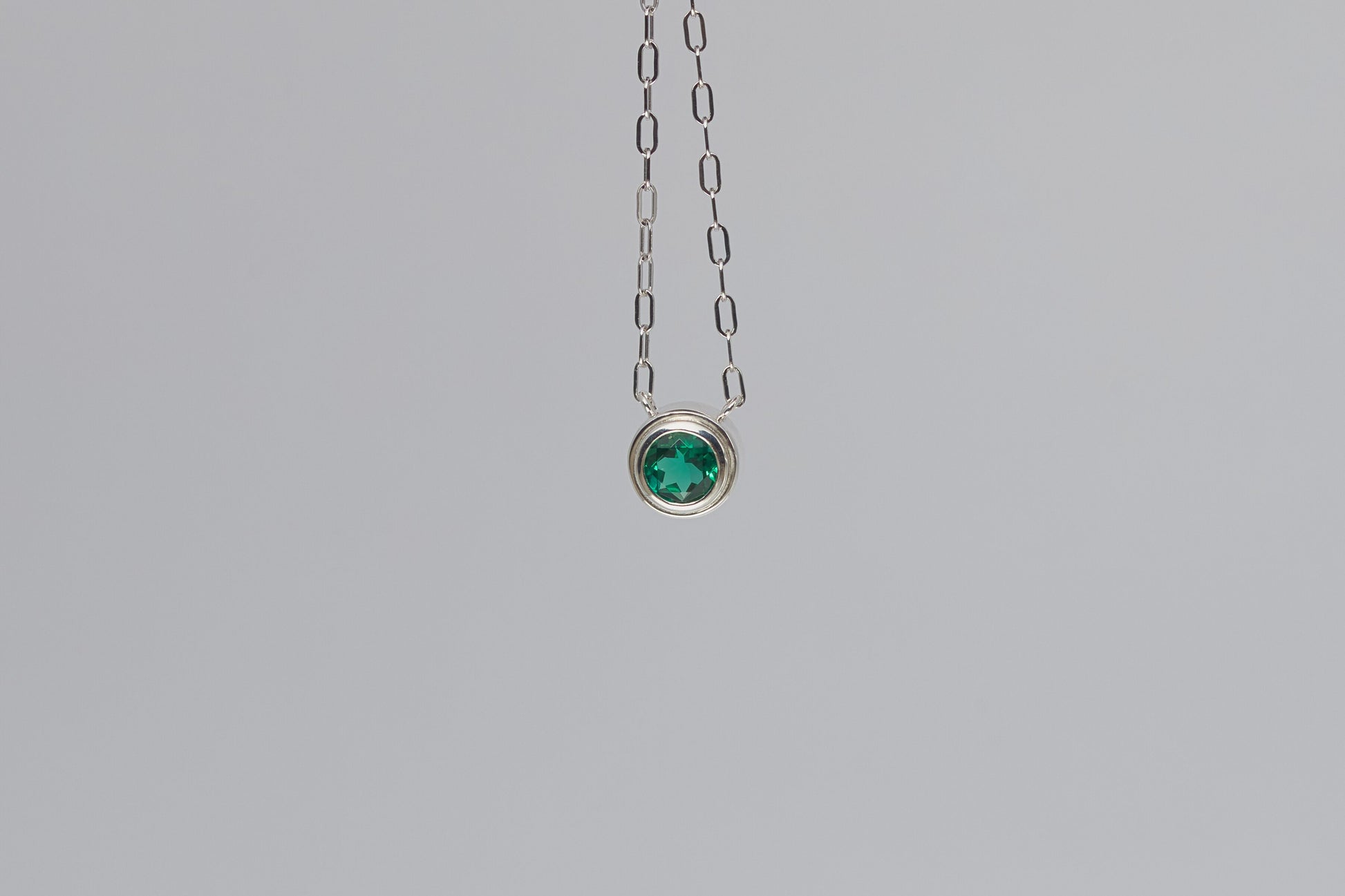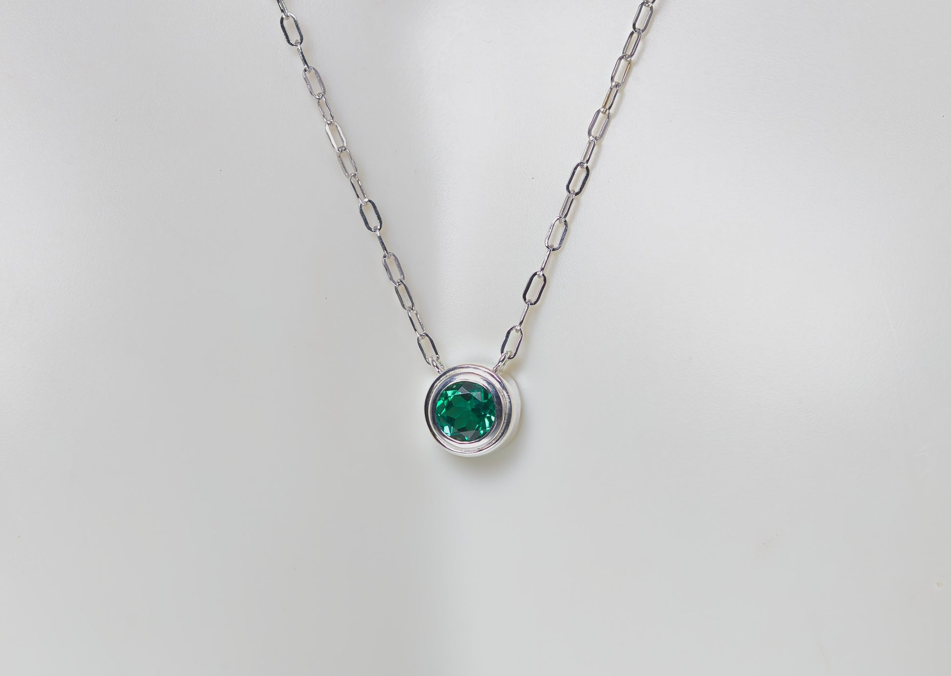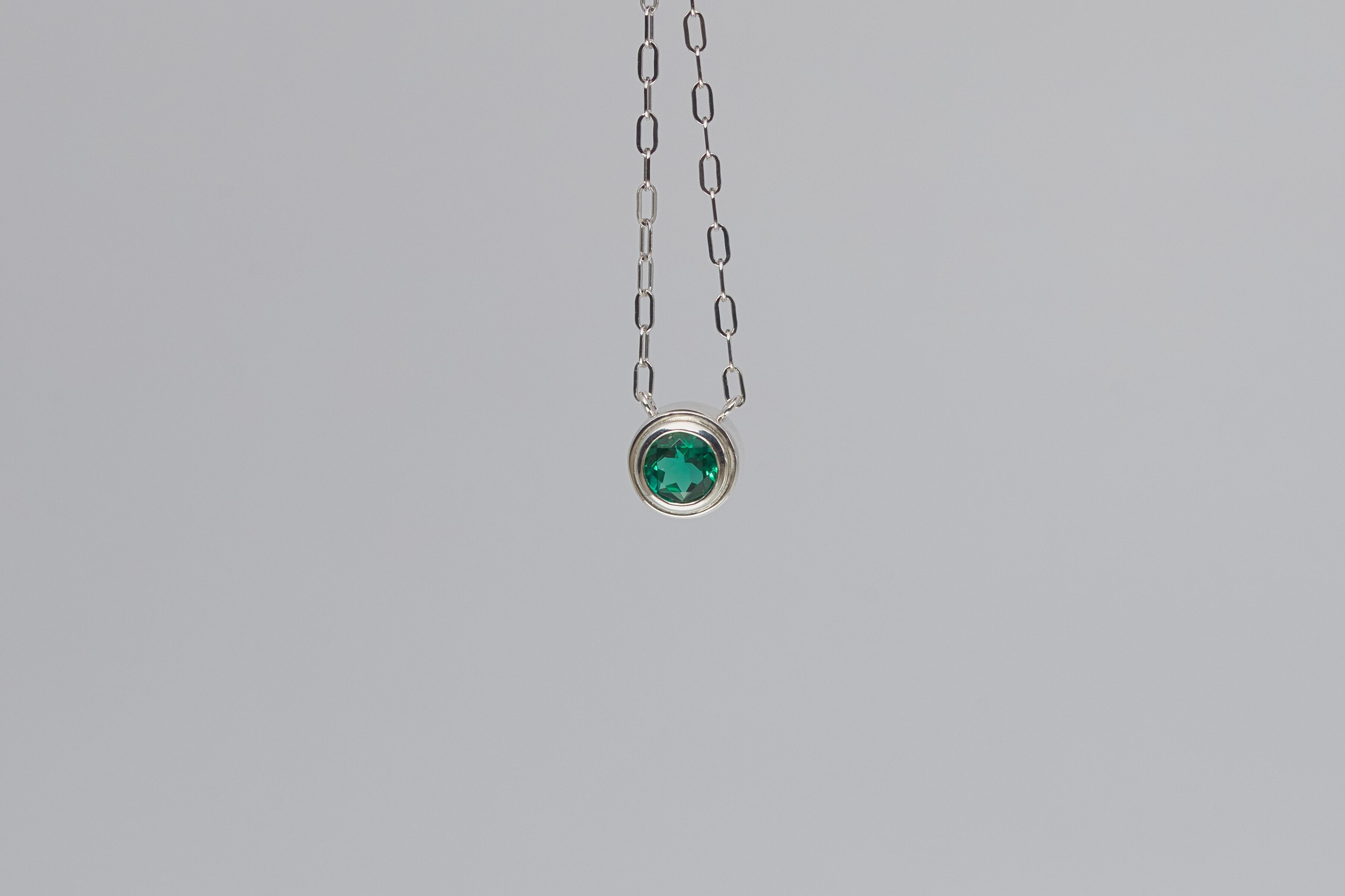 Our lab grown emerald silver necklace is also the May birthstone. This bezel set gemstone necklace is perfect for everyday wear! There are no prongs to catch on clothing or in hair. The style while simple and minimal is enhanced by the popular paperclip chain style.
