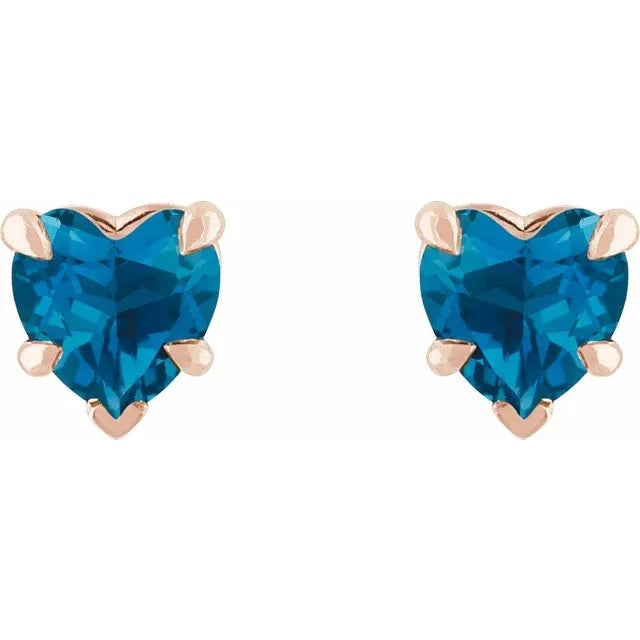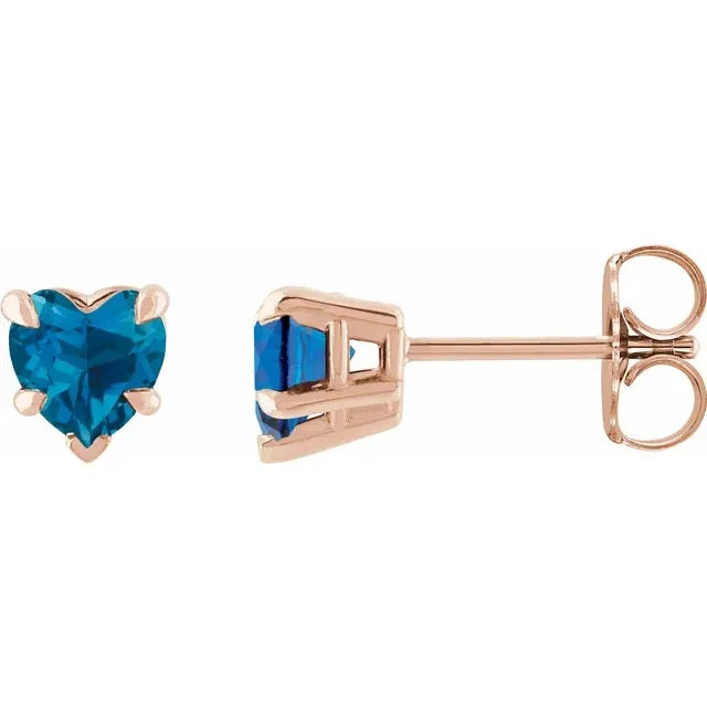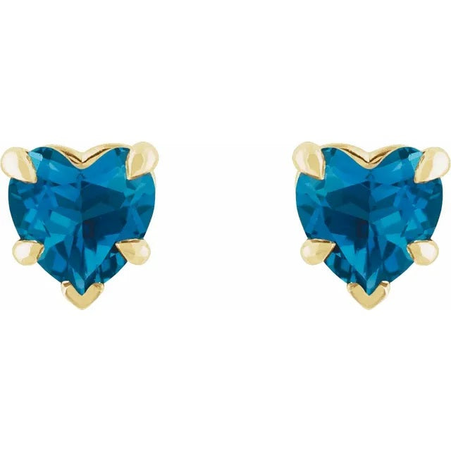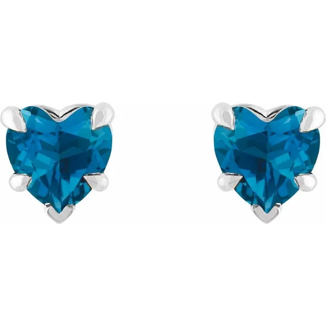 Our topaz heart earrings are made with natural London blue topaz that is faceted into a heart shape. While dainty, they are still a noticeable size at 5mm or 1/2 carat each stone for a 1 carat total weight. We are making in recycled sterling silver that is nickel free and 14k white, yellow and rose gold. We used a 5 claw prong setting style, which adds a little something extra.