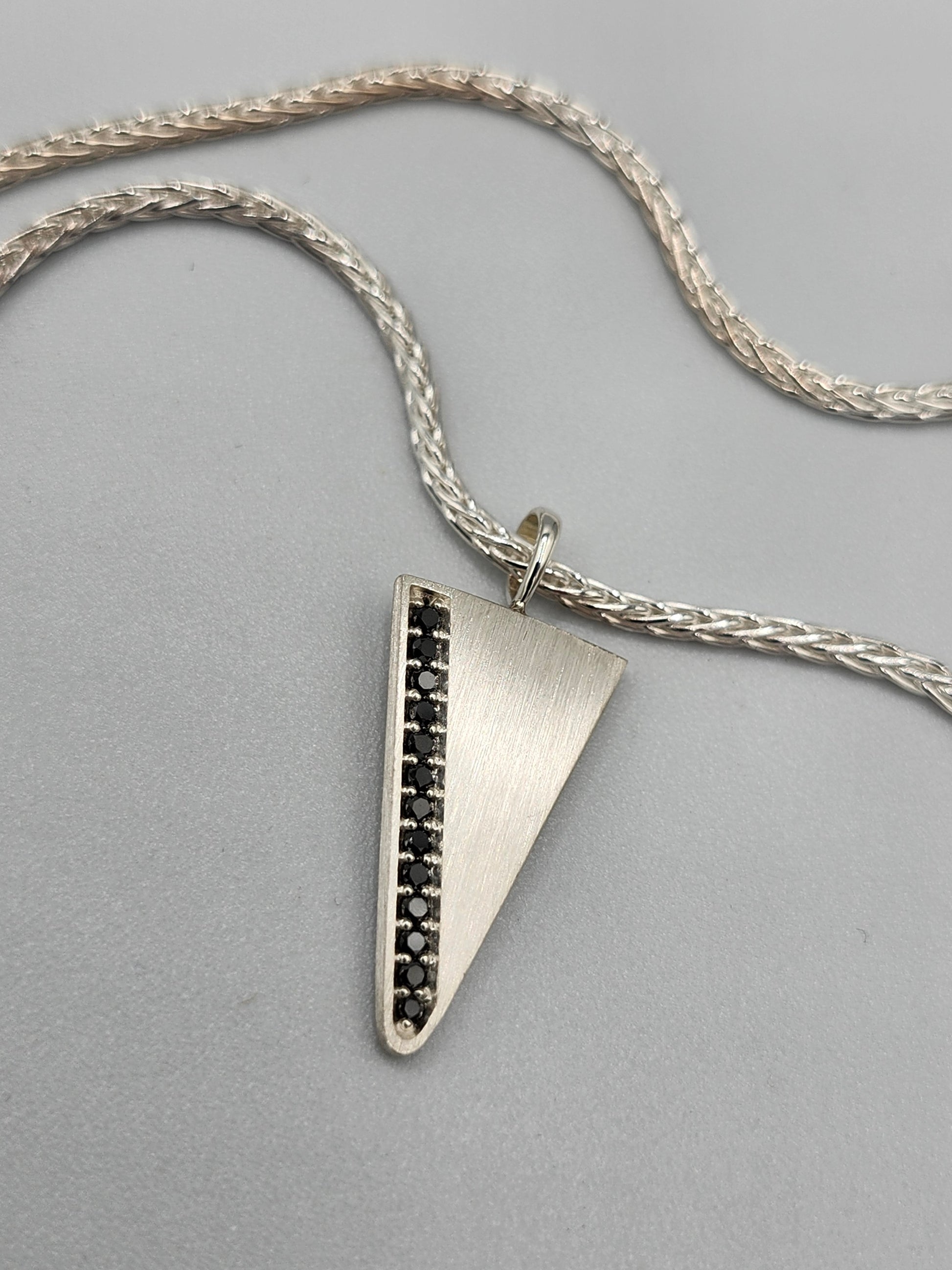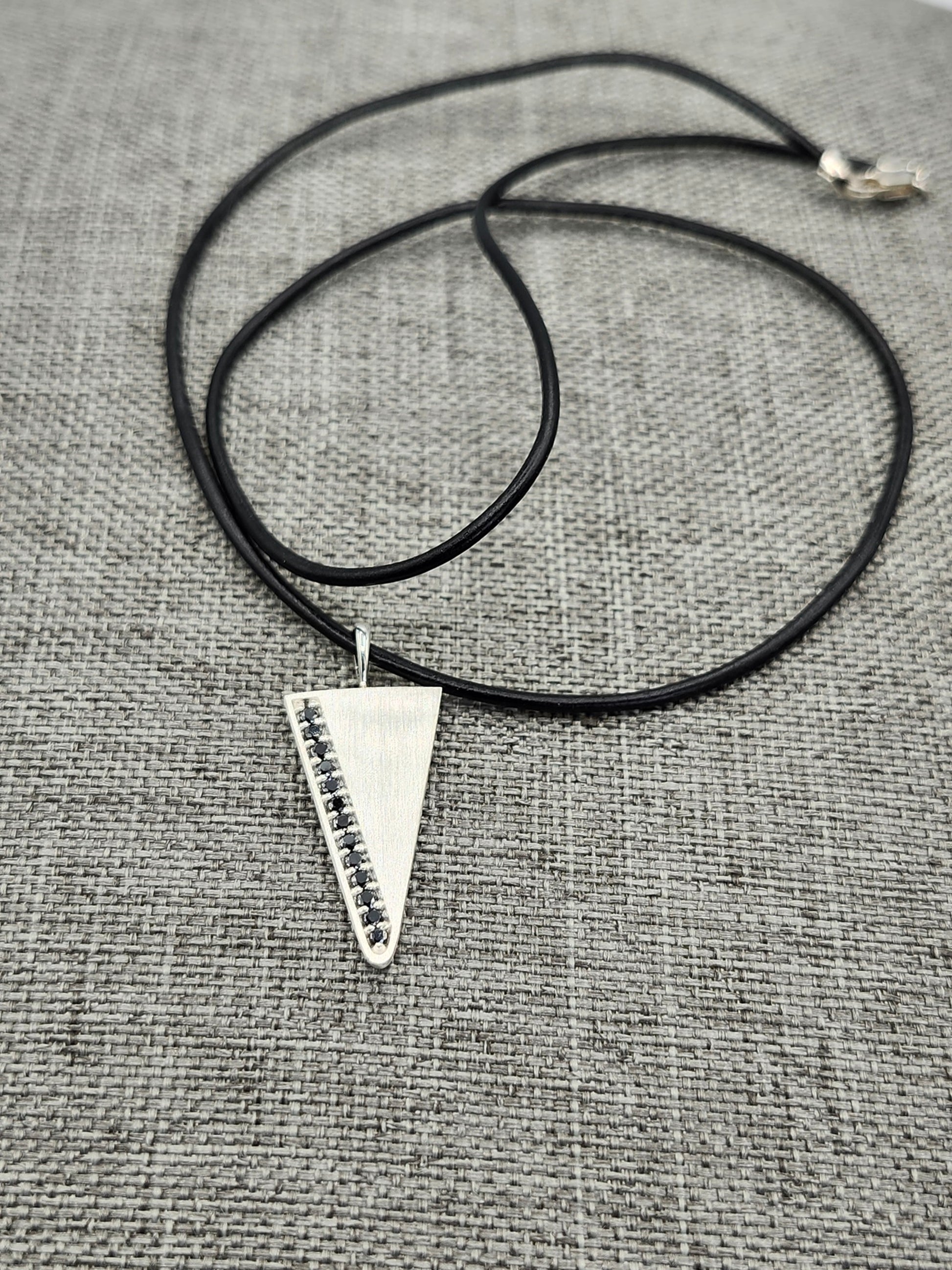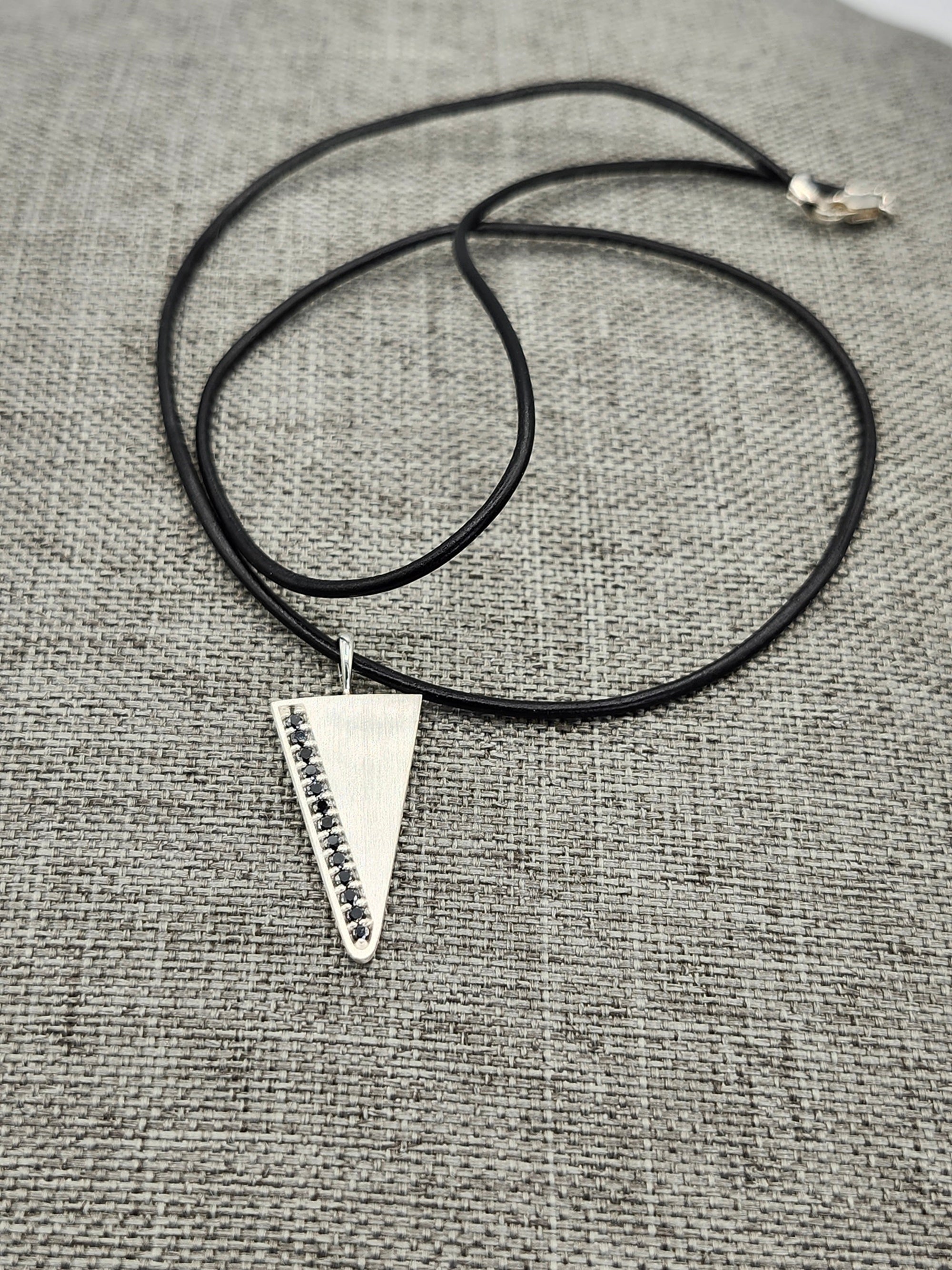 Our Arrowhead necklace & Mens pendant is set with 1/5 carat of natural black diamond pendant, The shape is a triangle pendant or arrowhead pendant shape. The silver is given a satin finish for a clean, subtle and modern look. 13 natural black diamonds are set in the pave style. Made with recycled sterling silver.