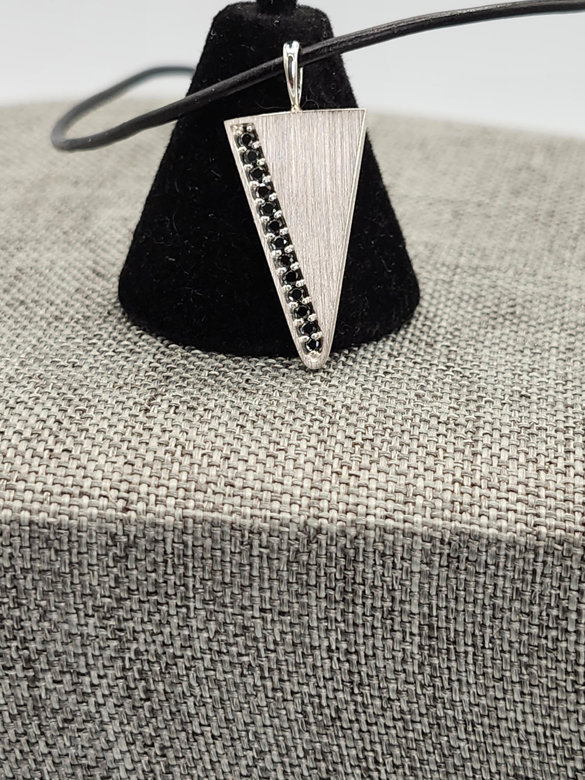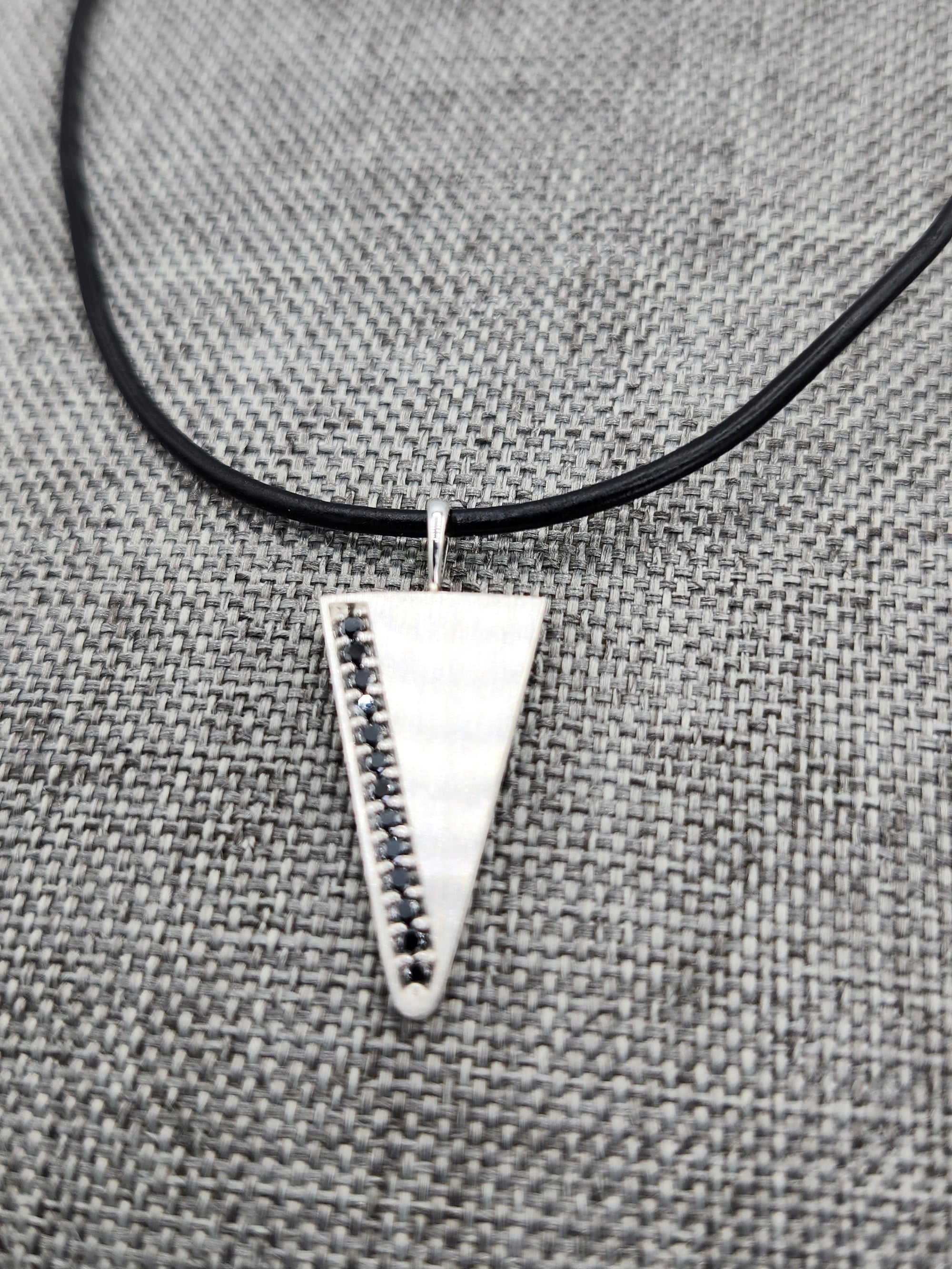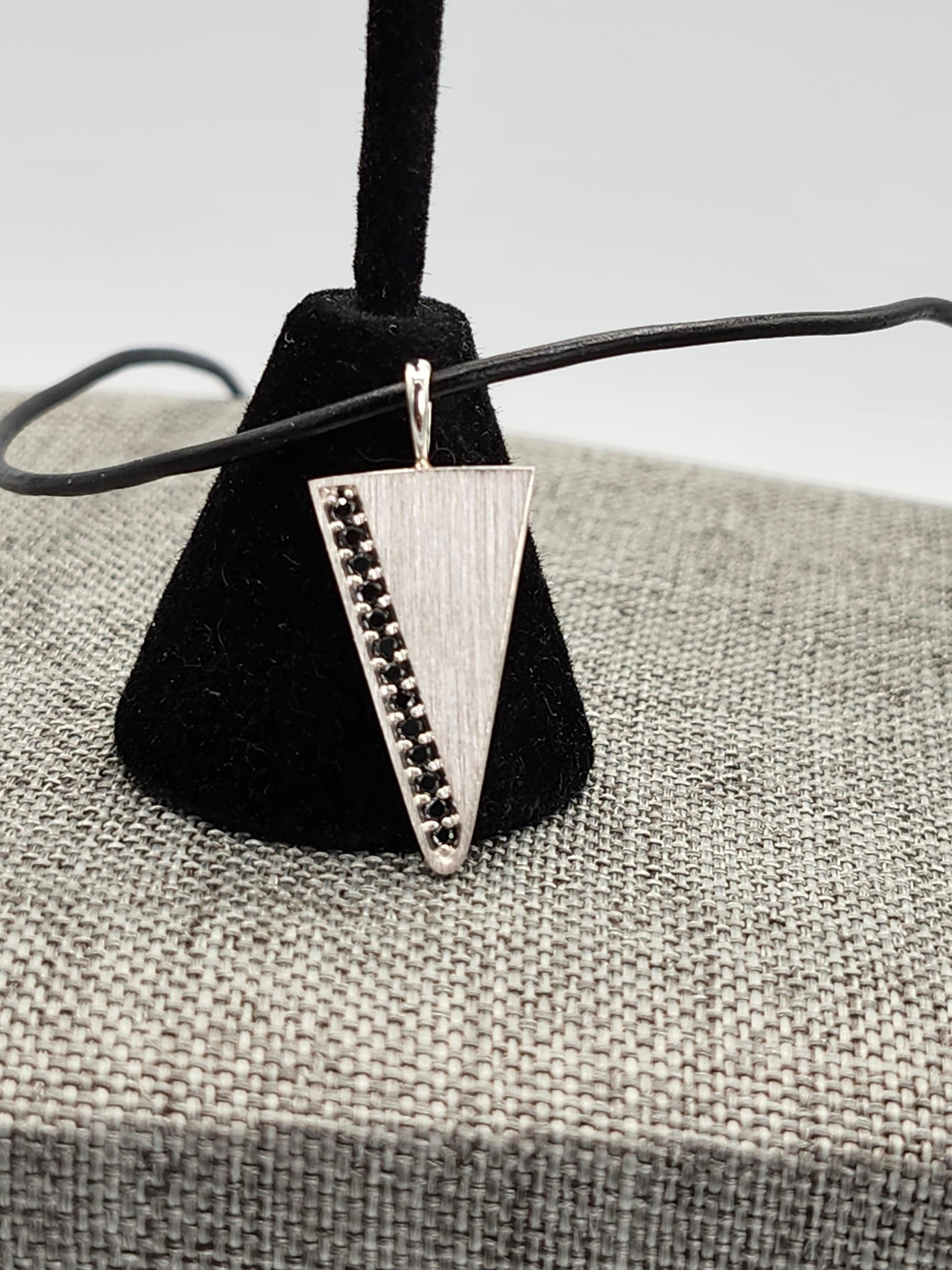 Our Arrowhead necklace & Mens pendant is set with 1/5 carat of natural black diamond pendant, The shape is a triangle pendant or arrowhead pendant shape. The silver is given a satin finish for a clean, subtle and modern look. 13 natural black diamonds are set in the pave style. Made with recycled sterling silver.