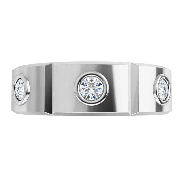 This versatile ring is also a fashion statement ring for the single guy who is looking for a great everyday ring. We set 7 round lab grown diamonds in bezels for security and a modern, minimalist look. We can customize this with colored gemstones or natural diamonds.