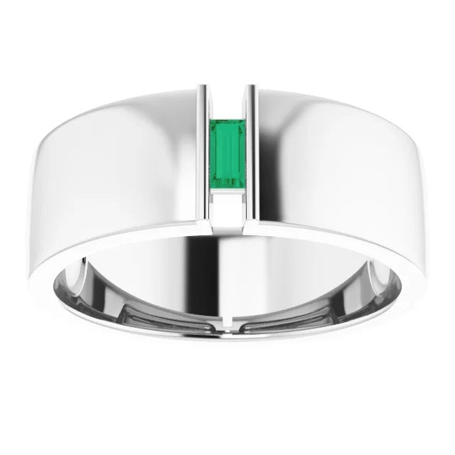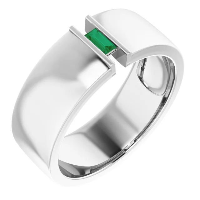 Our mens silver ring features a Baguette emerald and and is made with Continuum Silver, which is a very tarnish resistant metal, a bright white color that does not need Rhodium plating. Perfect mens engagement ring, mens promise ring or mens statement ring! The design is clean, minimal, sleek and ultra modern. Mens diamond rings and mens jewelery are becoming more & more popular and are being worn by many actors, sports figures and celebrities.