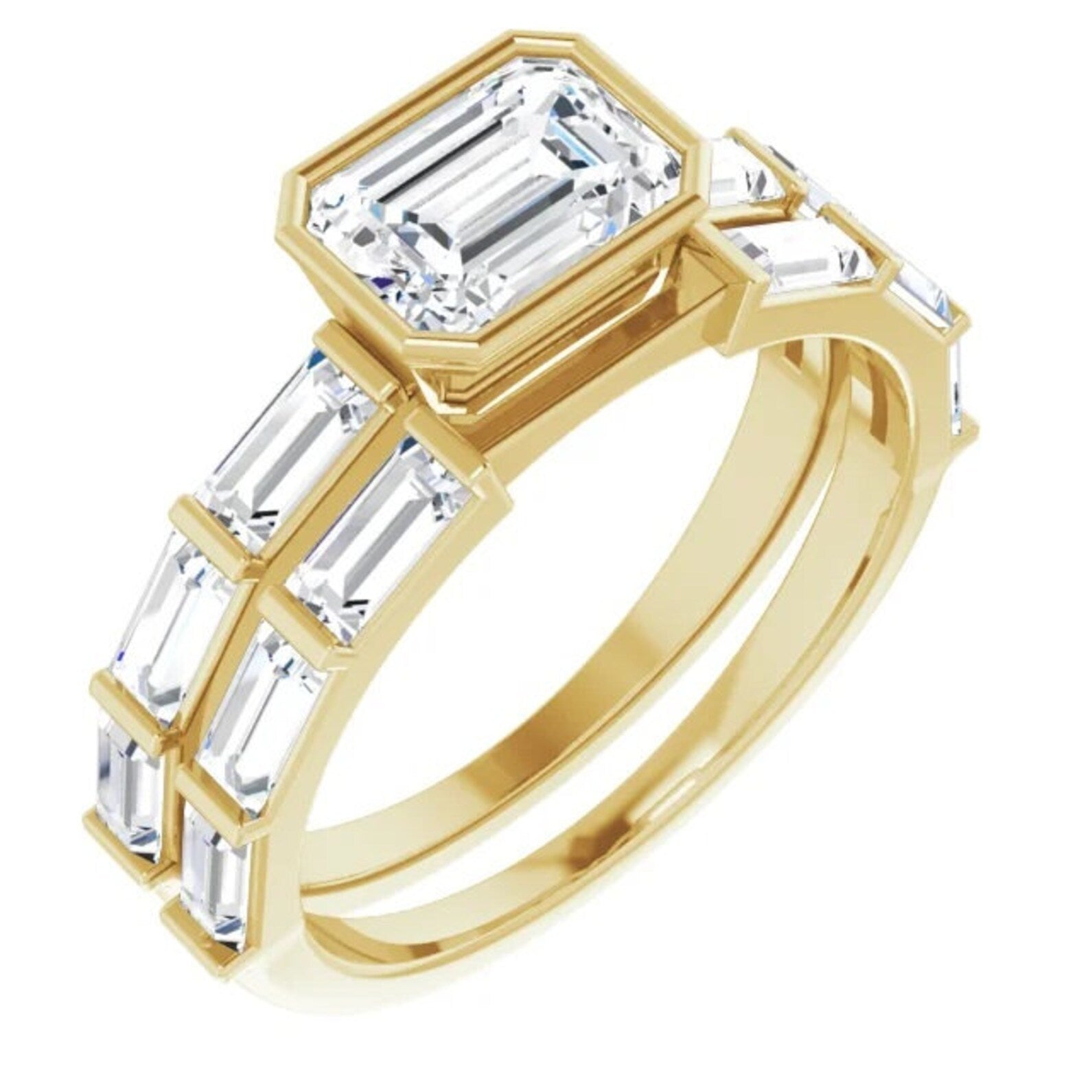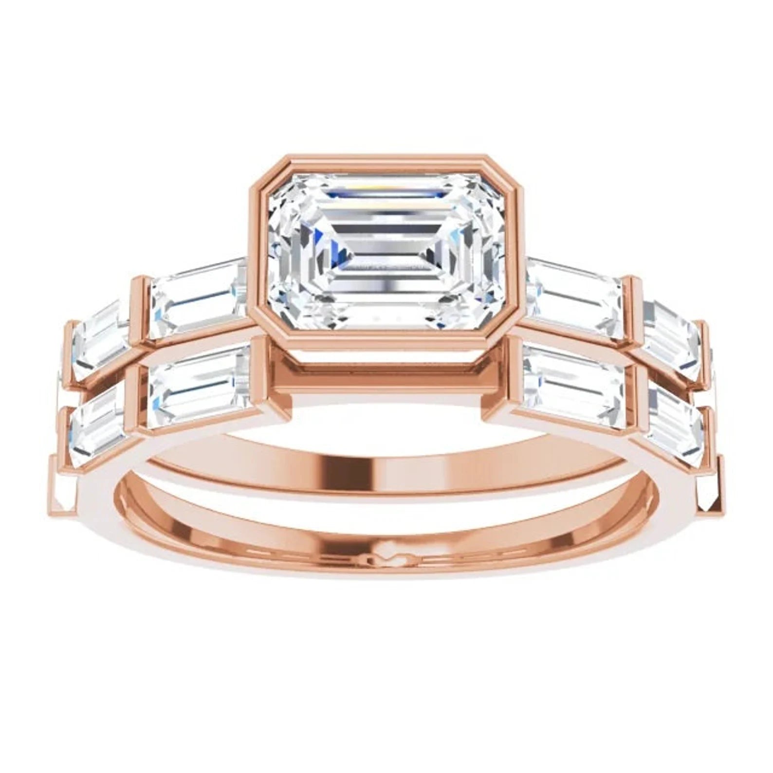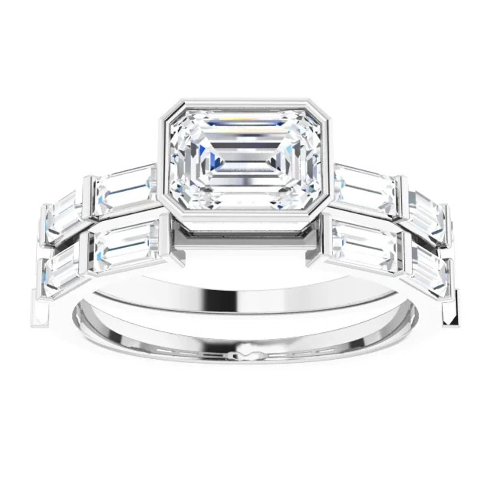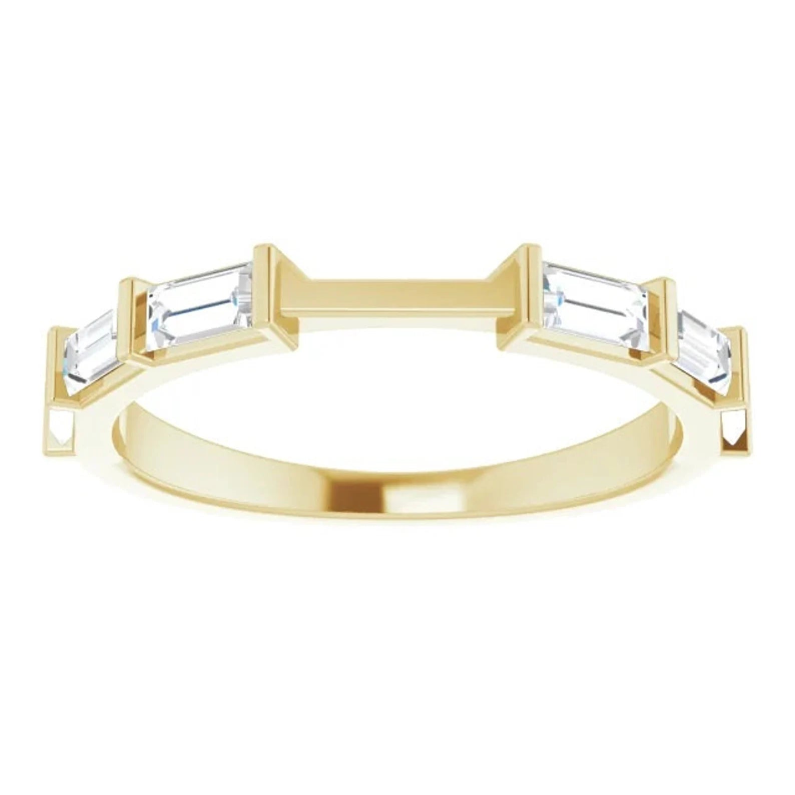 Our natural white sapphire wedding band features baguette cut sapphires and is custom made to fit perfectly with our emerald cut white sapphire engagement ring for the perfect bridal set! This baguette wedding band is a custom band with a clean, modern yet timeless style! Combined with our sapphire engagement ring, this is a very unique wedding ring set.