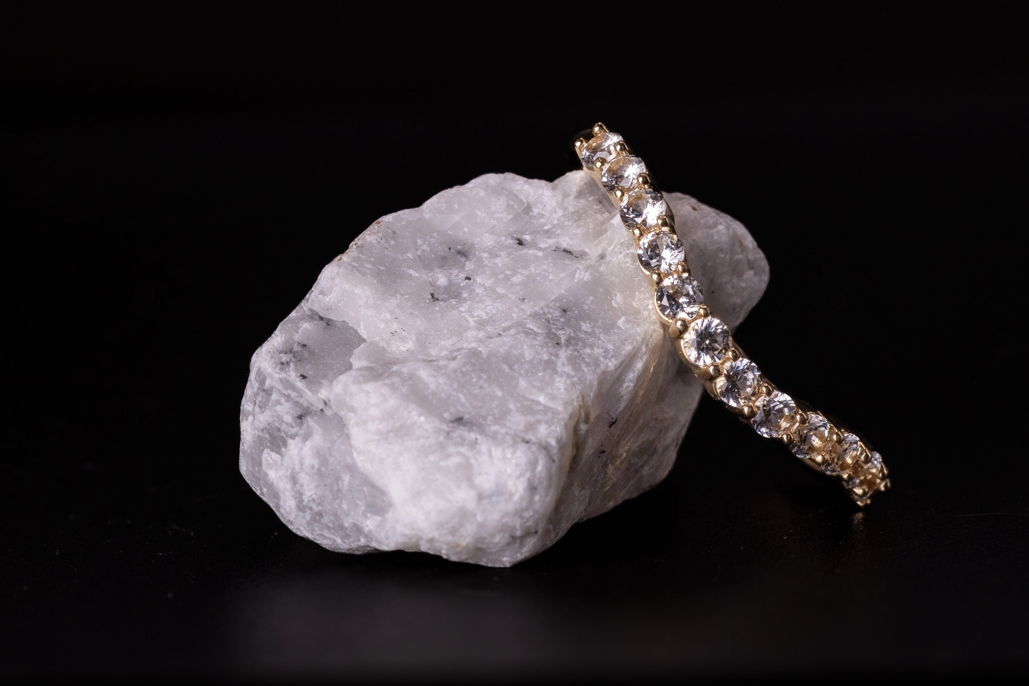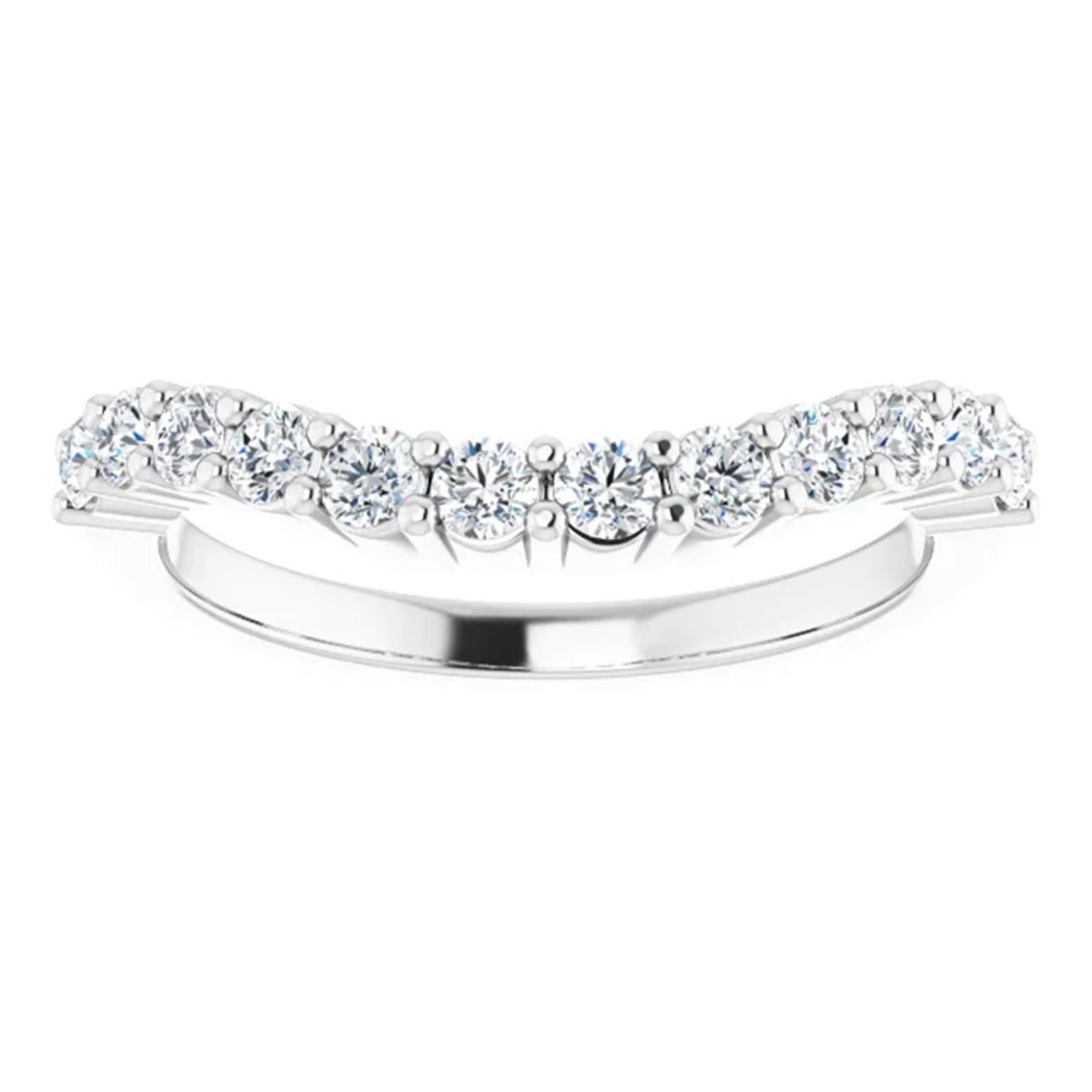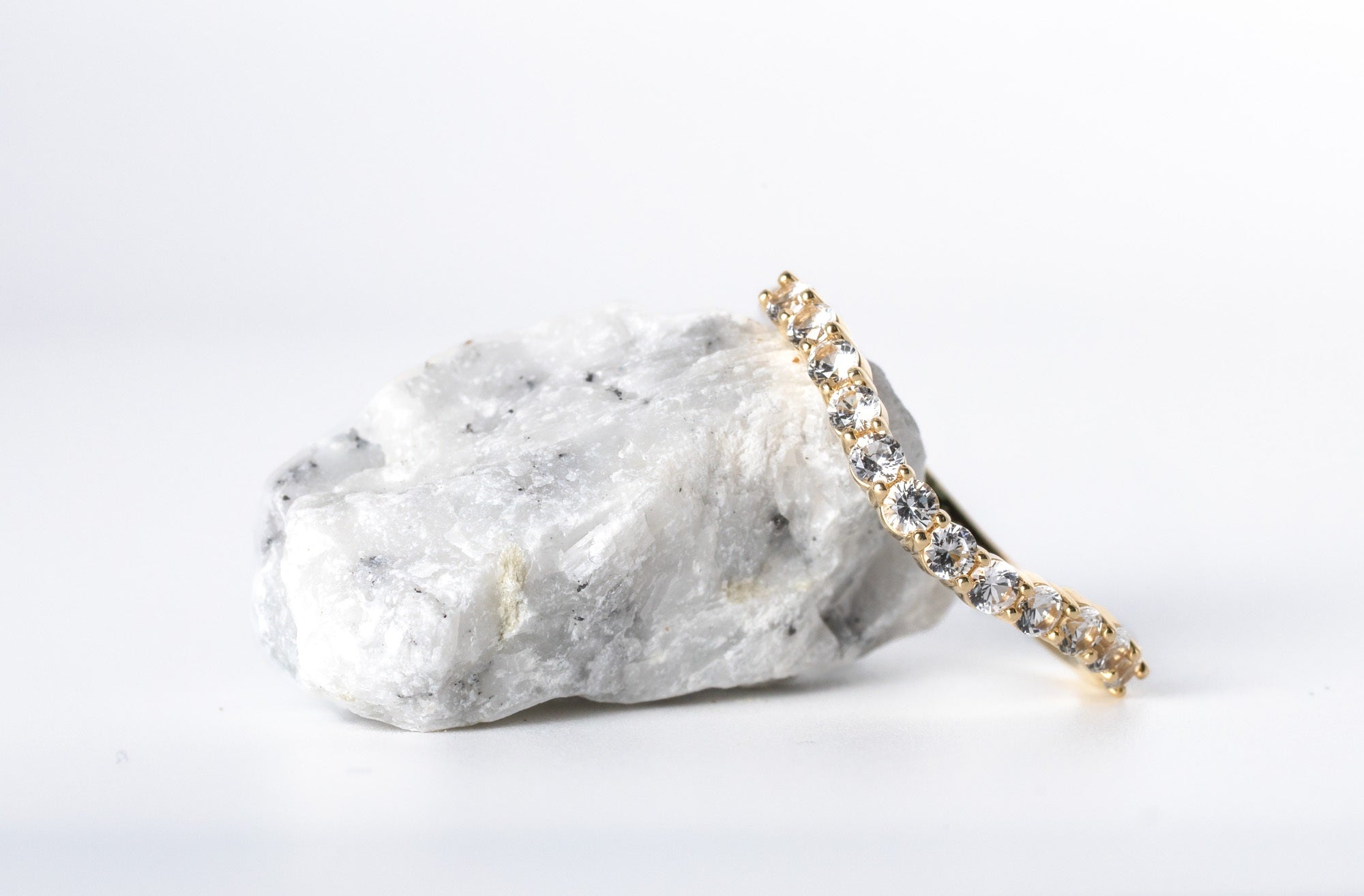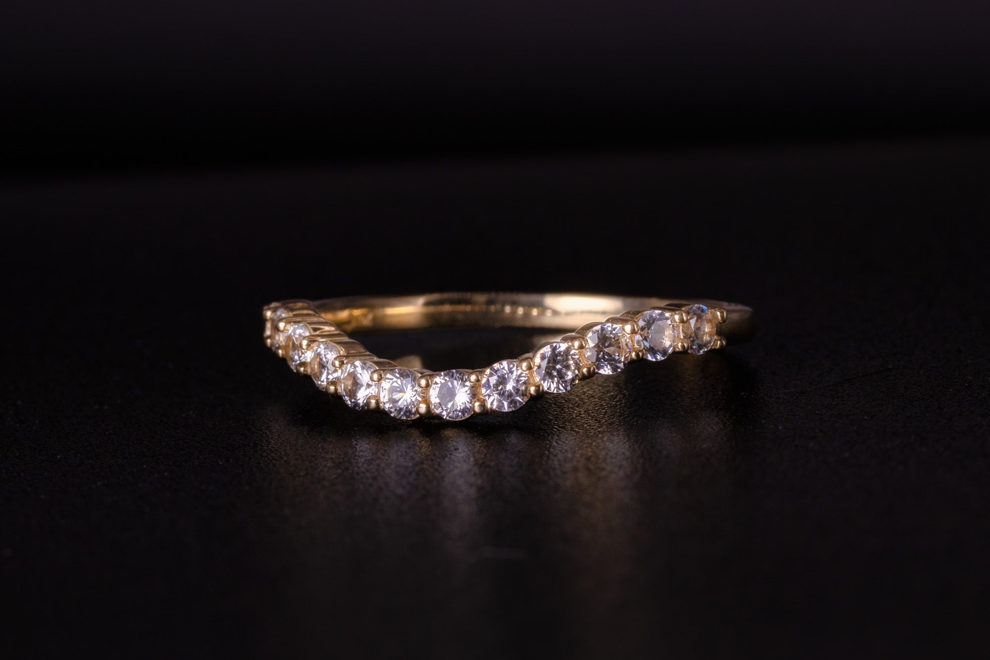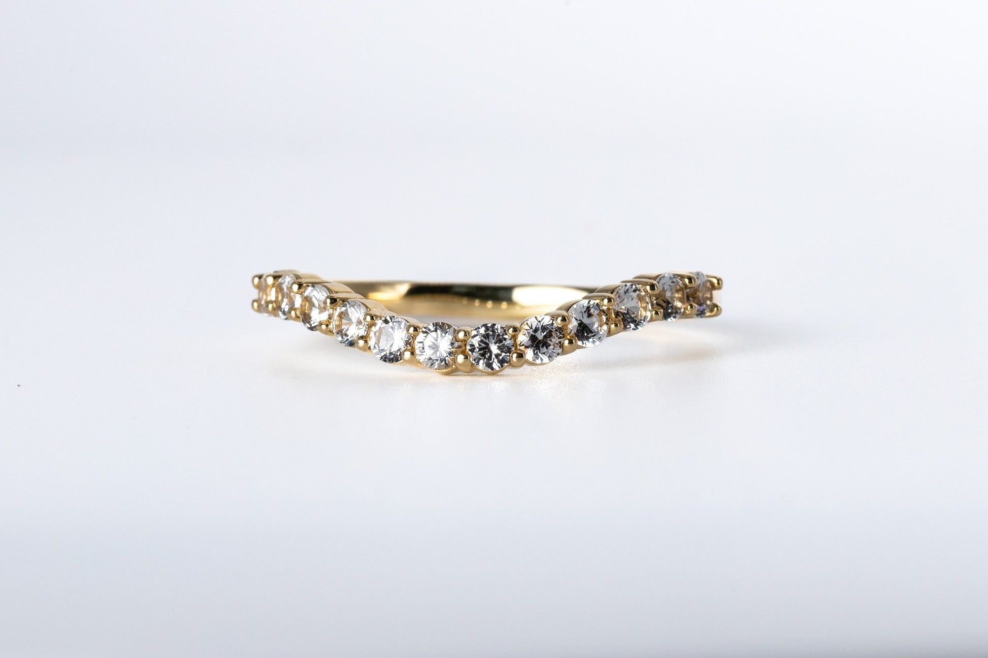 Our natural white sapphire wedding band is in a free form or asymmetrical style perfect for those looking for something different & unique! It will nest nicely with a 12mm round stone engagement ring. The yellow gold band is our sample in the photos; however you can also choose white or rose gold. We are using 10k to help keep the cost down.