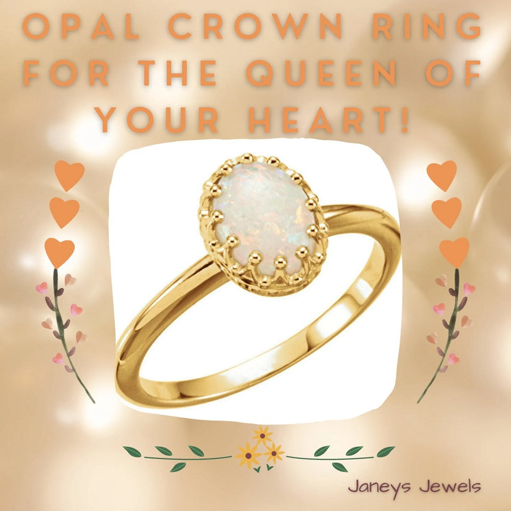 Our 14k gold opal ring is an Australian Opal Engagement ring and features the Edwardian style crown ring design with a delicate filigree setting head, which securely holds the stone and protects the stones borders and edges. Our oval engagement ring is a solitaire ring style. Our dainty ring is delicate and feminine. This is the perfect promise ring or girlfriend gift! I like the crown them and filigree ring as it reminds me of Victorian rings or Antique style jewelry, which had more detail than the more modern pieces that are made today. The lace design of the cutout filigree work is so pretty and also lets in tons of light to the stone. This gemstone ring is sure to become a family heirloom! Our birthstone ring is a meaningful jewelry gift for anyone born in October since Opal is the October birthstone.