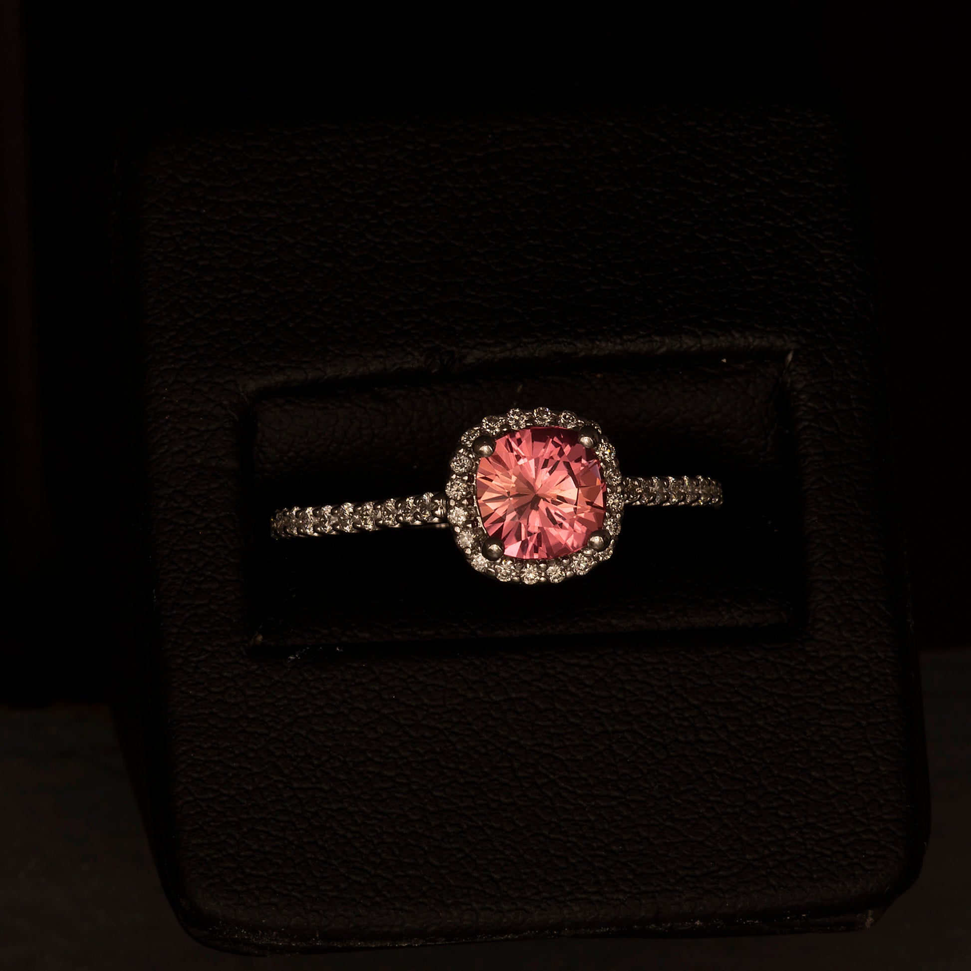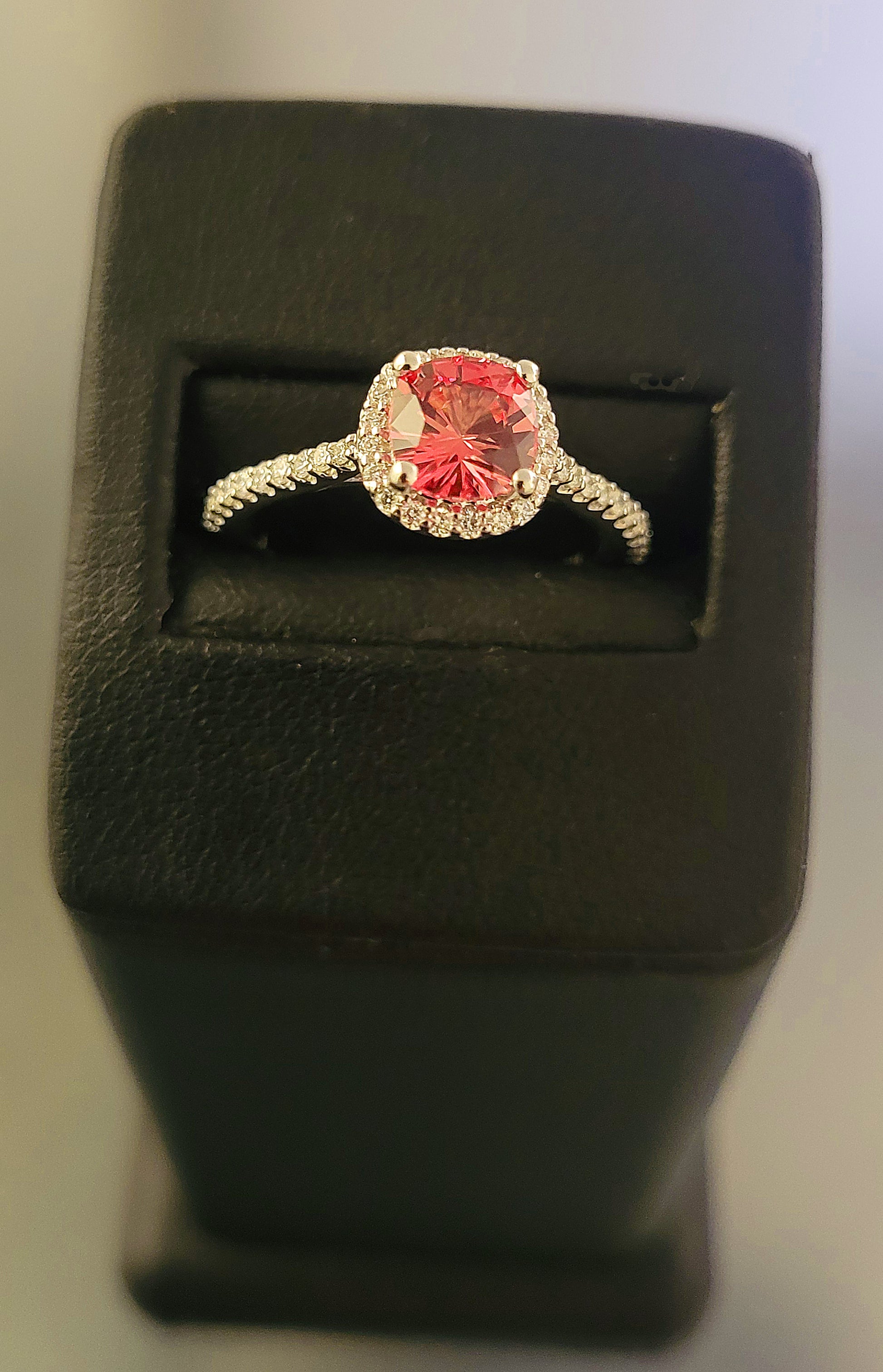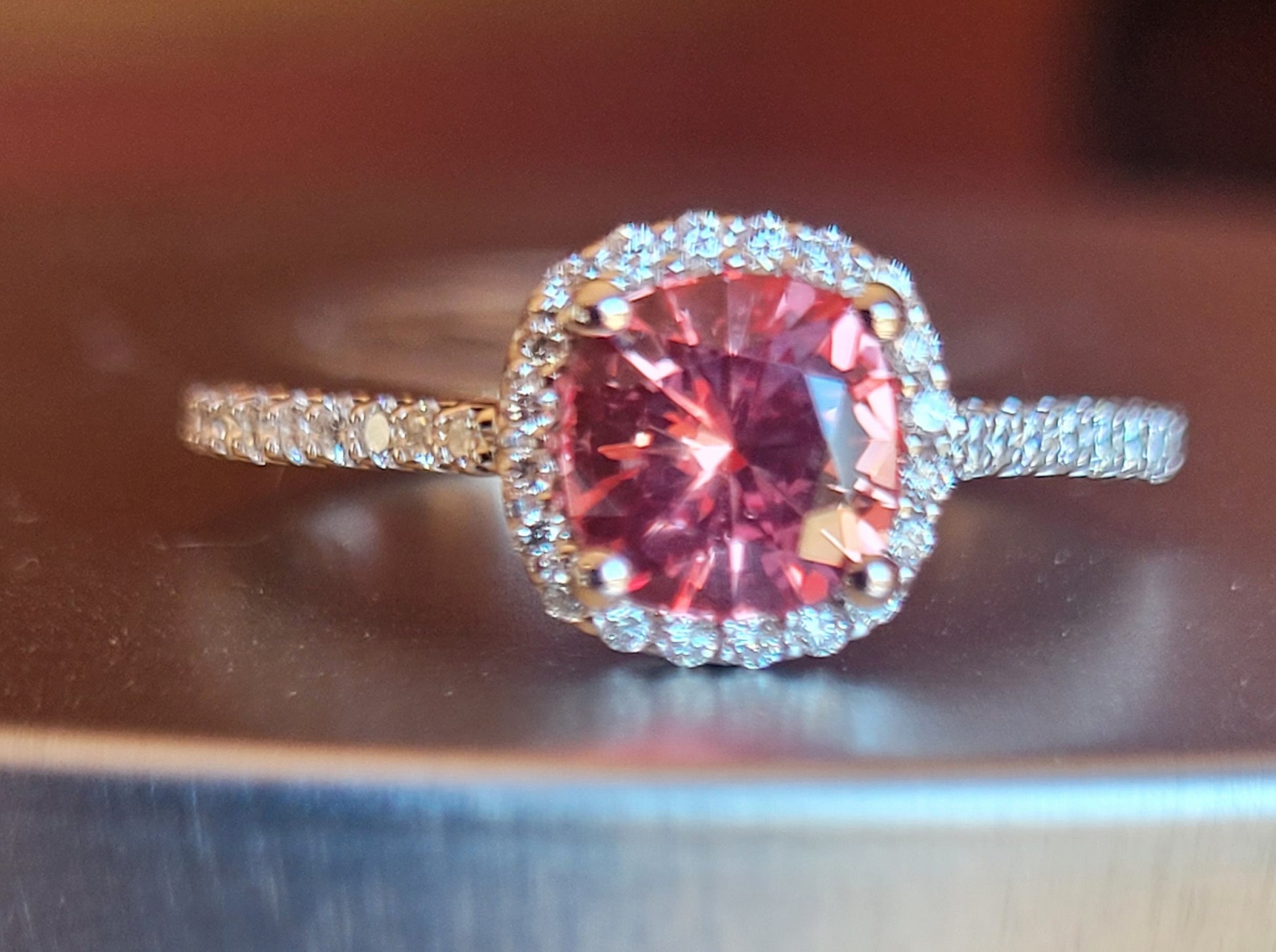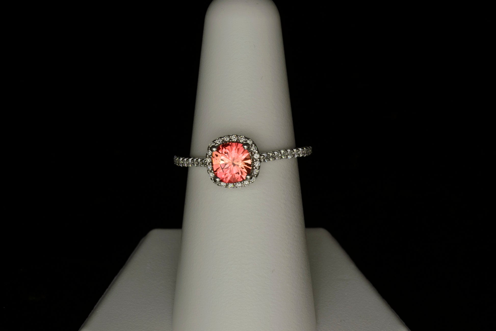 Our Padparadscha sapphire engagement ring features a gorgeous red to pink color change sapphire. The sapphire is Cushion Cut with carat weight of 1.30ct. Our halo engagement ring contains 40 diamonds, diamond carat weight is 1/3 carat. Whether you are looking for a pink sapphire ring, peach sapphire ring, orange sapphire ring you are sure to be pleased with this unique color changing in different light conditions. This is truly a unique engagement ring and a great diamond alternative!