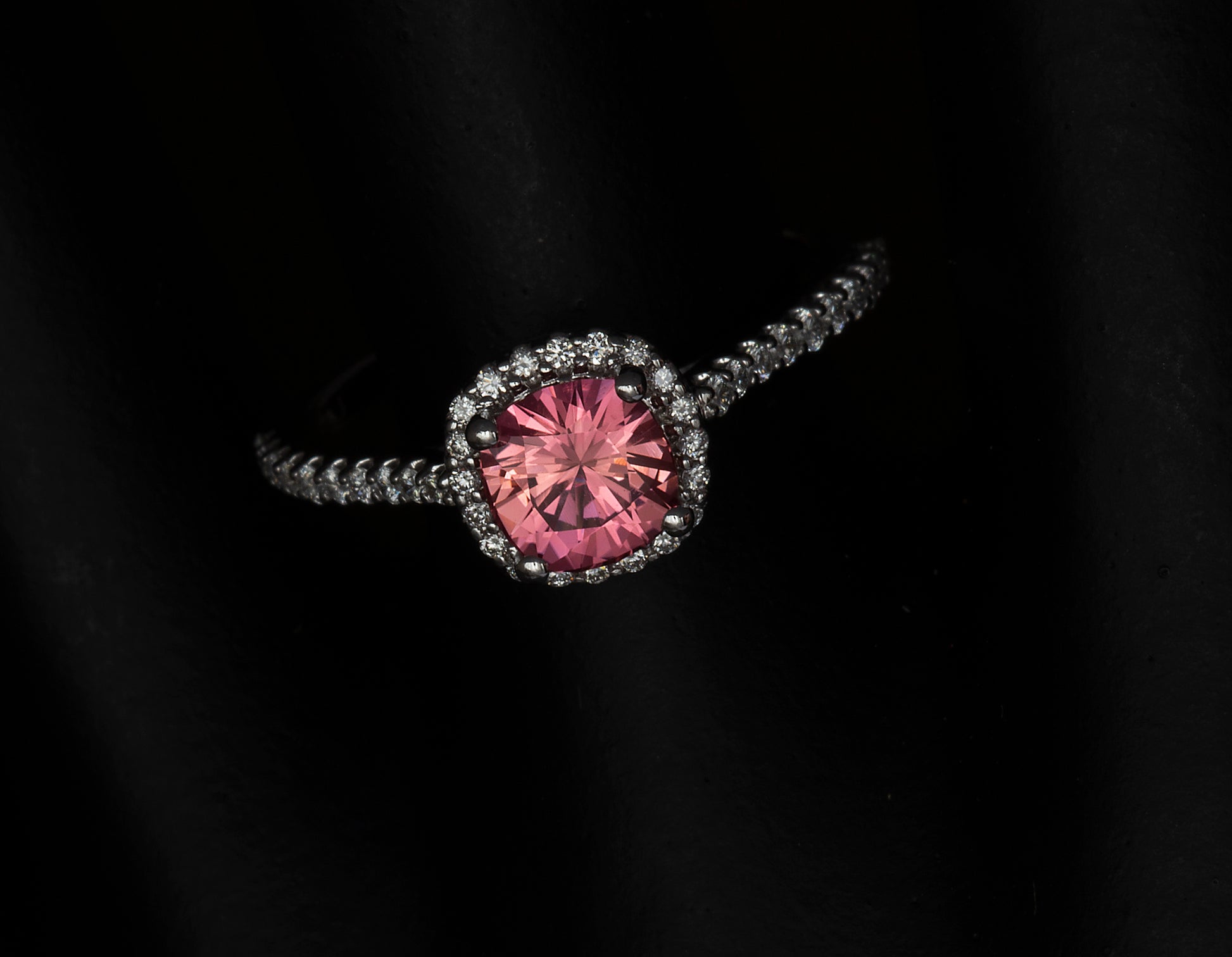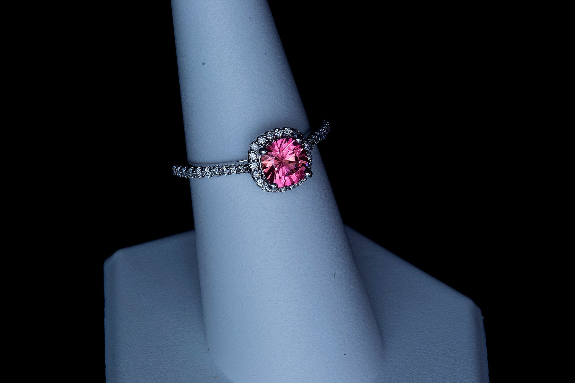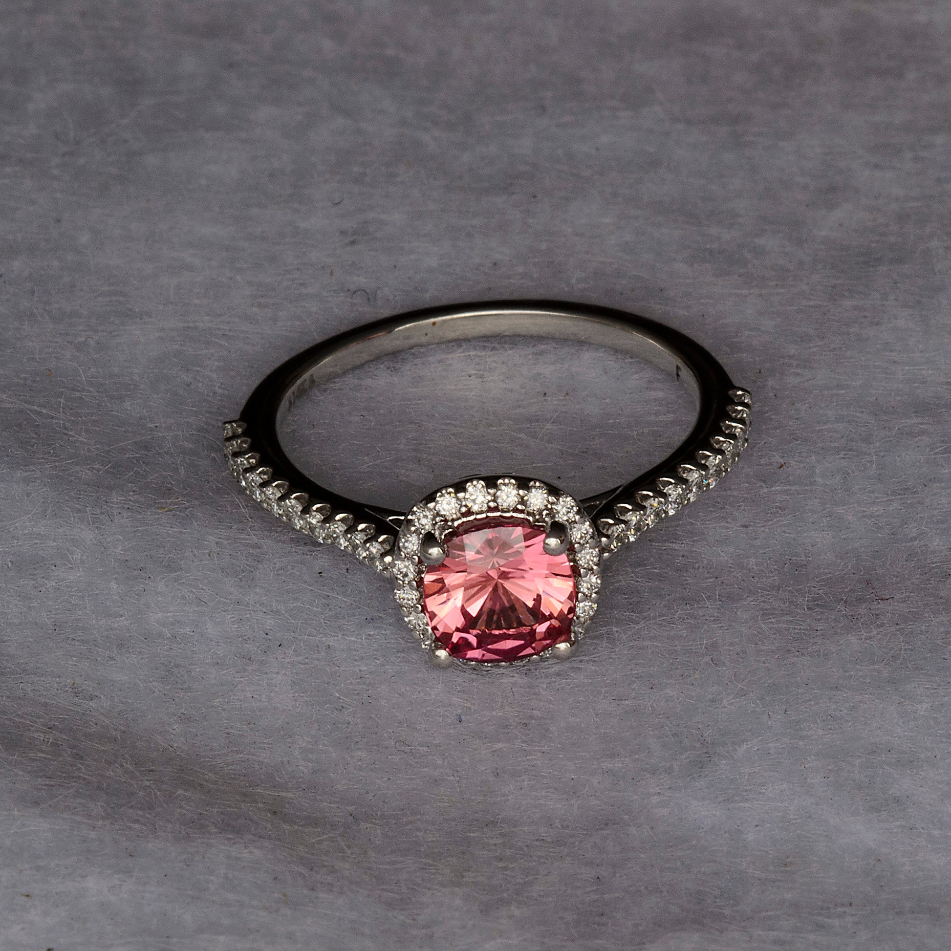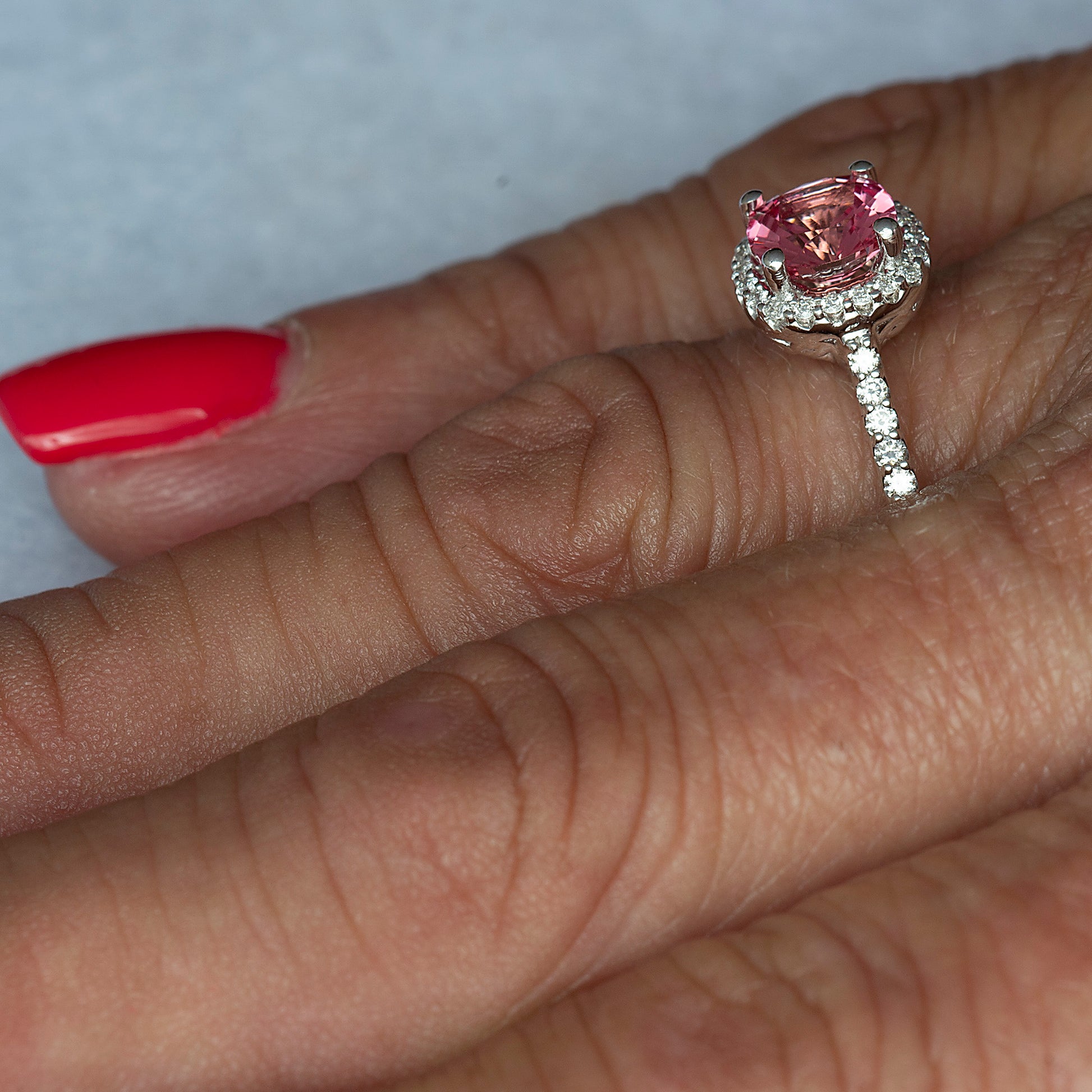 Our Padparadscha sapphire engagement ring features a gorgeous red to pink color change sapphire. The sapphire is Cushion Cut with carat weight of 1.30ct. Our halo engagement ring contains 40 diamonds, diamond carat weight is 1/3 carat. Whether you are looking for a pink sapphire ring, peach sapphire ring, orange sapphire ring you are sure to be pleased with this unique color changing in different light conditions. This is truly a unique engagement ring and a great diamond alternative!