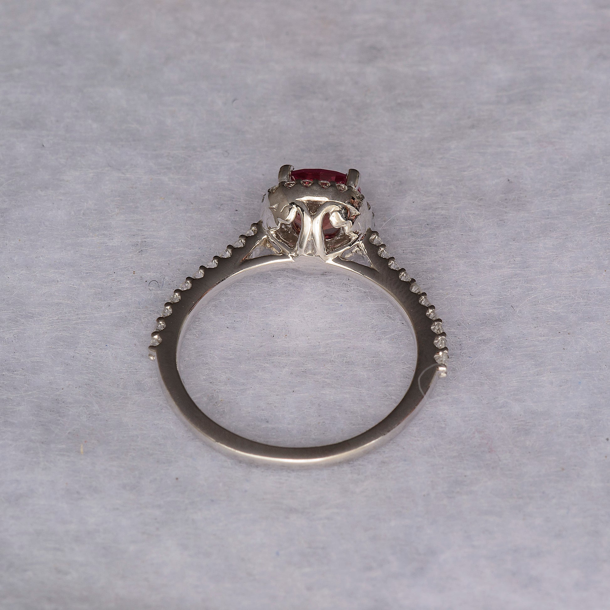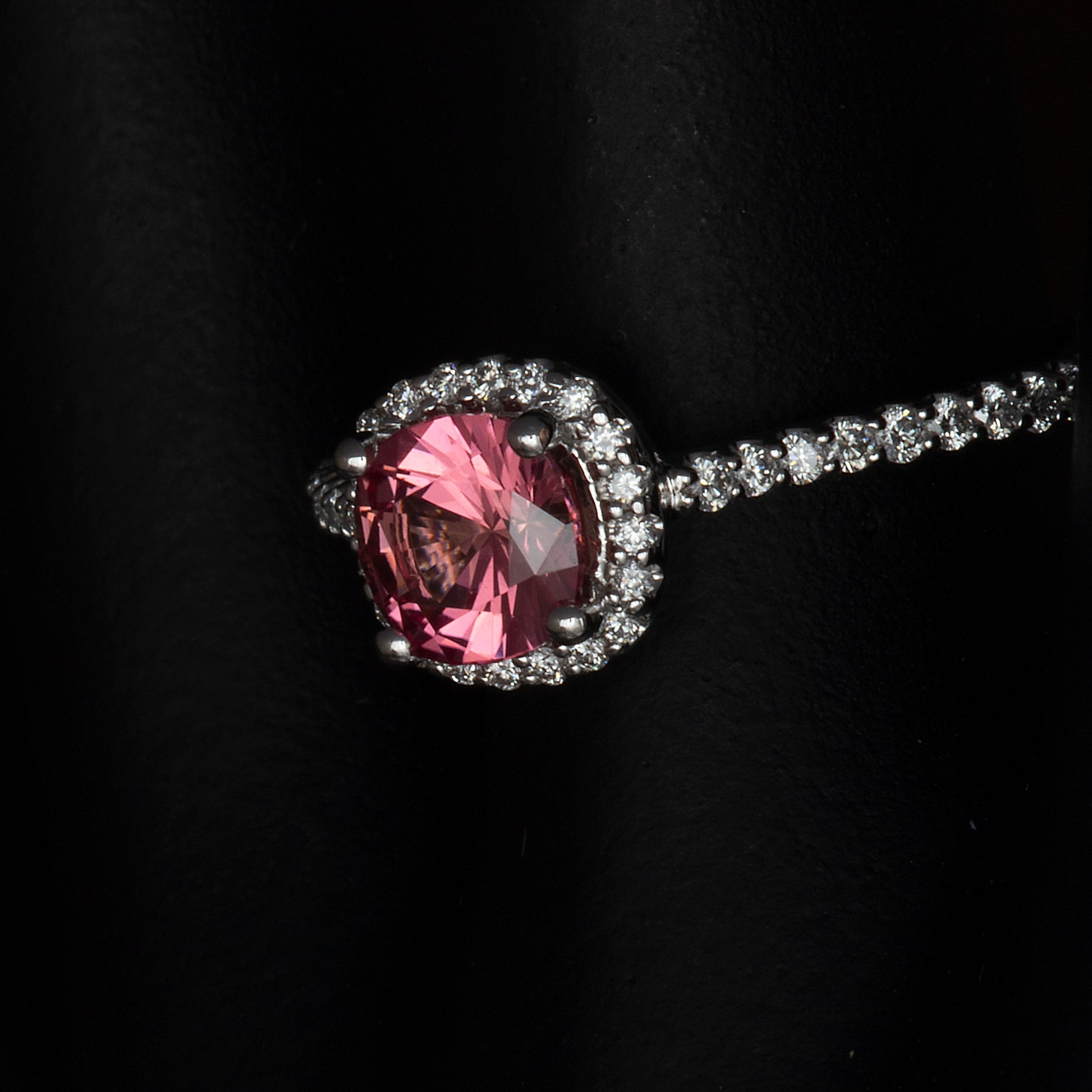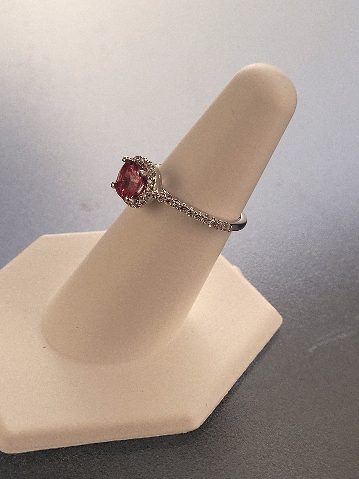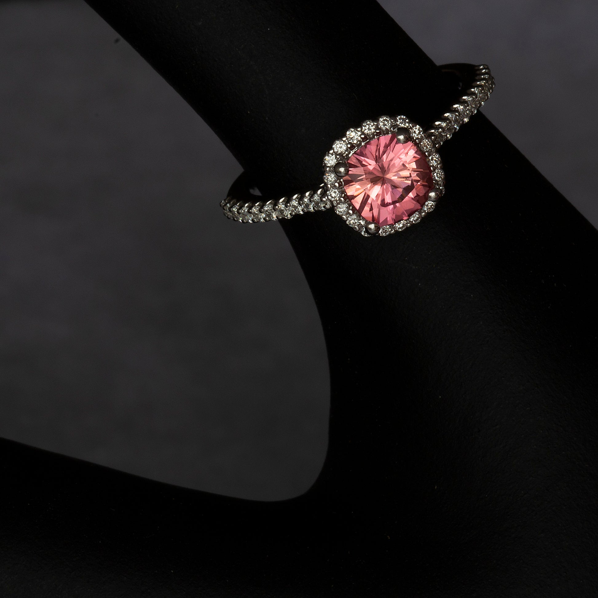 Our Padparadscha sapphire engagement ring features a gorgeous red to pink color change sapphire. The sapphire is Cushion Cut with carat weight of 1.30ct. Our halo engagement ring contains 40 diamonds, diamond carat weight is 1/3 carat. Whether you are looking for a pink sapphire ring, peach sapphire ring, orange sapphire ring you are sure to be pleased with this unique color changing in different light conditions. This is truly a unique engagement ring and a great diamond alternative!