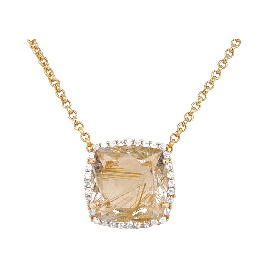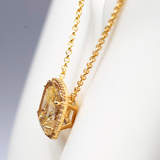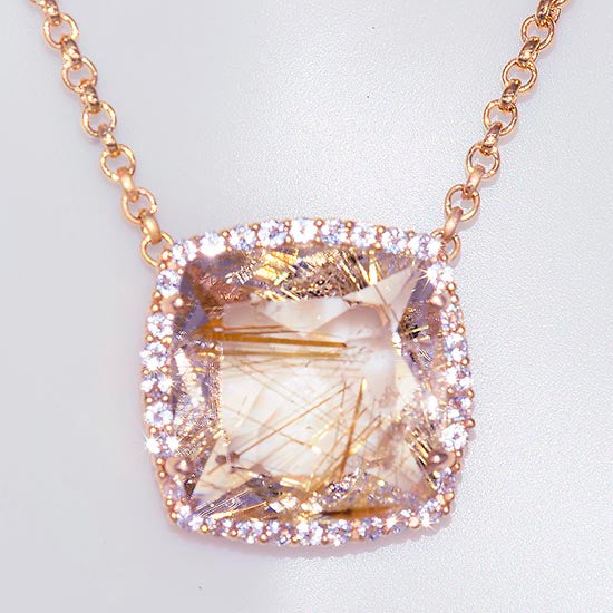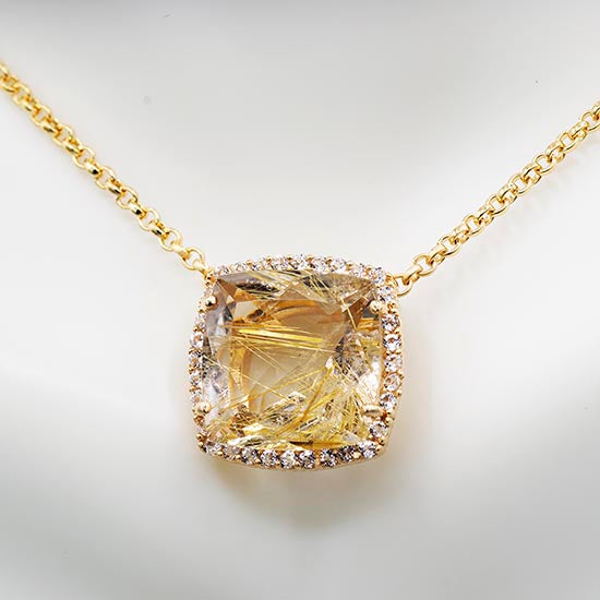 Very popular and valuable due to the scarcity of good cutting material, the inclusions seen in Rutilated Quartz are prized since each stone is unique in its display of needle like inclusions. Our statement necklace features a large specialty cushion cut gem, bordered by white topaz accent stones. The setting is open all the way around the gem for light reflection and ease of cleaning. 18-inch chain with lobster claw clasp will keep this beauty secure. A beautiful gift in a classic evergreen style! • 18K Yellow Gold Vermeil over 925 Silver - 4.7 grs • Cushion cut Rutilated Quartz - 17.7 carats • 41 White Topaz round gemstones 1.0 mm diamond cut • Pendant diameter: .50” X .50” |