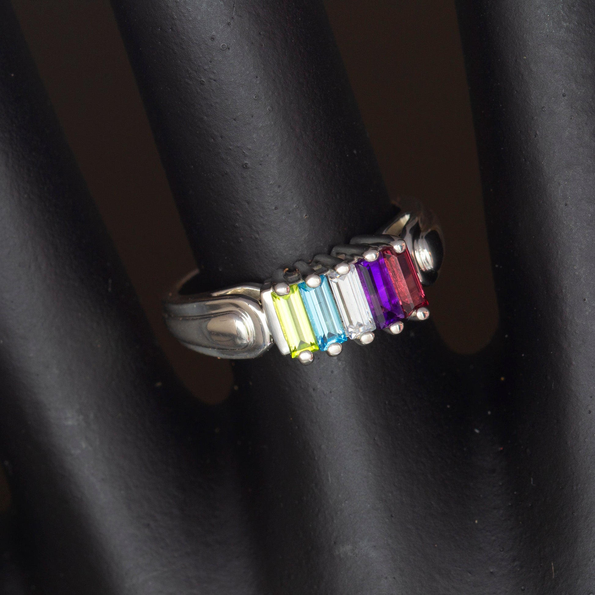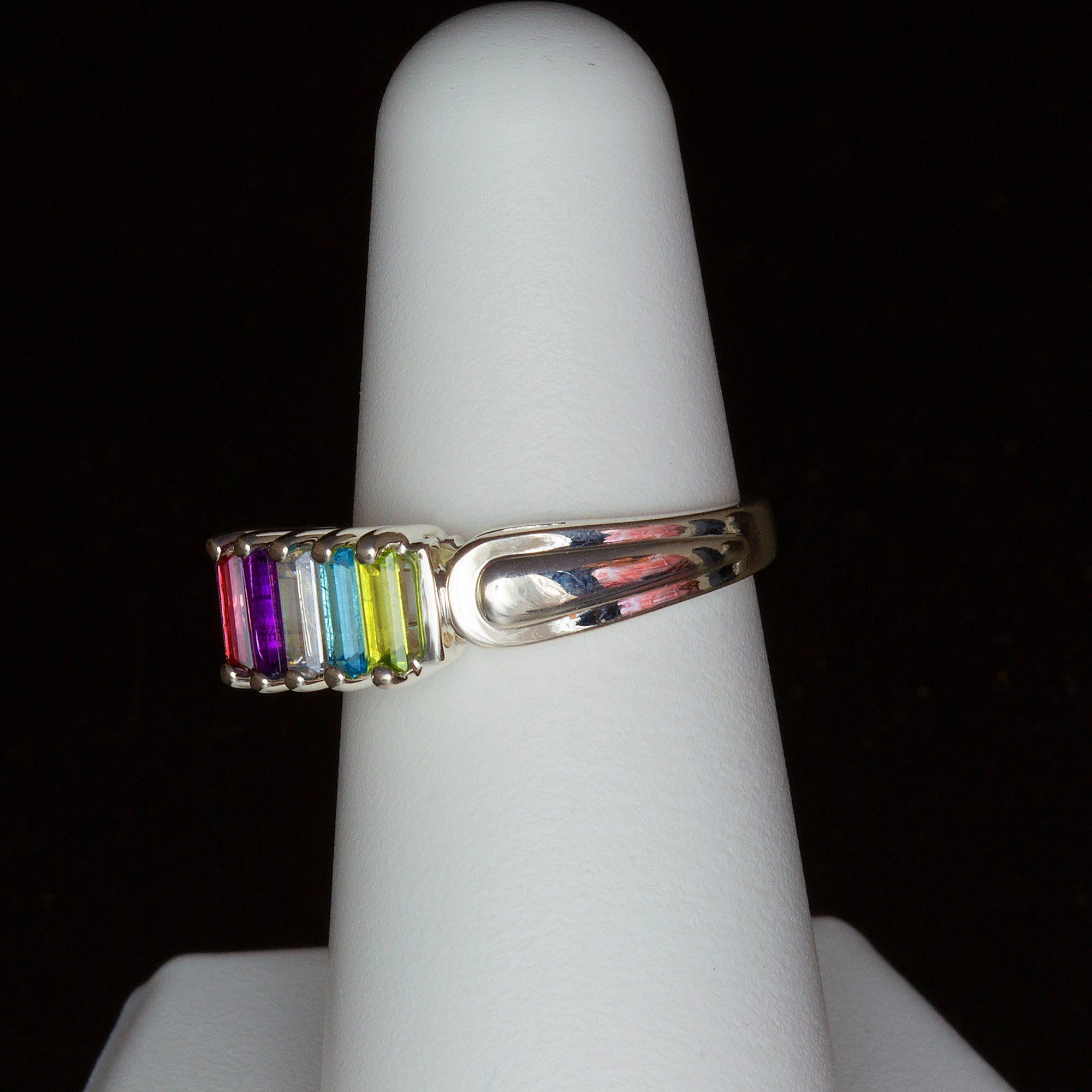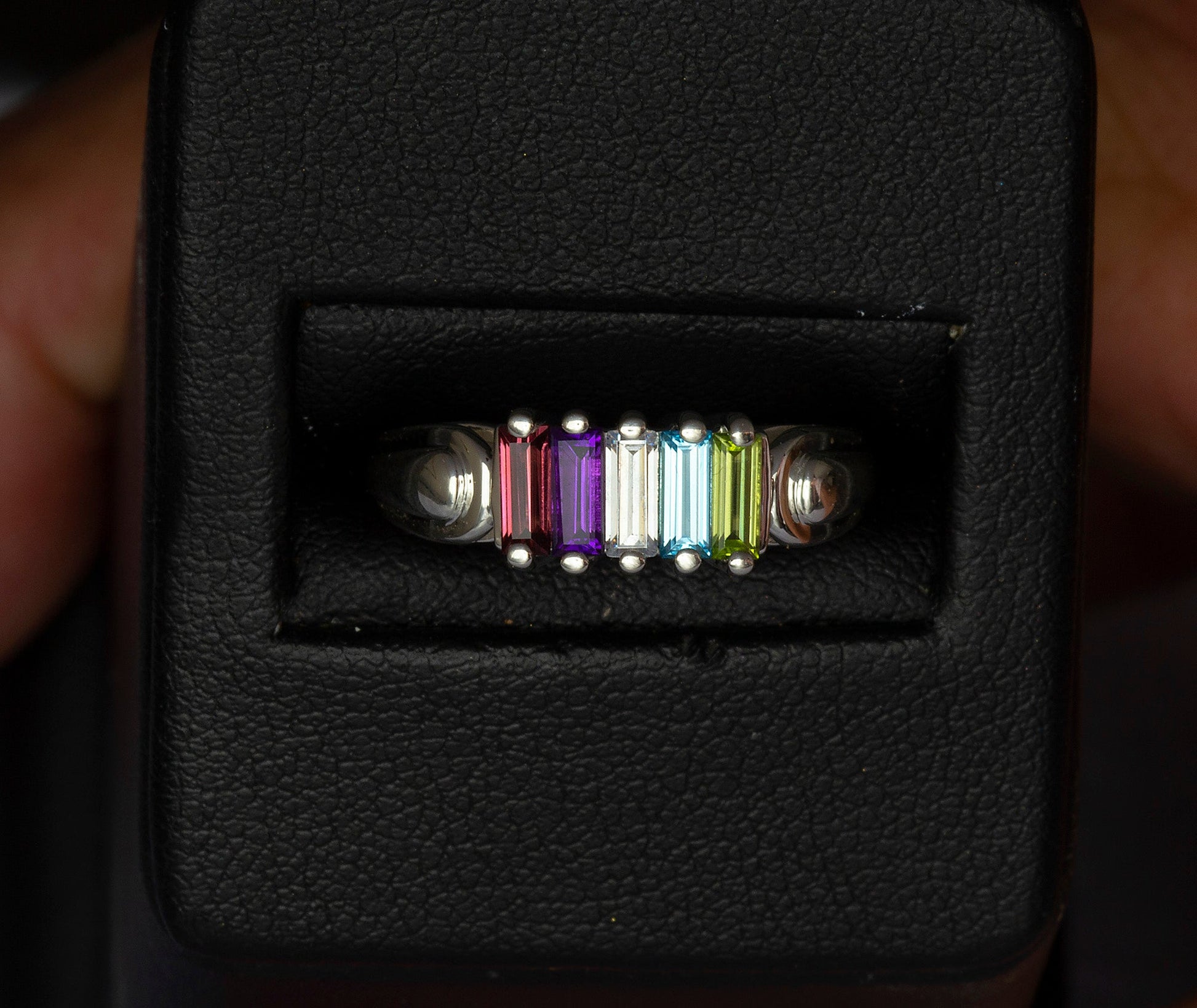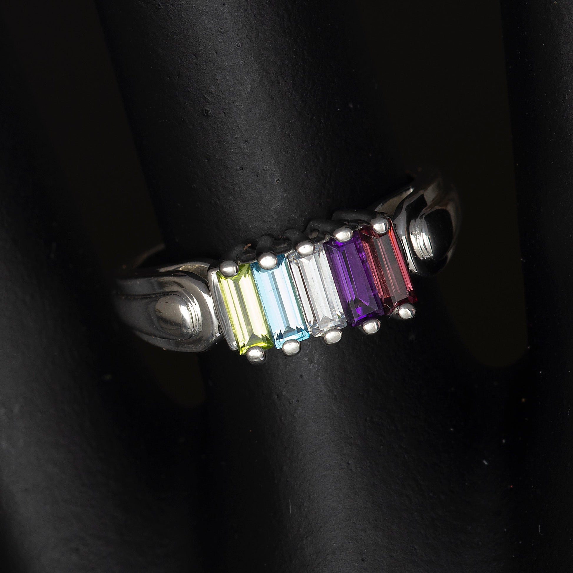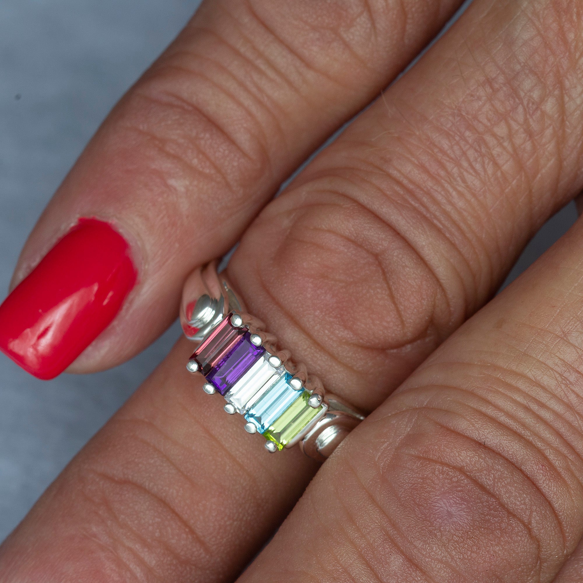 14k gold baguette ring is a modern Mothers ring and family birthstone ring. Our multi gemstone ring or cluster ring features 5) 5 X 2mm gemstones in the baguette cut for a sleek design and modern take on the traditional Mothers ring. Our birthstone ring is a great birthday gift for Mom or Grand-mom. It's also a beautiful and colorful gemstone ring for a pop of color for anyone. We are showing as a Mothers ring 5 stone version; however, we make this from two stones to six stones.