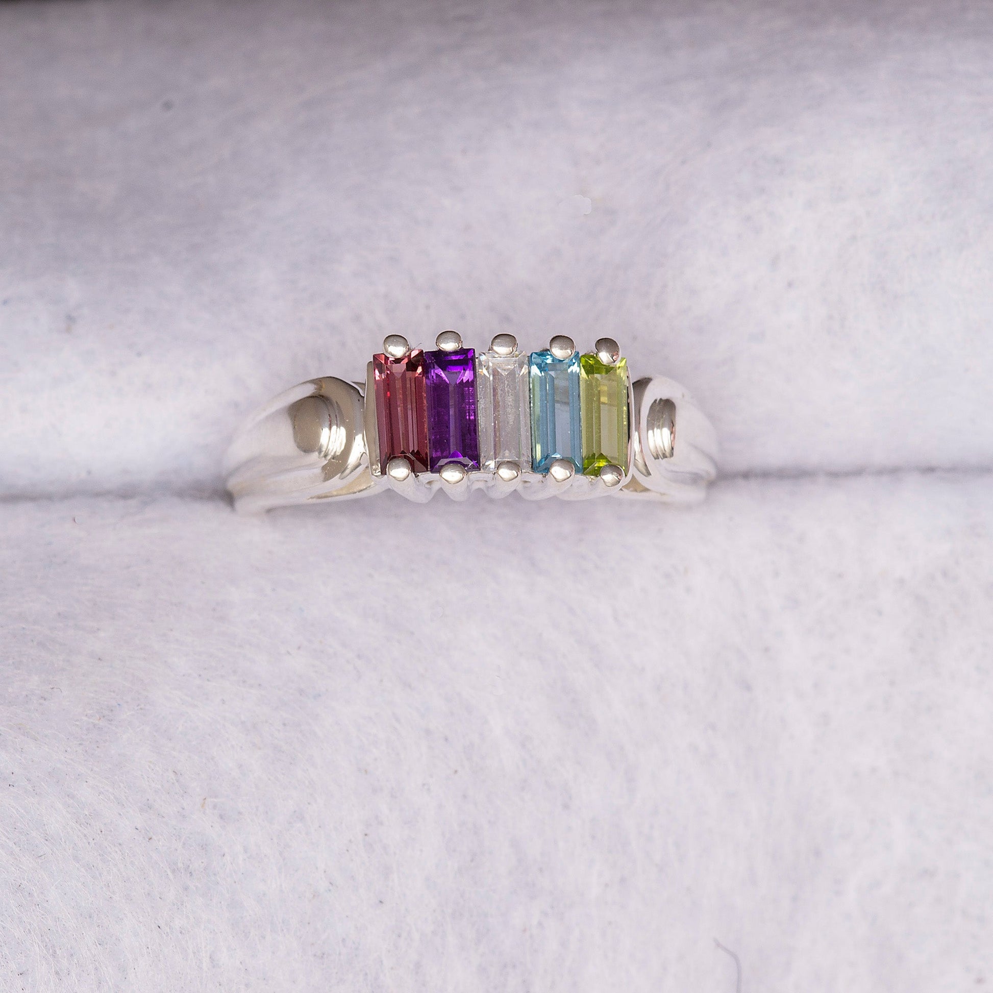 14k Gold Baguette Ring, Unique Mothers Ring 5 Stone, Meaningful gift for her