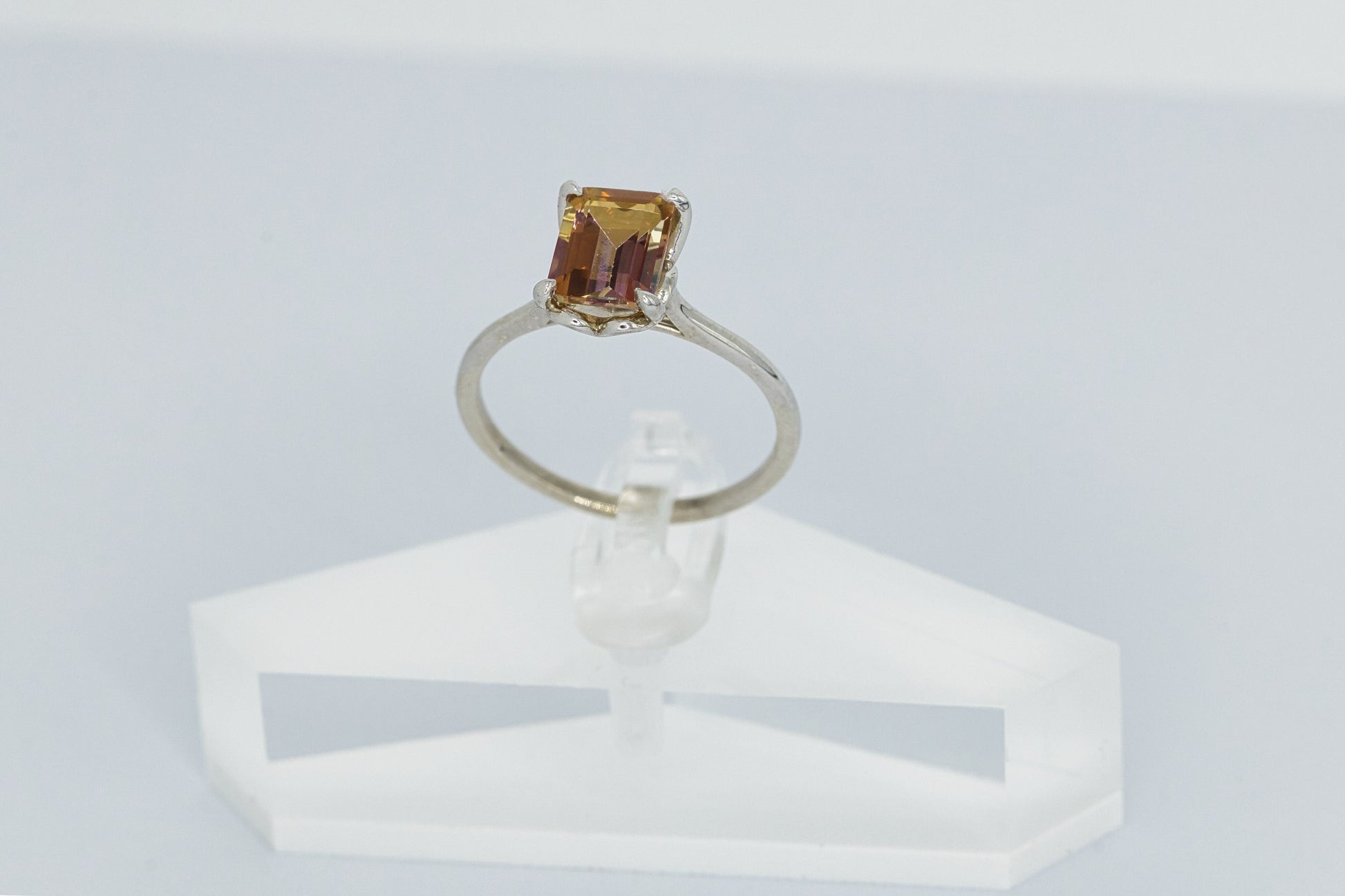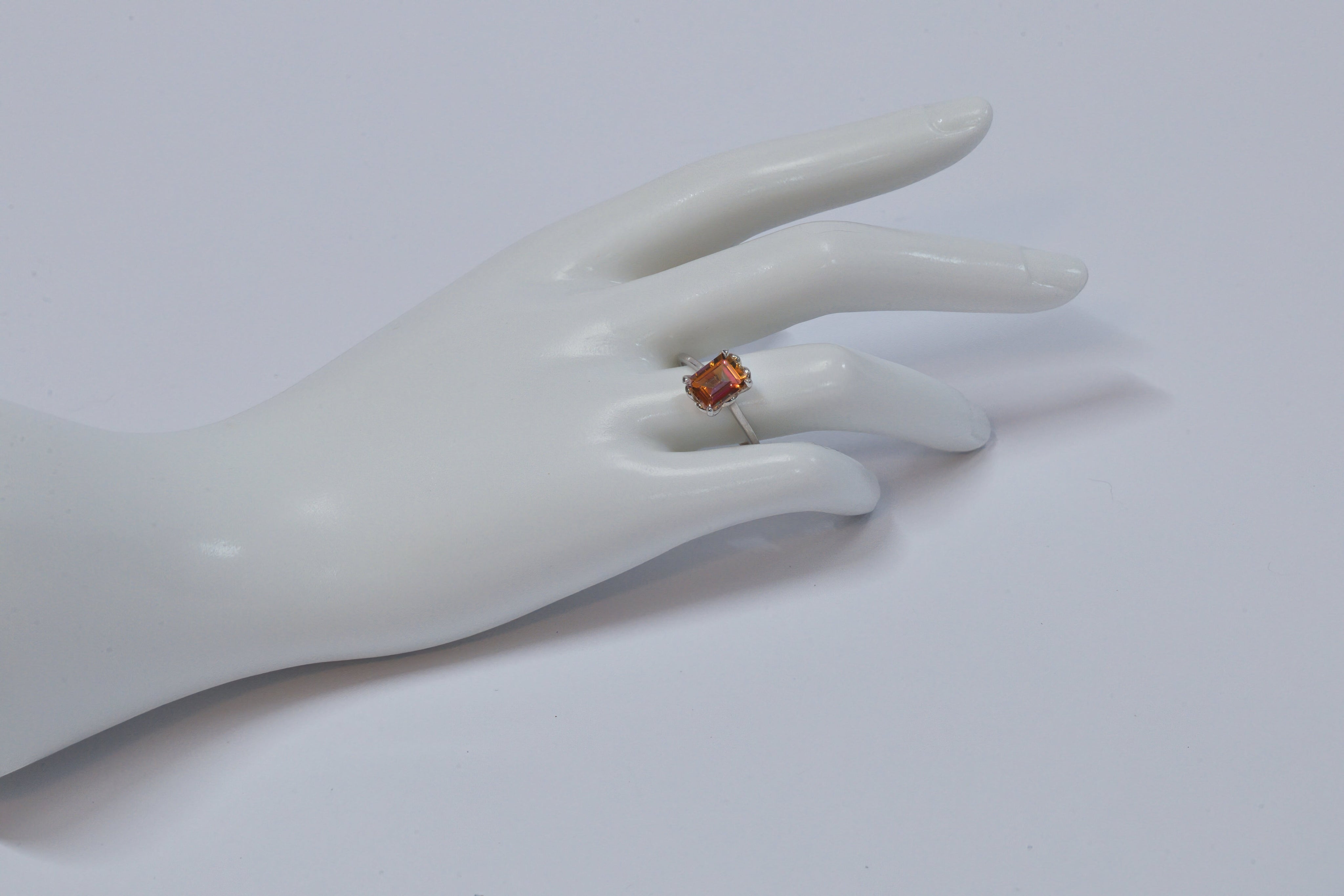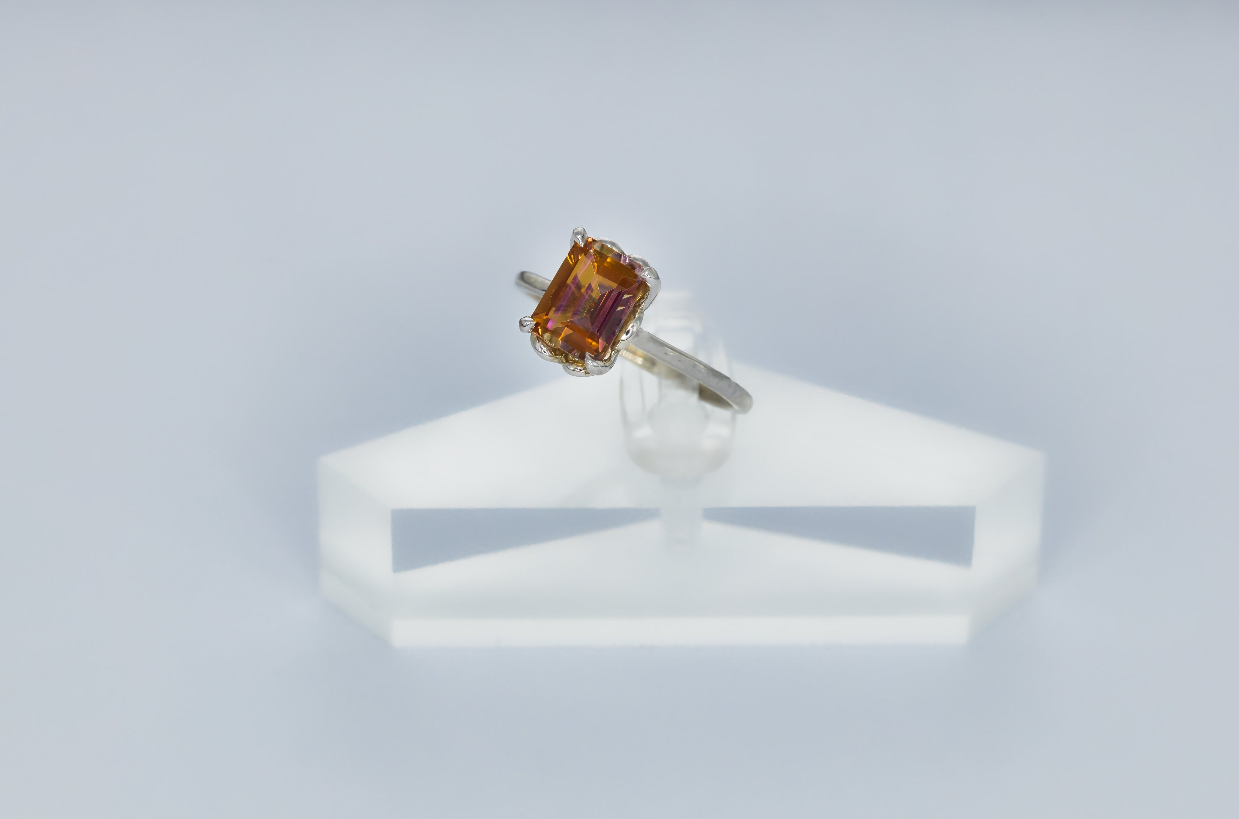 Our 2 carat Sunrise Mystic Topaz silver engagement ring features a beautiful emerald shape gemstone making this a very unique engagement ring! The ring setting features hidden hearts cut outs in the metal for a very meaningful way to express your love. This stone displays nice color saturation.