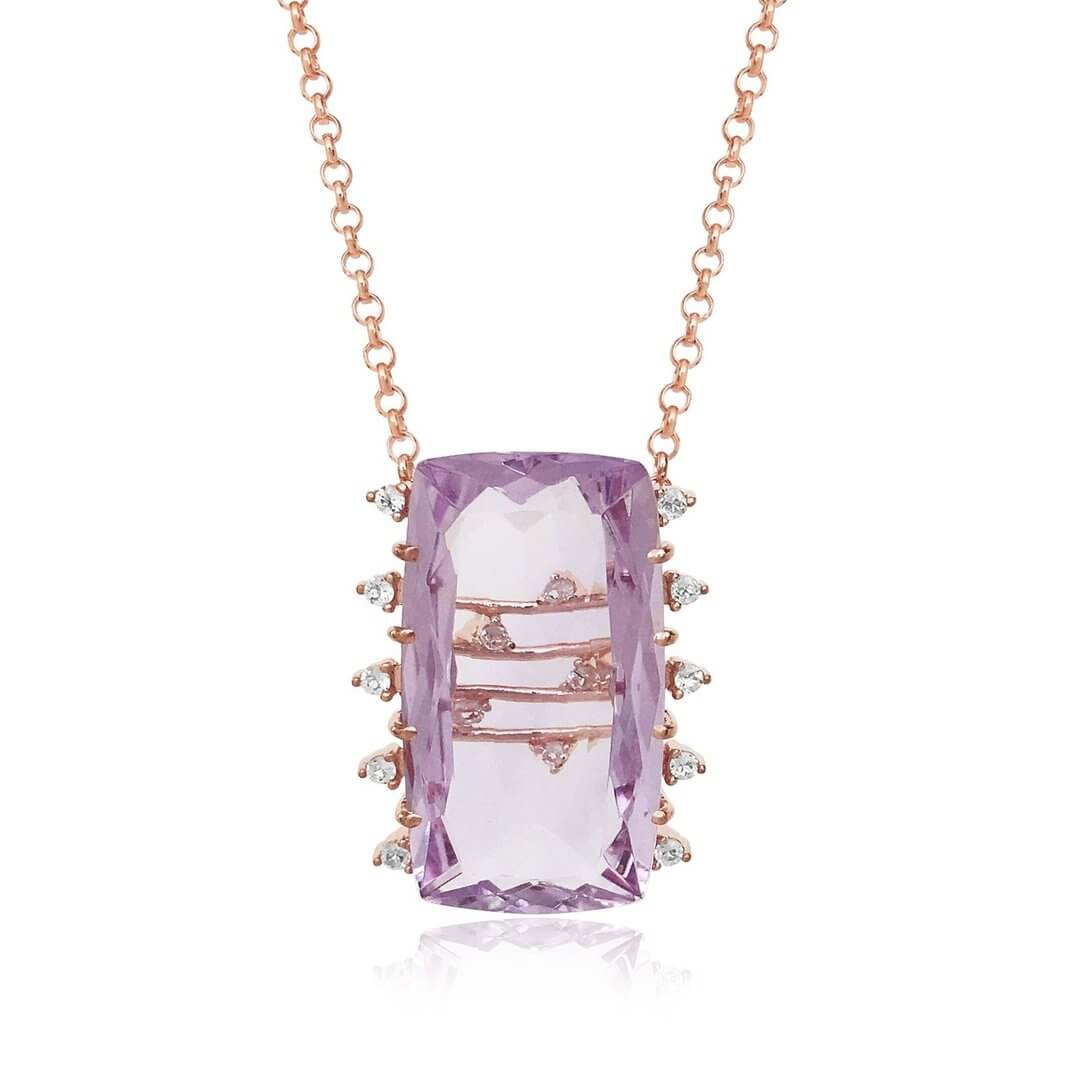 Transparenza is Spanish for transparent. Unique genuine pink amethyst gemstone is transparent in the center to reveal the surprise of horizontal bars with white topaz accent stones, for a truly unique necklace! If you are looking for something different...look no further! The specialty cut rectangular stone is also accented with 5 white topaz gems on each side. Includes an 18” chain. The metal is rose gold vermeil. Vermeil is sterling silver plated with 18kt rose gold. This is stunningly beautiful! ♡ SPECIFICS: |