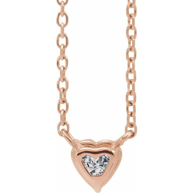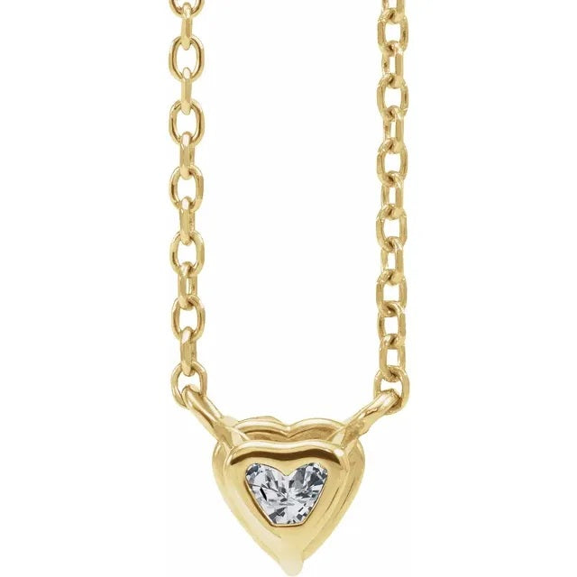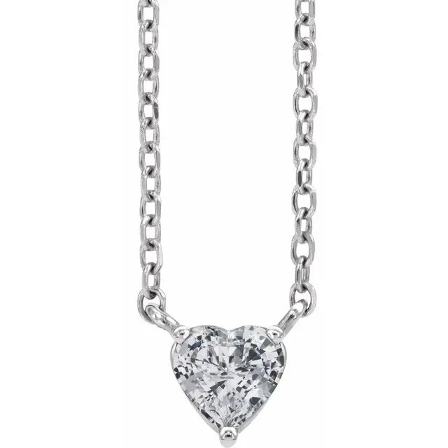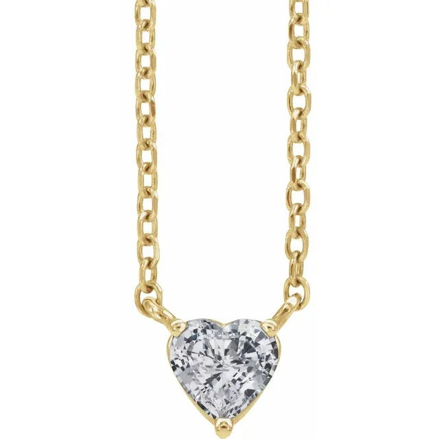 14k gold or sterling silver white sapphire heart necklace, features a faceted white sapphire pendant. Sapphire jewelry is always very popular & white sapphire is a great & affordable diamond alternative. The style is a dainty necklace design that is a classic, evergreen style. Perfect everyday necklace! The heart setting has minimal metal for a clean and modern look. A meaningful girlfriend gift and loved one gift. The 1mm cable chain us adjustable from 16 to 18 inches and is finished with a lobster claw clasp for security.